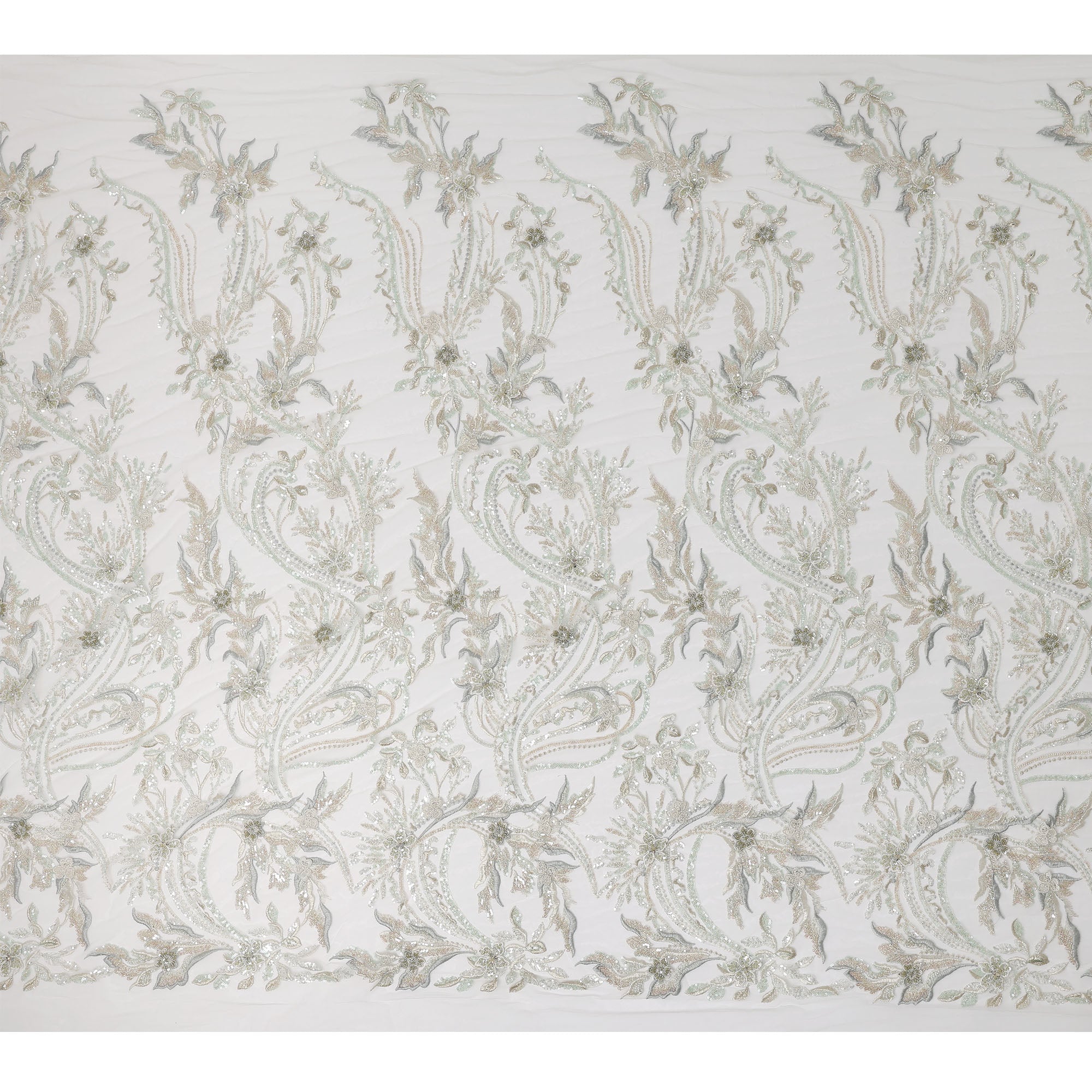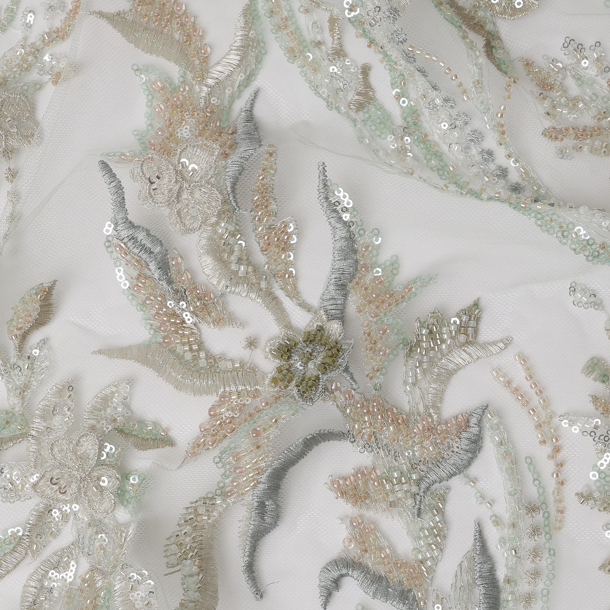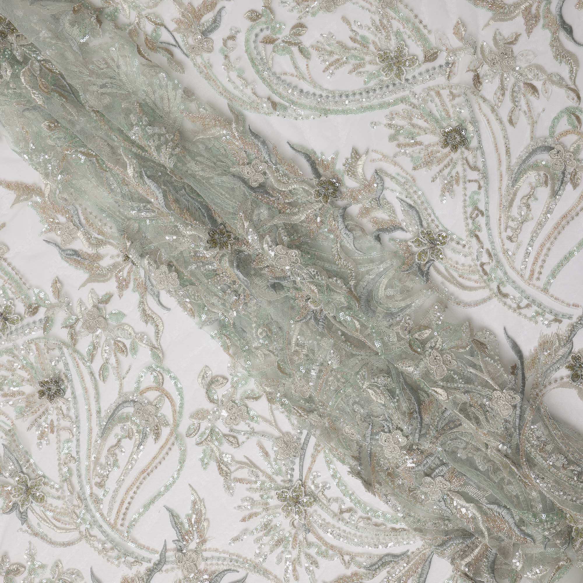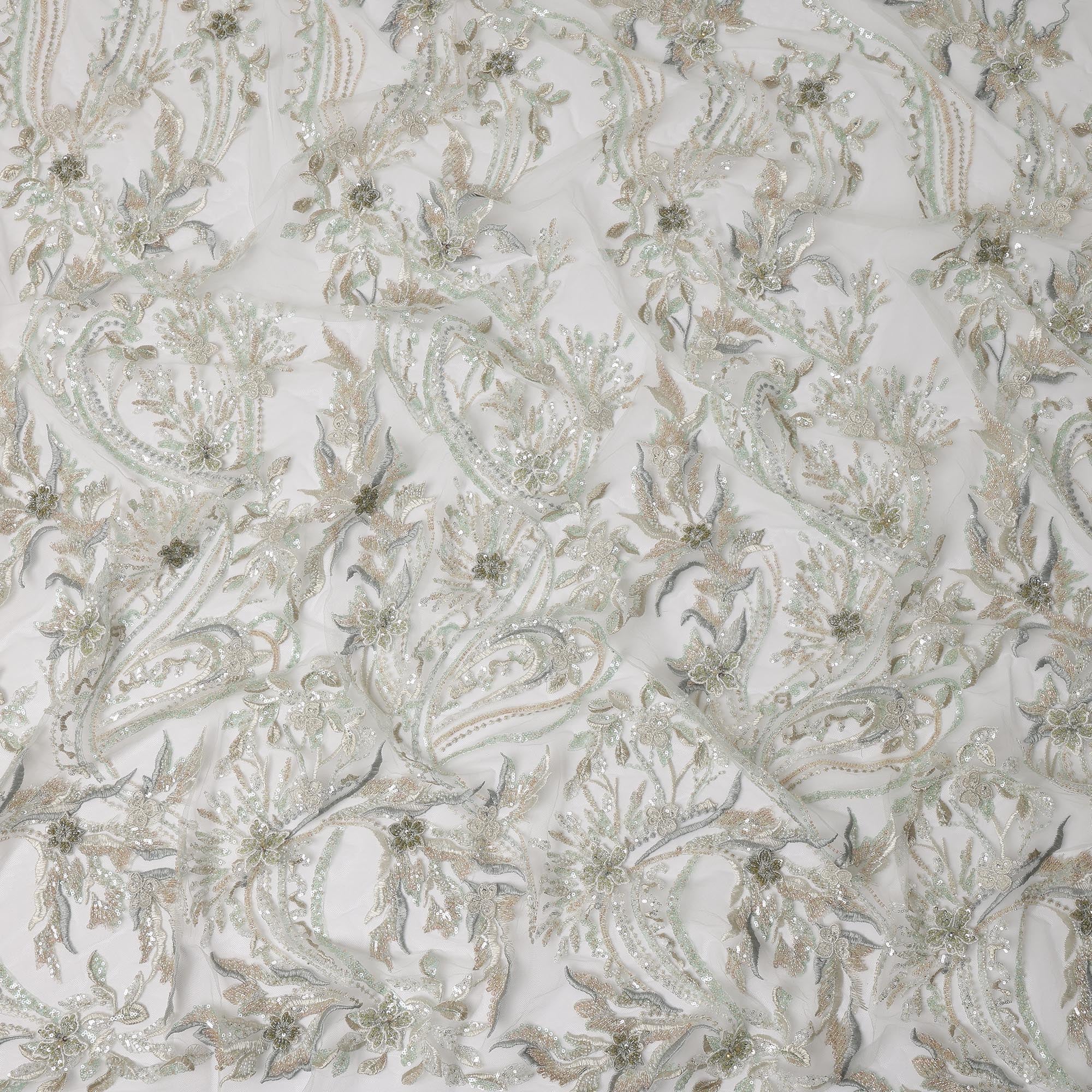 This exquisite ivory nylon tulle embroidery fabric features a luxurious blend of multi-tone floral and vine motifs, intricately crafted with shimmering sequins and detailed threadwork that add depth, richness, and an elegant sheen. The soft ivory base enhances the layered embroidery, creating a sophisticated, ethereal look ideal for bridal wear, couture gowns, reception outfits, and high-fashion ensembles. Its premium tulle construction offers a graceful, fluid drape while maintaining structure, making it a perfect choice for designers who want to buy online or shop online for refined embroidered fabrics. With its intricate craftsmanship, delicate sparkle, and timeless elegance, this fabric stands out for creating opulent custom-made garments that demand artistry and finesse.