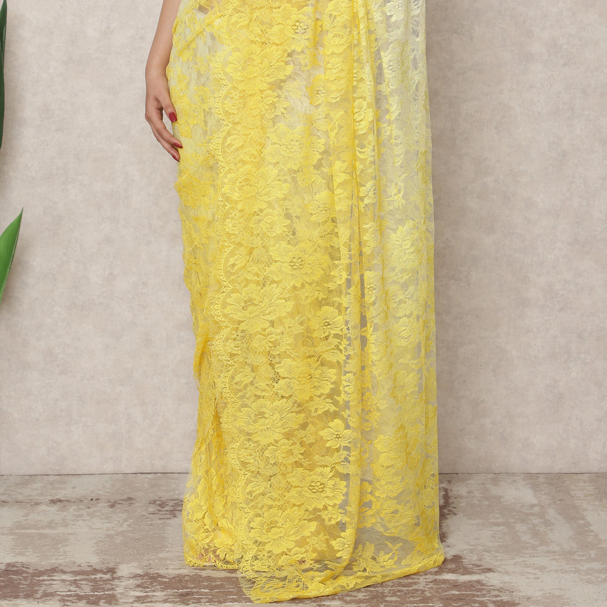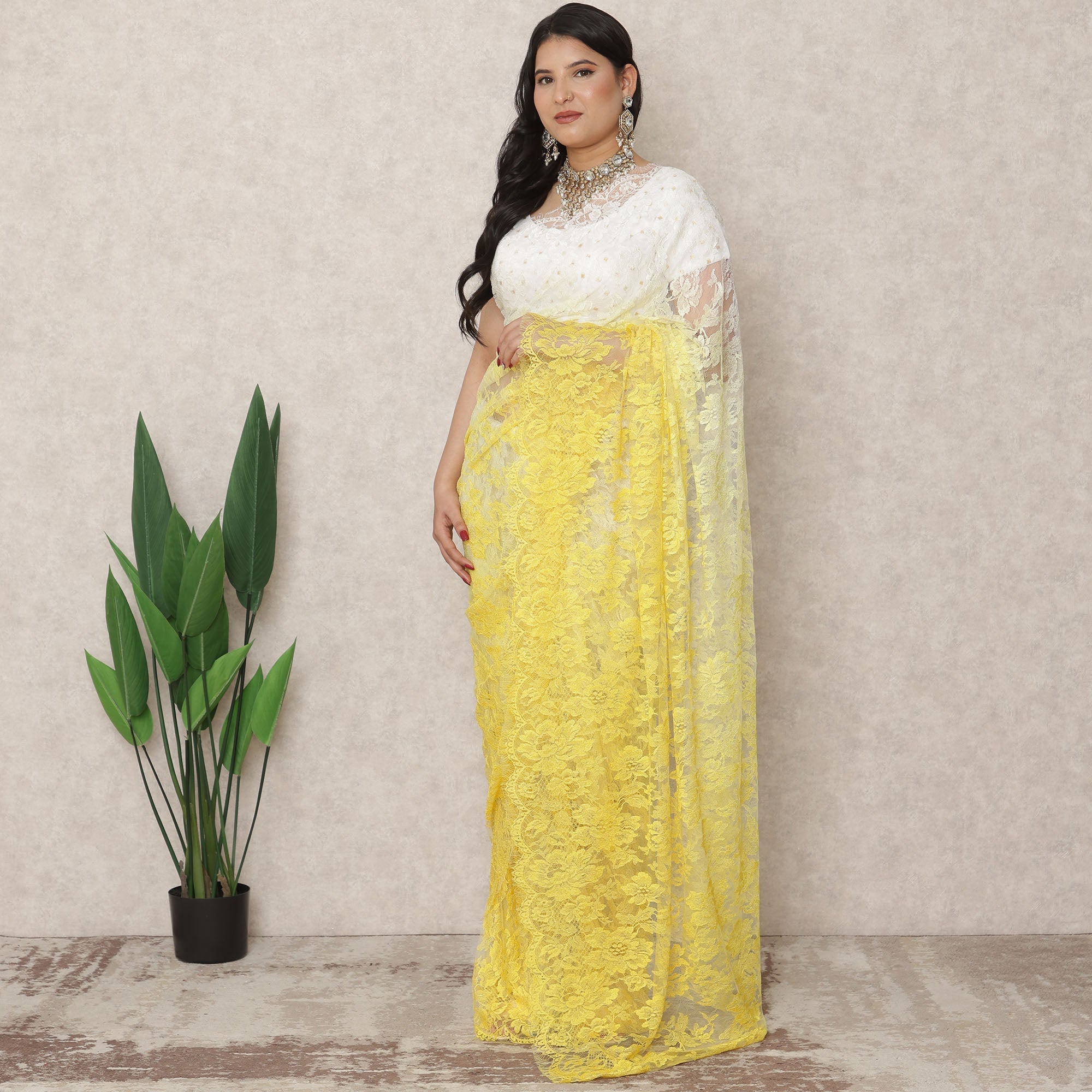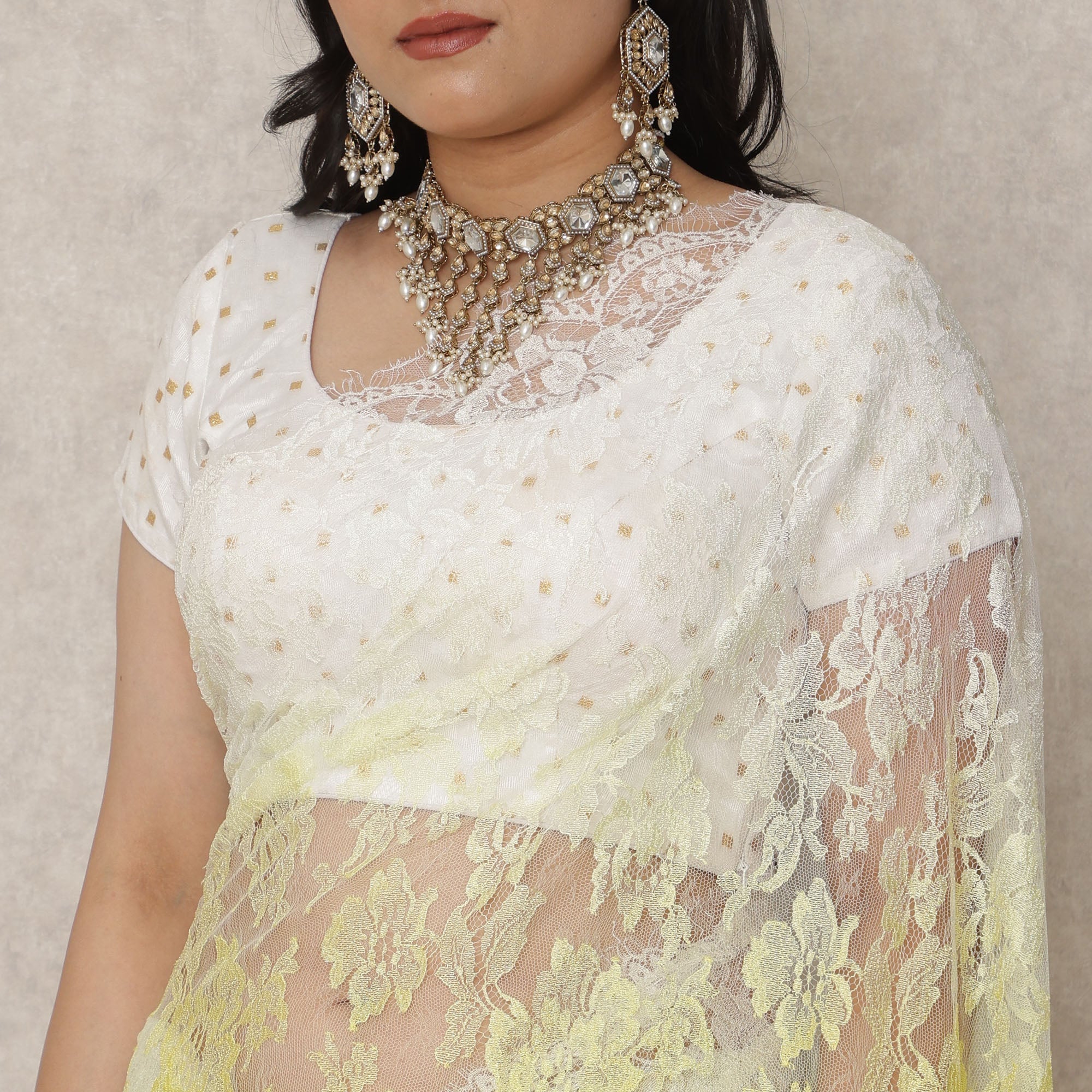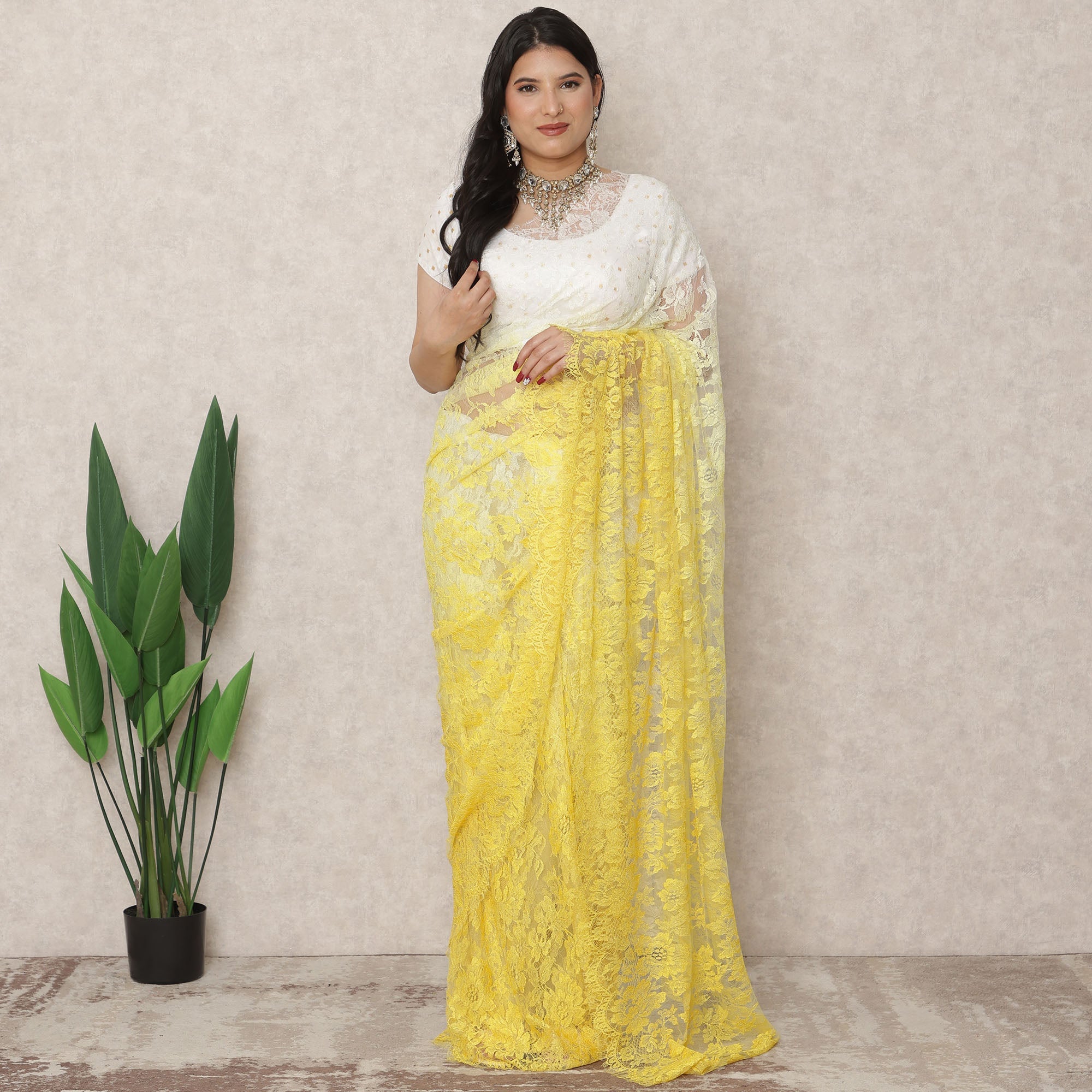 أضفي لمسةً من الرقي والأناقة إلى خزانة ملابسك التقليدية مع هذا الساري ذي اللون العاجي والأصفر الفاتح، والمصنوع بإتقان في فرنسا من دانتيل شانتيلي الفاخر الذي يشع بالأناقة والرقي. يُضفي هذا الانتقال الدقيق من العاجي الناعم إلى الأصفر النابض بالحياة تأثيرًا منعشًا ومنعشًا، مثاليًا للاحتفالات النهارية أو احتفالات الهالدي أو الاحتفالات المبهجة. يبلغ طول هذا الساري حوالي 5.5 متر وعرضه 110 سم، ويوفر قماشًا سخيًا لستائر مصممة بشكل جميل تُكمل كل من الأشكال التقليدية والحديثة. تضيف تفاصيل الدانتيل الزهرية سحرًا خالدًا، بينما يضمن الملمس المريح للدانتيل السهولة والراحة طوال فترة الارتداء. على الرغم من أنه لا يتضمن قطعة بلوزة، إلا أن لوحة الألوان ثنائية اللون متعددة الاستخدامات تسمح بالاقتران بسهولة مع البلوزات المتباينة أو المزخرفة. يُعد هذا الساري، الذي يُعد احتفالًا بالحرفية الفرنسية الراقية والنعمة الهندية، خيارًا مضيءًا للمناسبات الخاصة. اشتري عبر الإنترنت الآن وتسوق عبر الإنترنت لتستمتع بالحيوية والأناقة التي توفرها هذه التحفة الفنية المستوحاة من الأزياء الراقية.