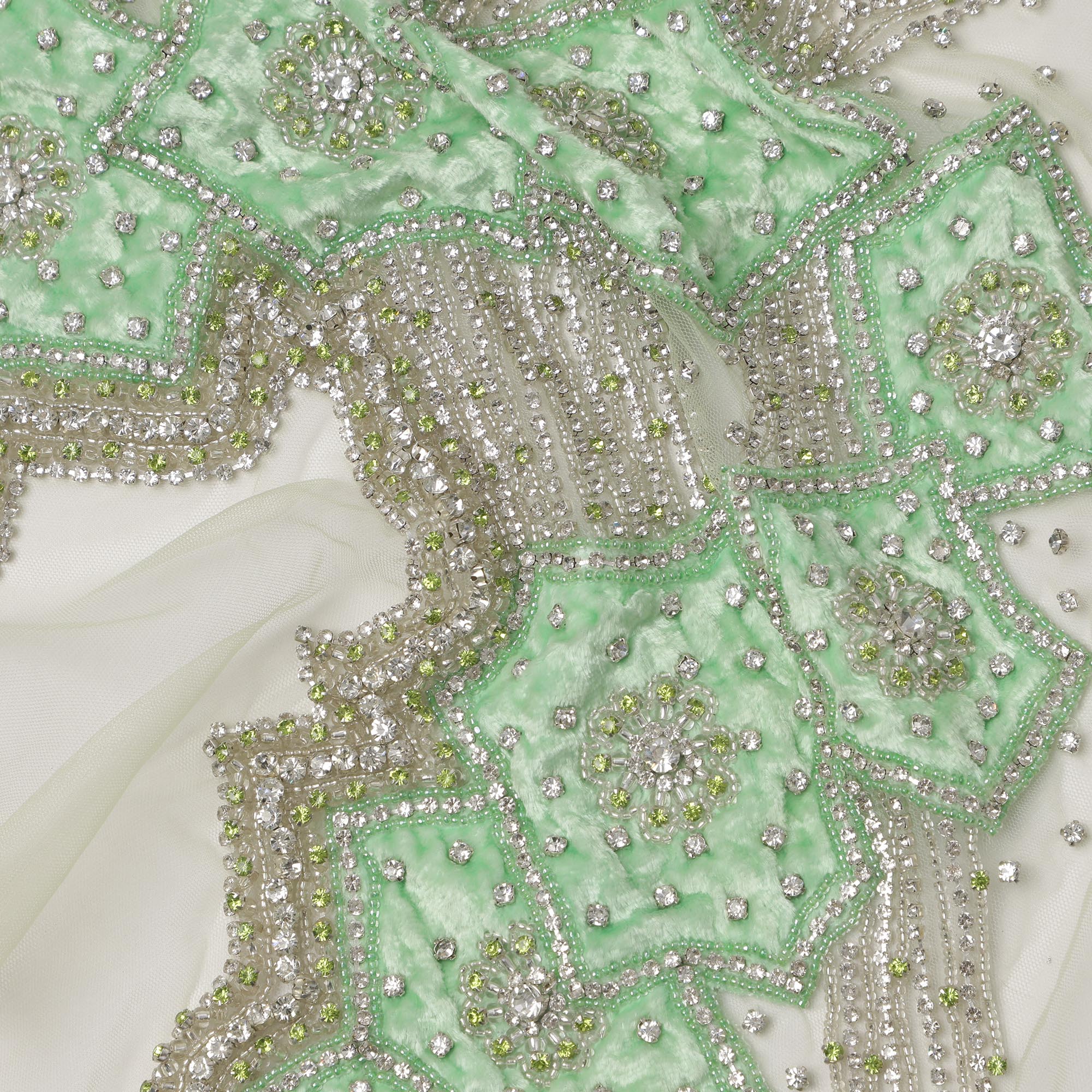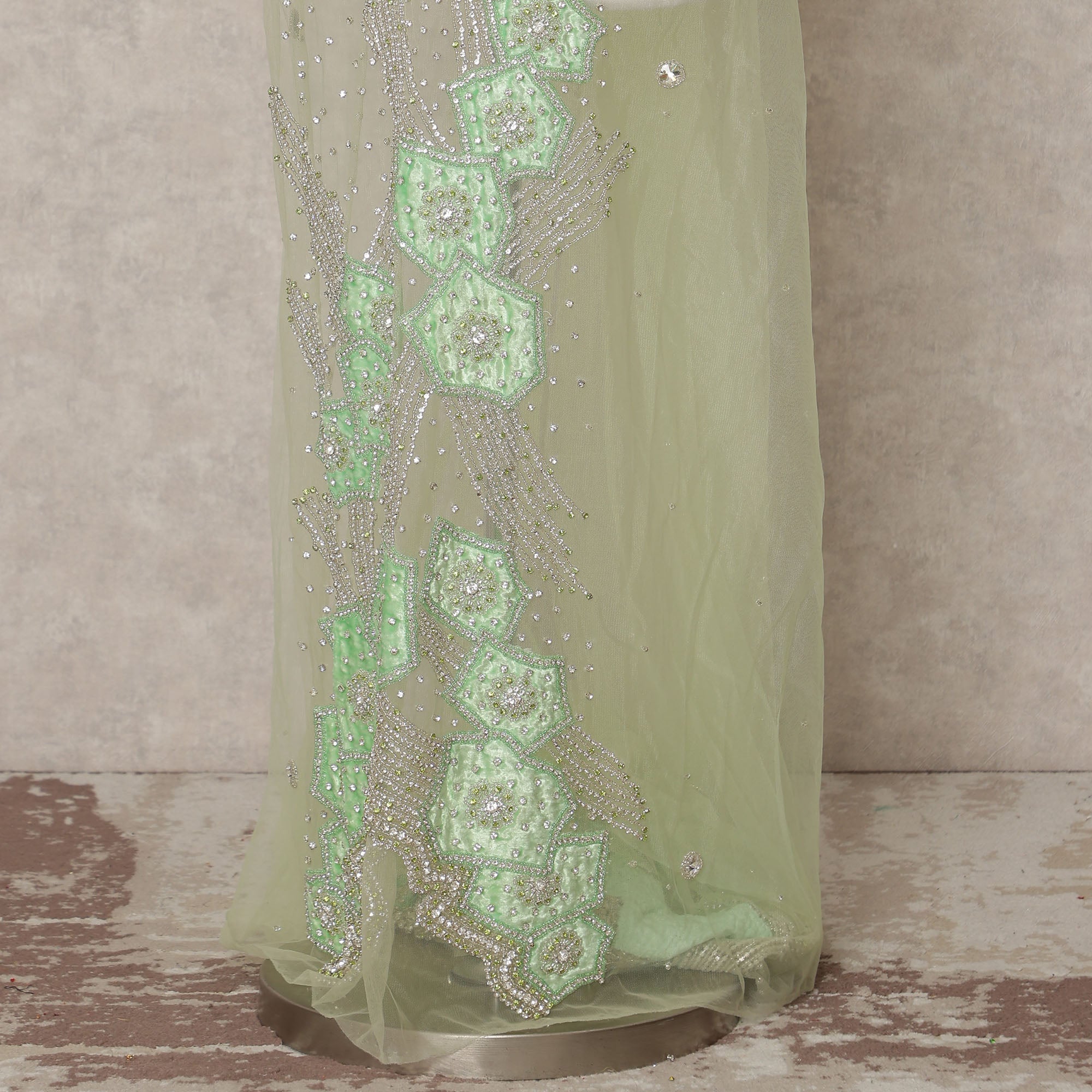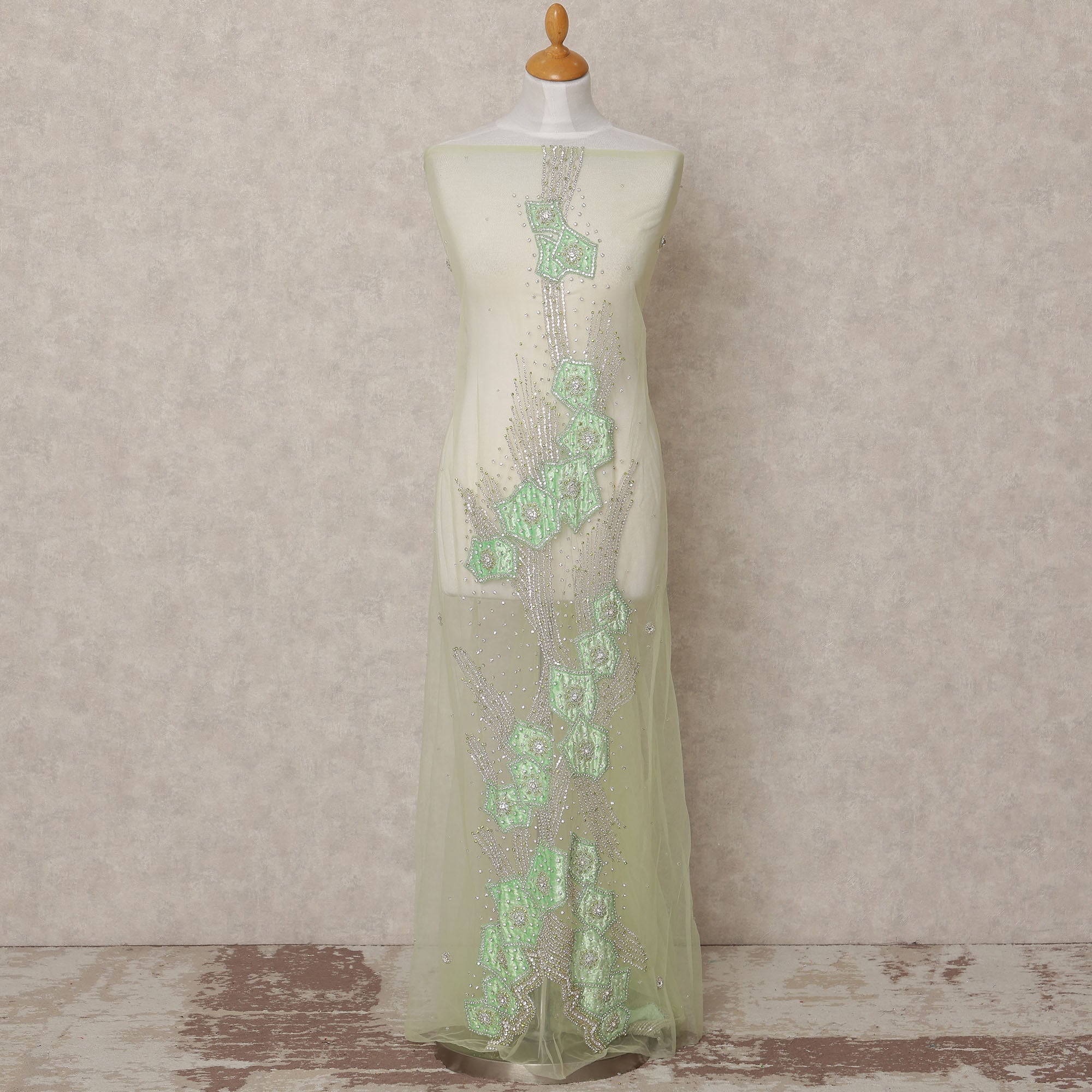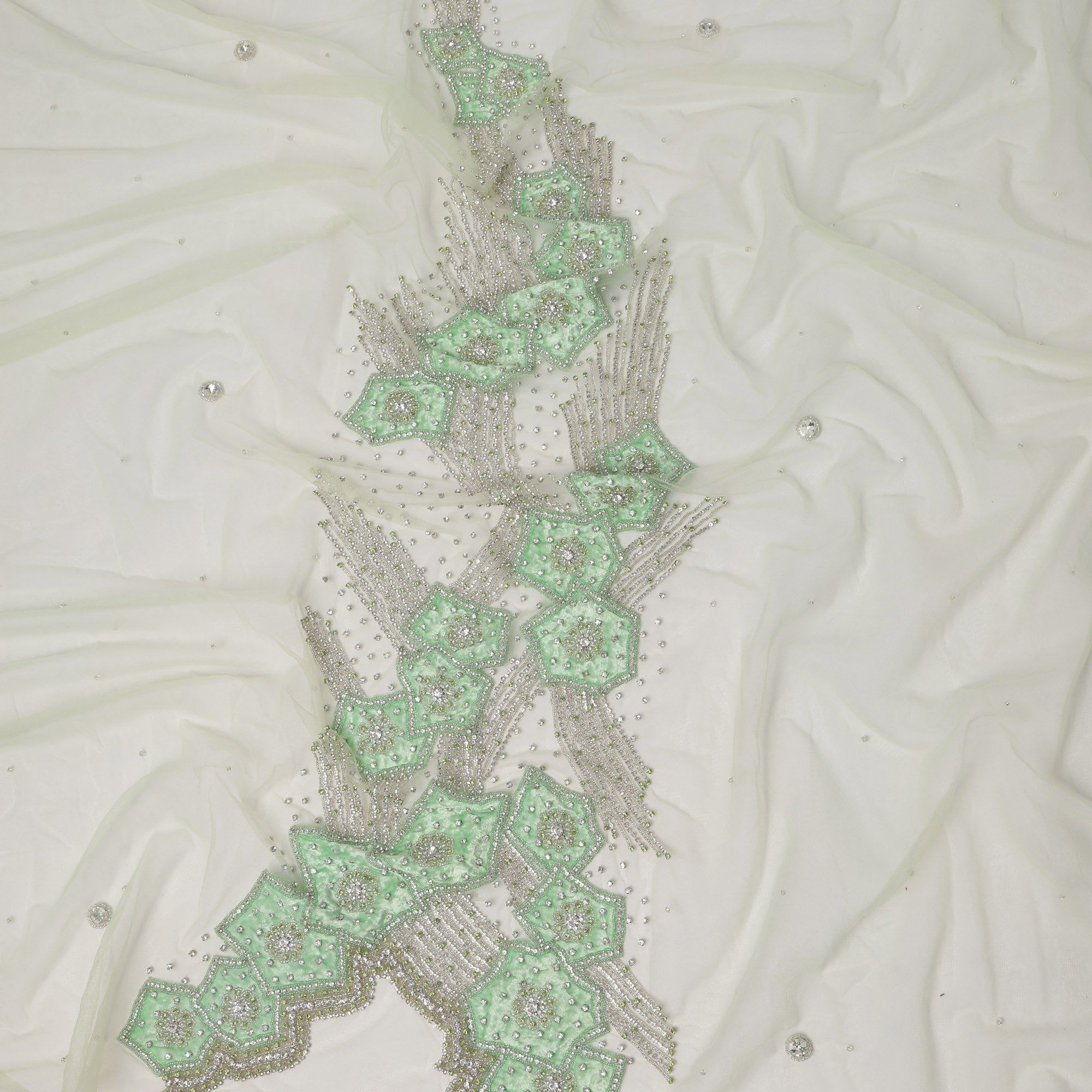 قماش تول نايلون أبيض عاجي مطرز بزخارف نباتية هندسية بلون النعناع وخرز فضي متعرج، عرض 140 سم، صنع في الهند - D23504