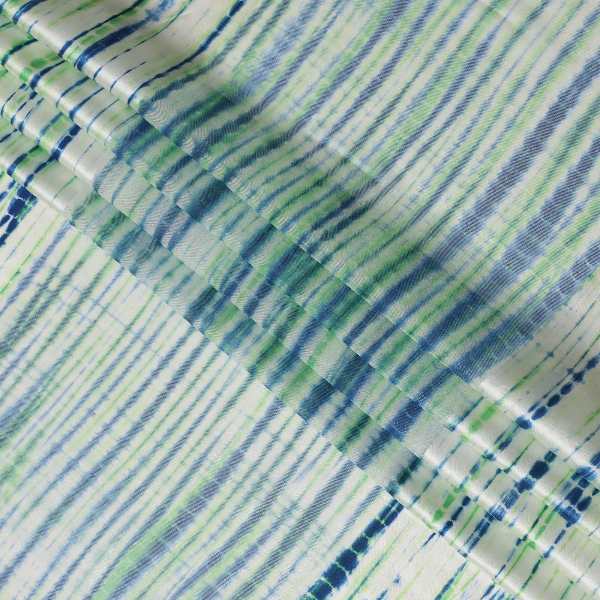 قماش ساتان حريري نقي مخطط باللون العاجي مع خطوط شيبوري زرقاء وخضراء، عرض 110 سم، صنع في الهند