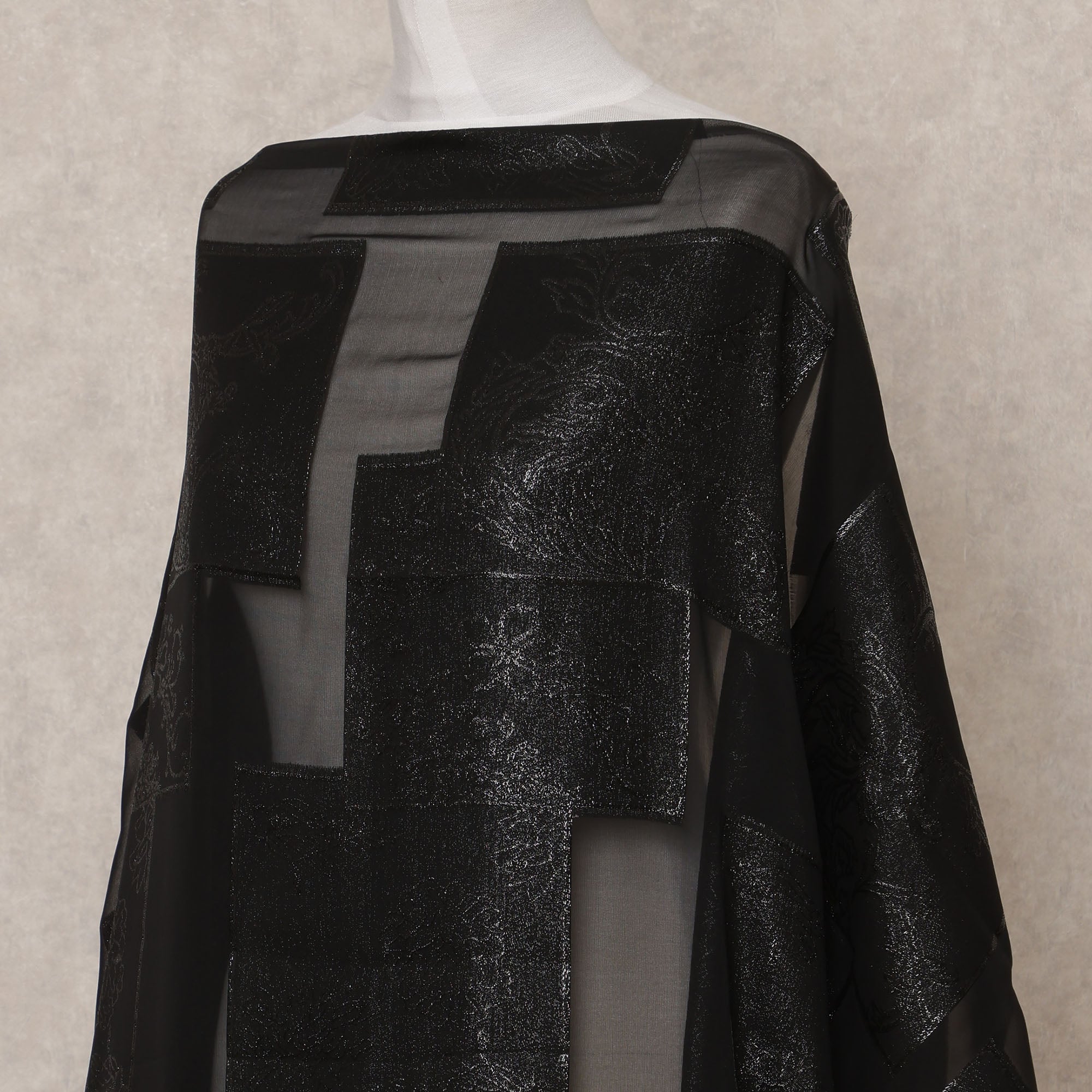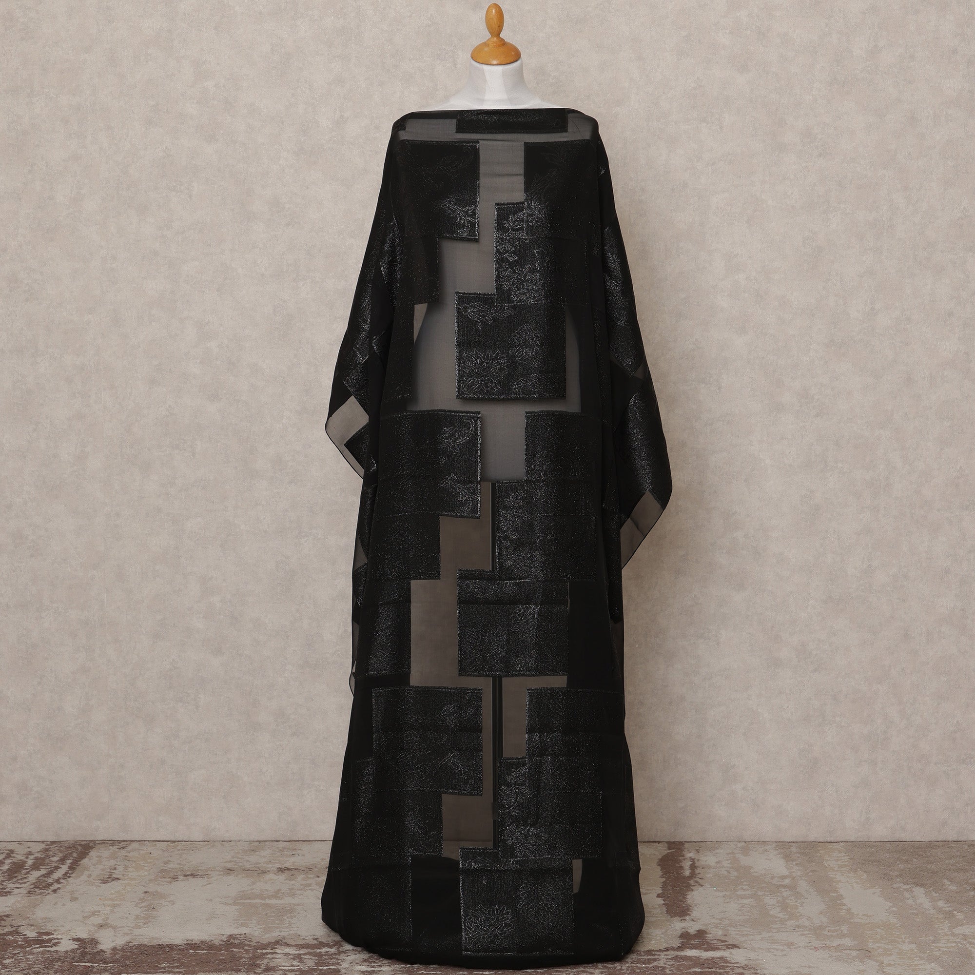 قماش ديراك شيفون حريري صومالي أسود داكن، مع لوركس معدني، يُبرز أناقة خالدة بنمط هندسي عصري منسوج بلمعان أسود لامع.... اقرأ أكثر اقرأ أكثر