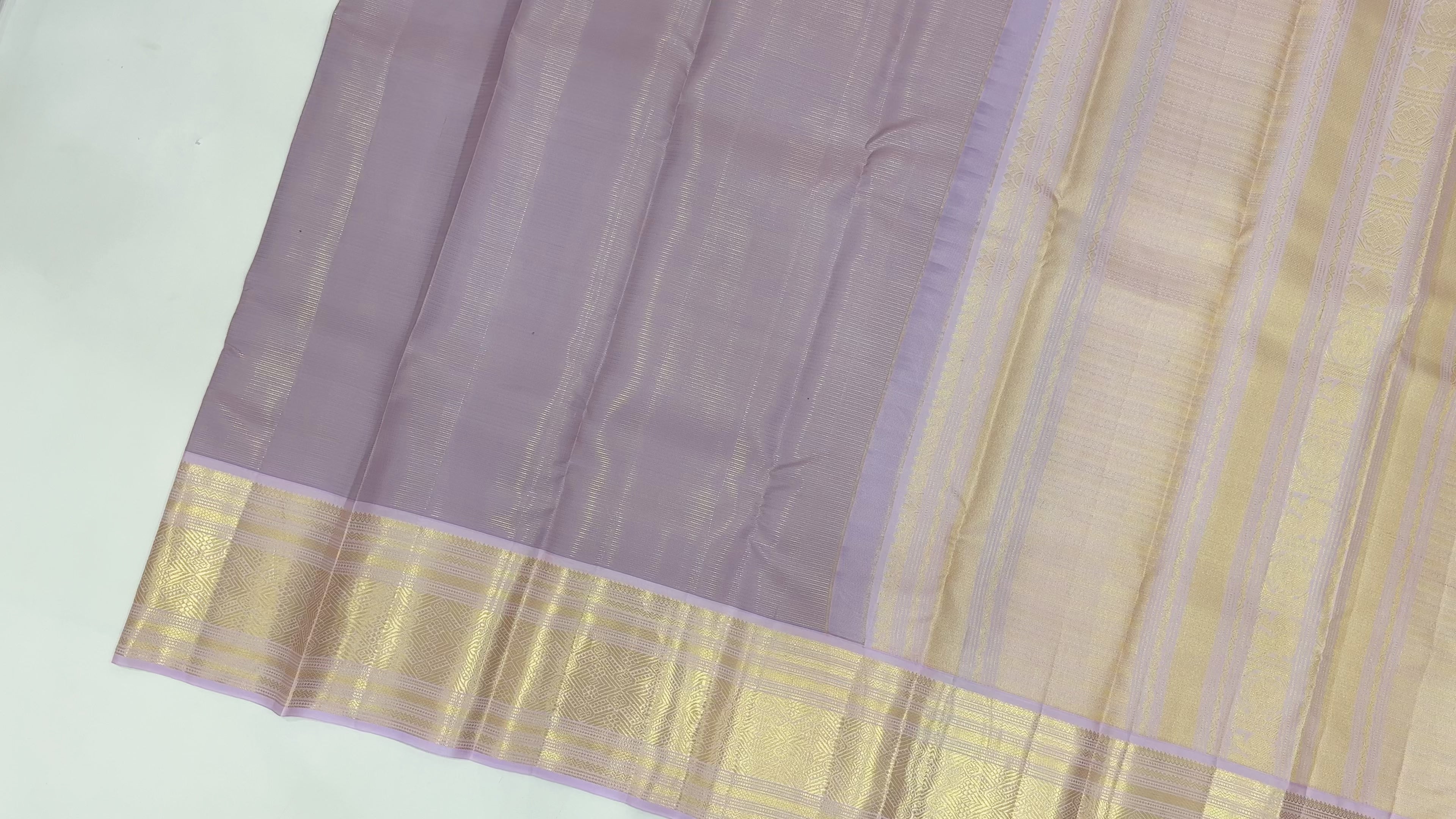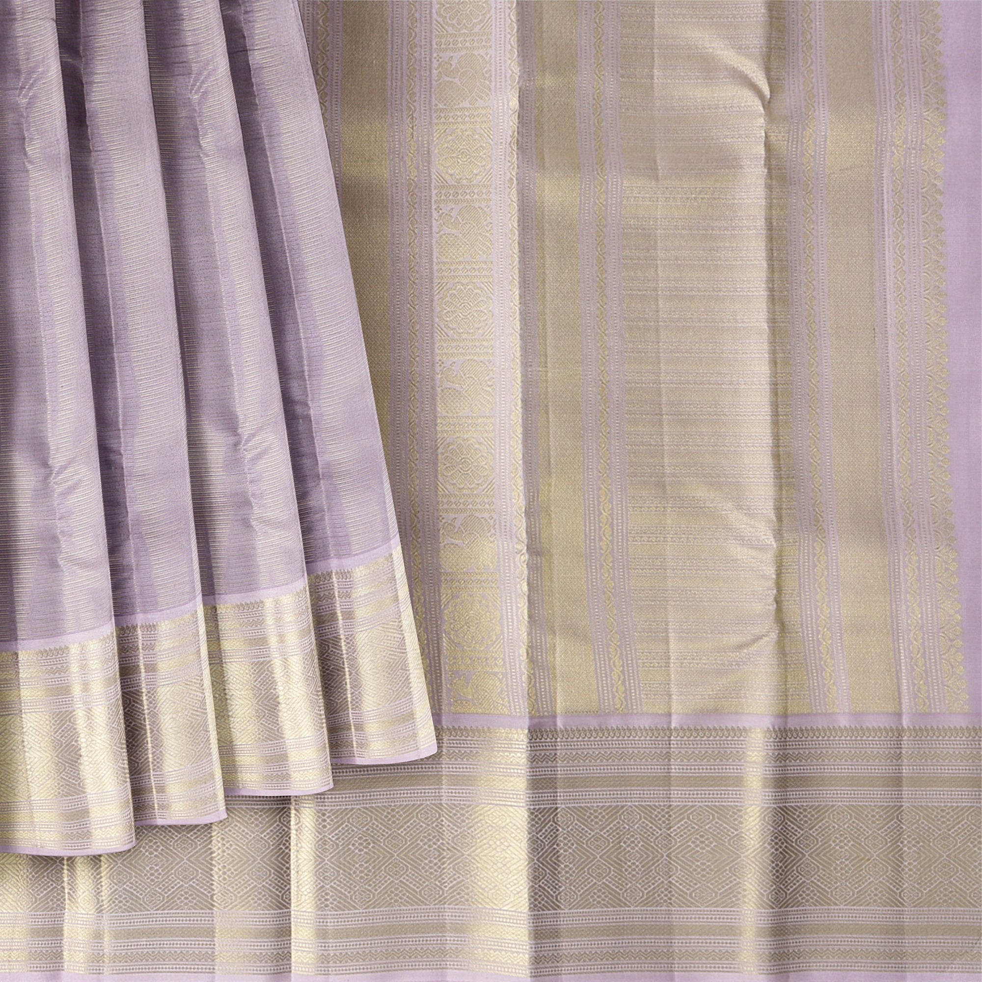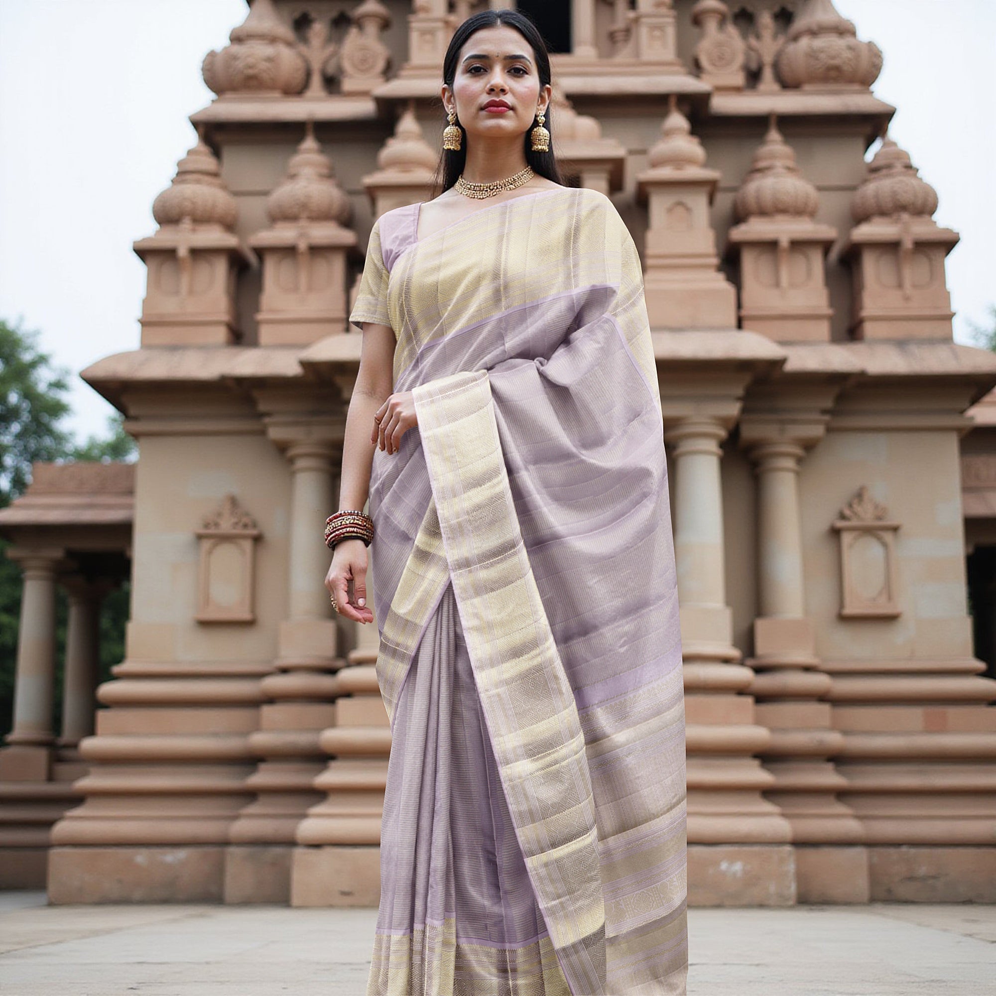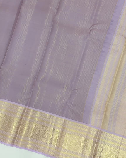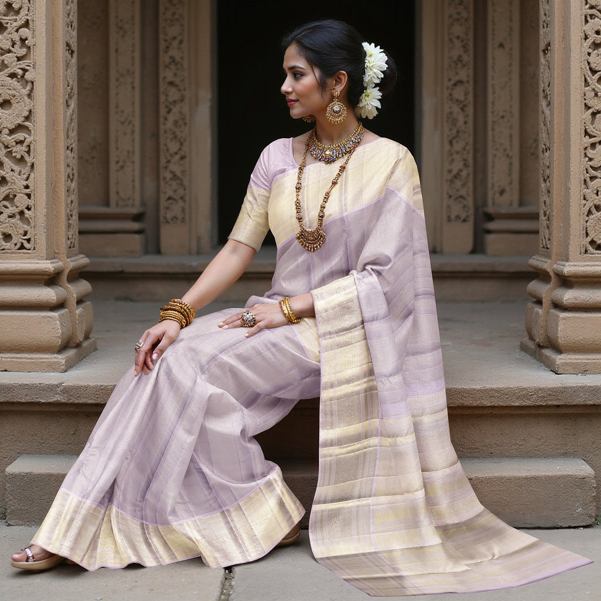 ساري كانجيفارام من الحرير الخالص، منقوش باللونين الخزامي والبيج، مع حافة زاري ذهبية رقيقة، بطول 5.5 متر مع بلوزة، منسوج يدويًا، الهند - D22750
