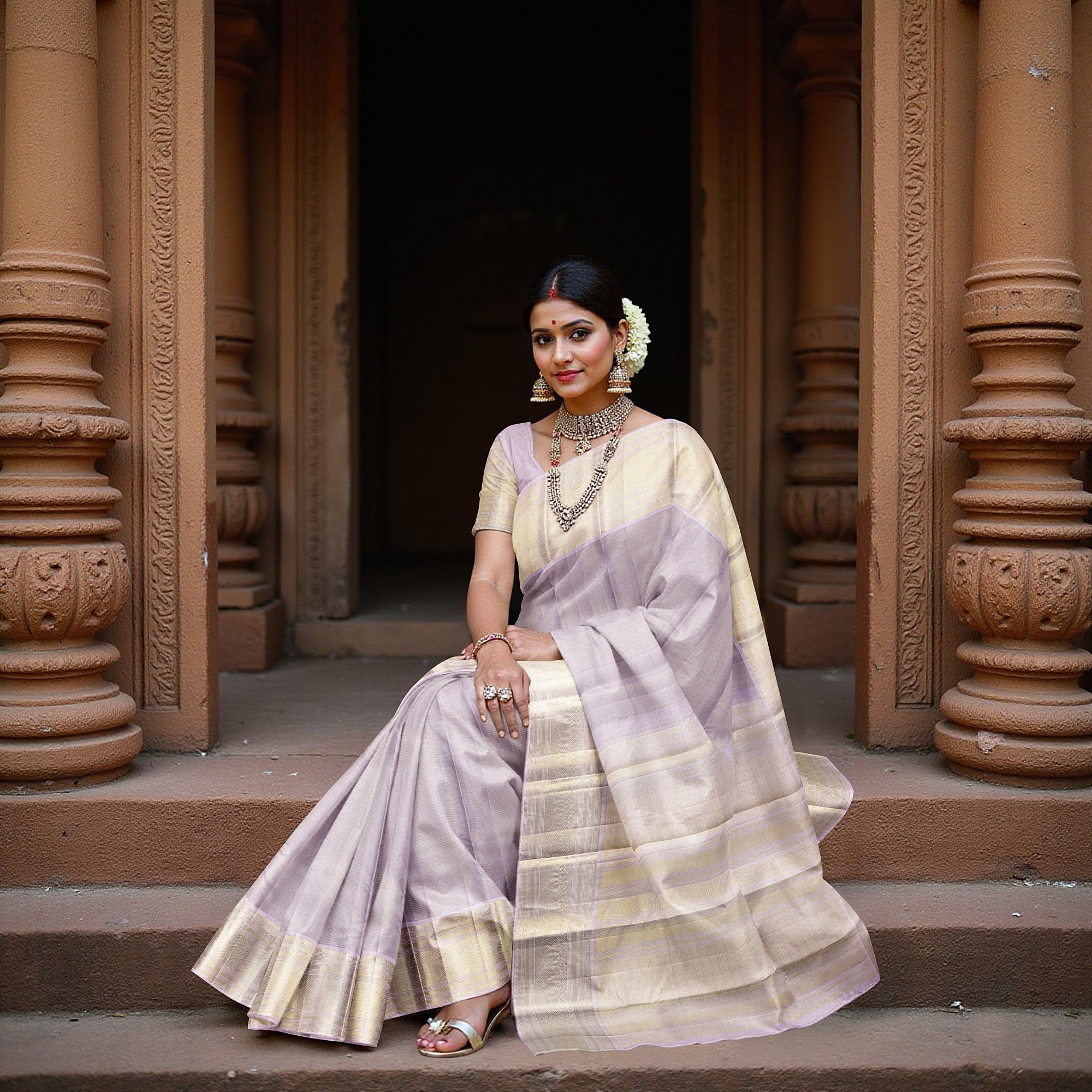 ساري كانجيفارام الحريري الخالص، المُغمور بألوان اللافندر والبيج الهادئة، ينسج بين الأناقة والتقاليد في تحفة فنية مربعة الشكل. تُضفي حافة الزري الذهبية الرقيقة لمسةً مثالية من سحر التراث على قماشه الناعم ثنائي اللون. استغرقت صناعة كل ساري 48 ساعة من العمل الدؤوب، بخيوط منسوجة يدويًا بدقة متناهية لتكوين أنماط دقيقة تبدو وكأنها مرسومة على الحرير. مستوحى من لوحات المعابد وستائر الراقصات الكلاسيكيات الملكية، يشع هذا الساري فخامةً هادئة. مصنوع بالكامل على يد نساجين من جنوب الهند، ويأتي مع بلوزة وستائر متناسقة بأناقة أنيقة تُجسّد جمالًا خالدًا.