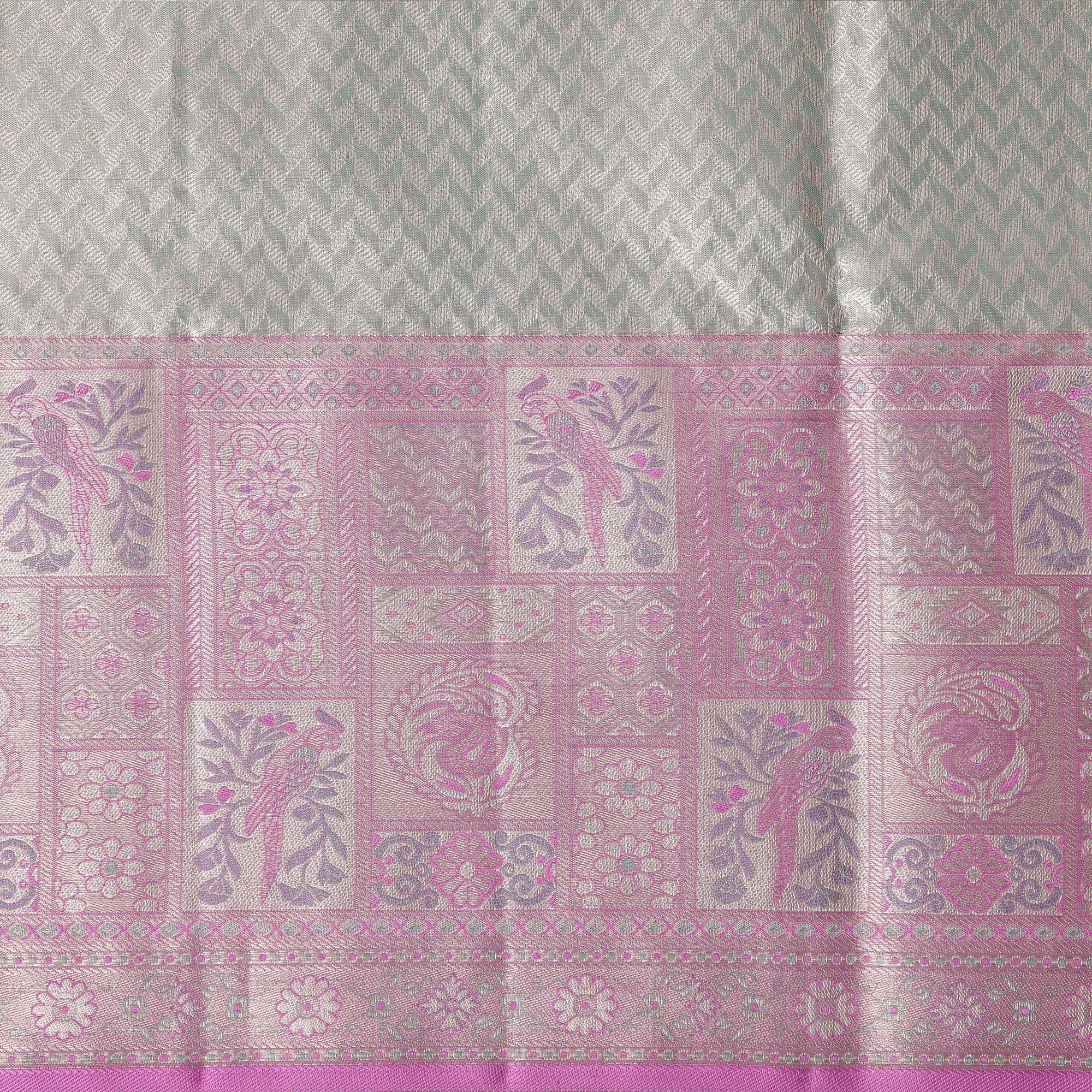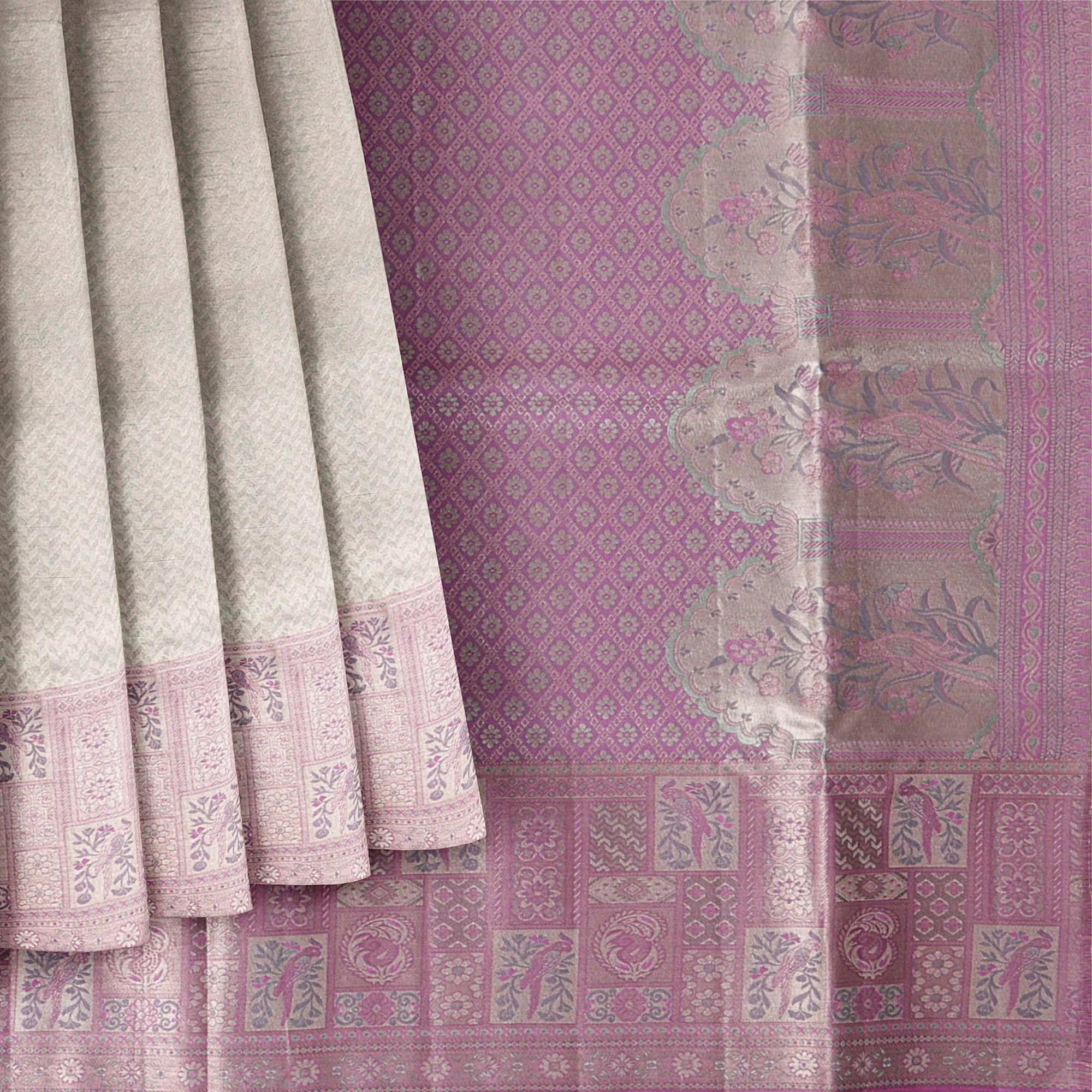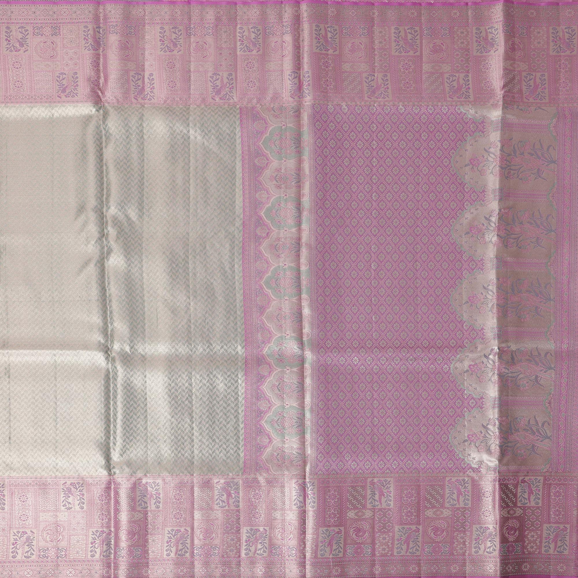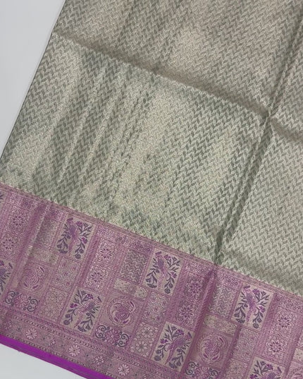 ساري كانجيفارام من الحرير الخالص بلون اللافندر والفضي، مزين بزخارف فنية منسوجة يدويًا، بطول 5.5 متر مع بلوزة، من أصل هندي - D22669