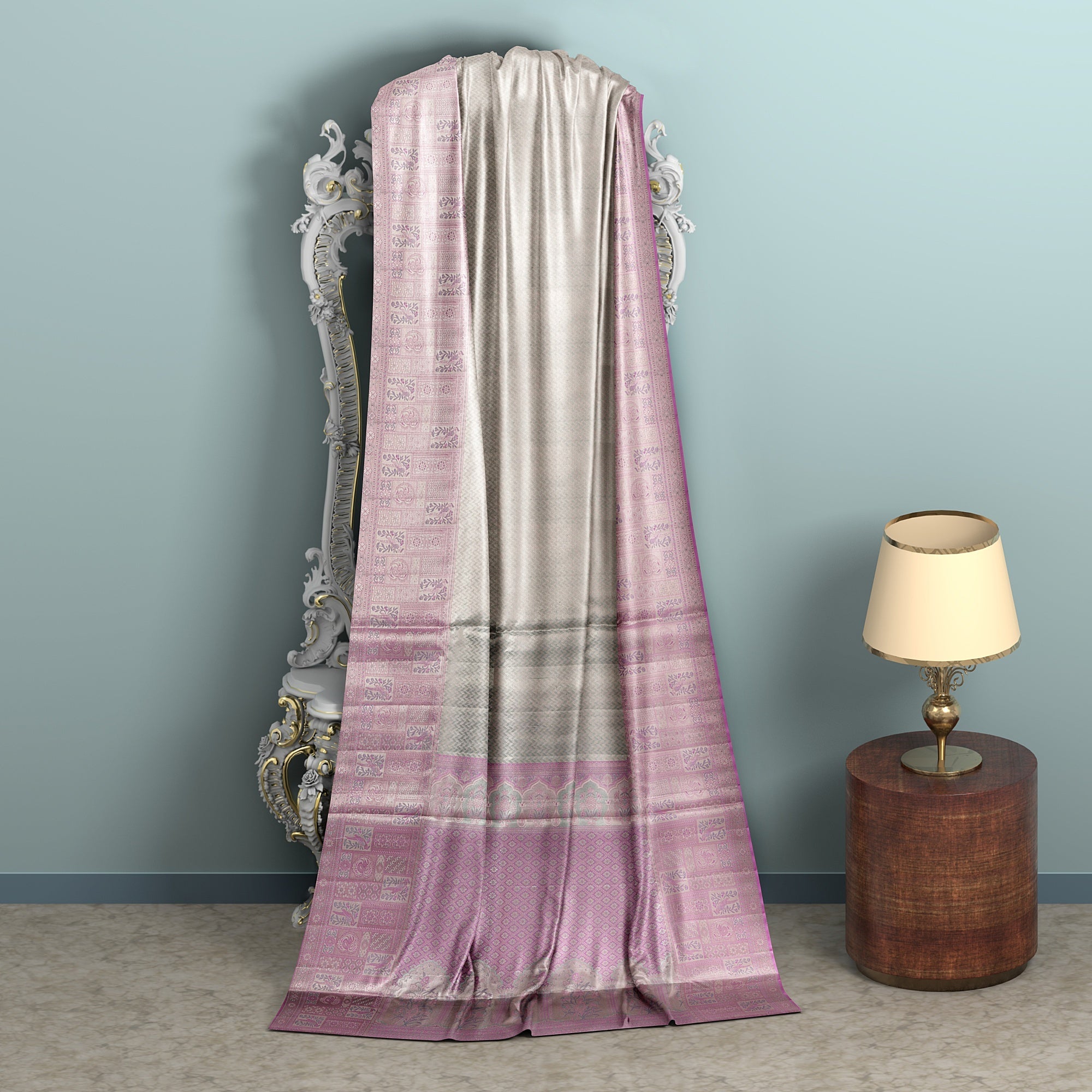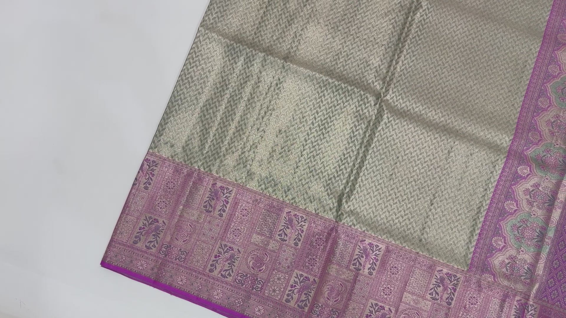 ساري كانجيفارام الحريري الخالص بلون اللافندر والفضي، تحفة فنية من النسيج التقليدي، حيث يروي كل خيط قصة تفاني وفن. منسوجة... اقرأ أكثر اقرأ أكثر