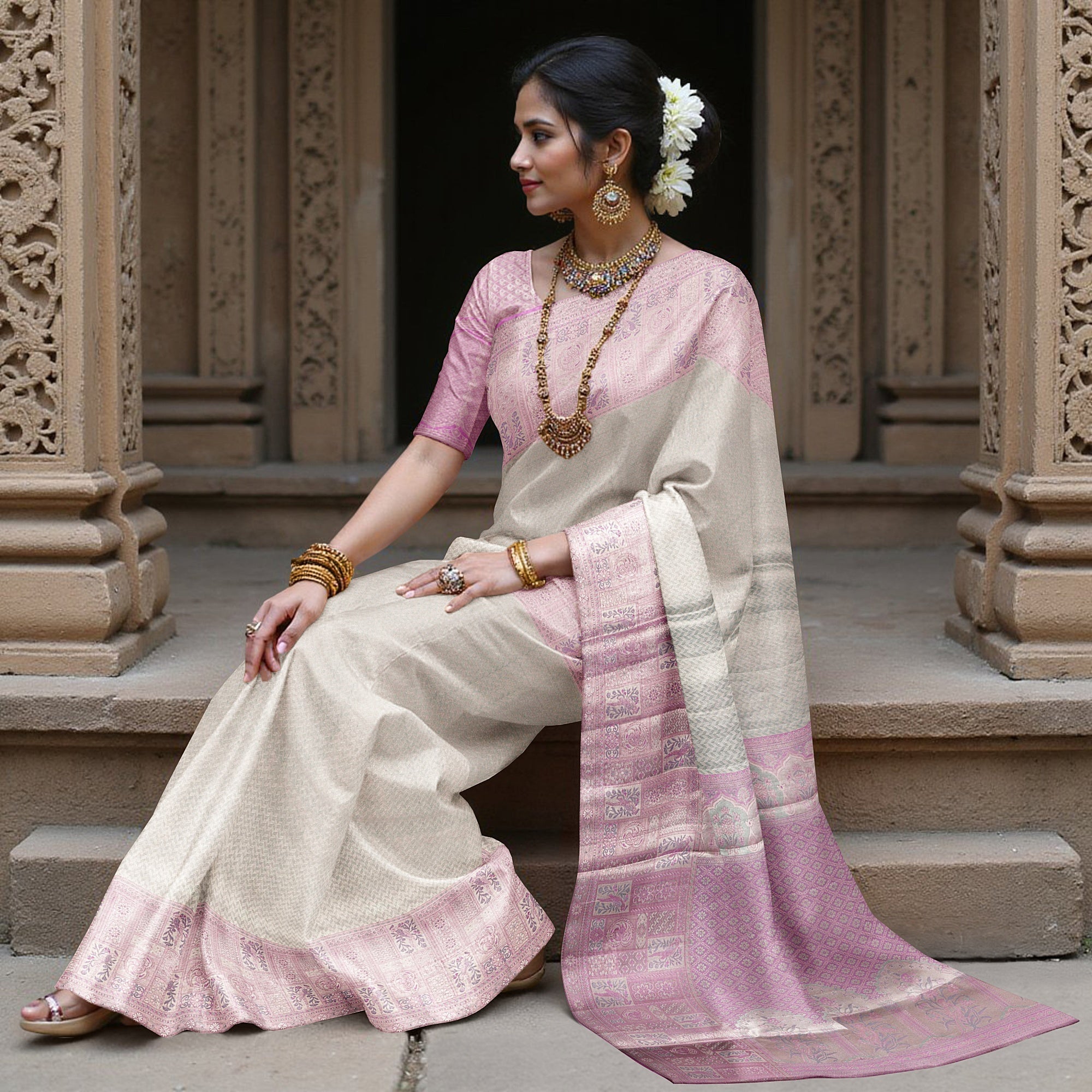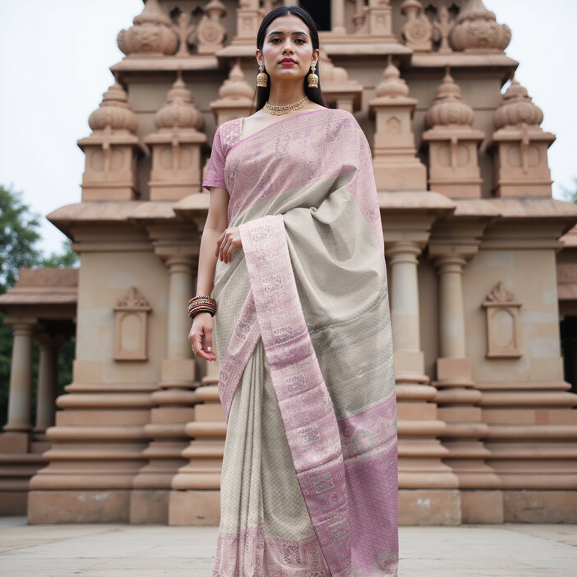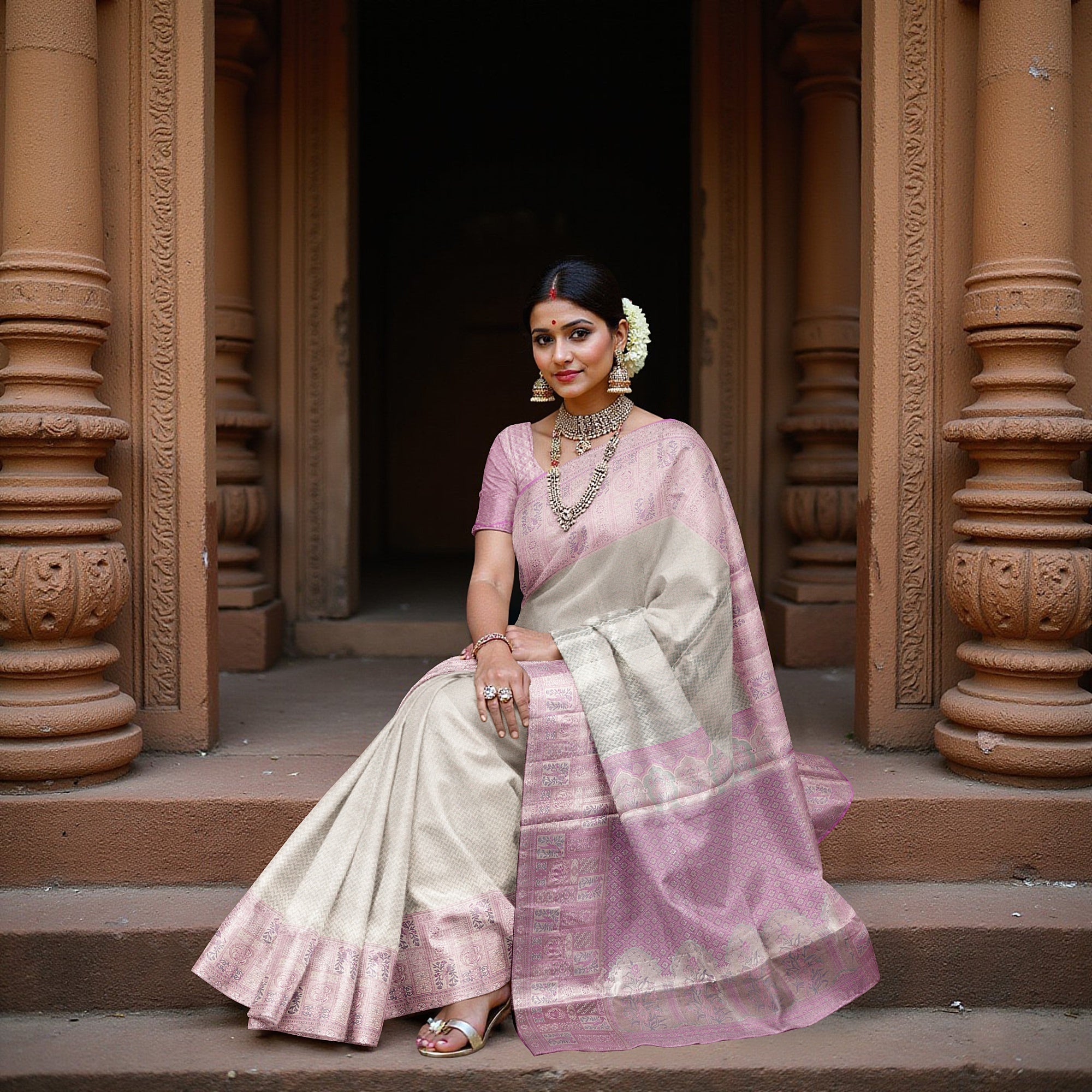 قماش حرير نقي منسوج على يد حرفيين من جنوب الهند لتحقيق دقة وأناقة لا مثيل لها.