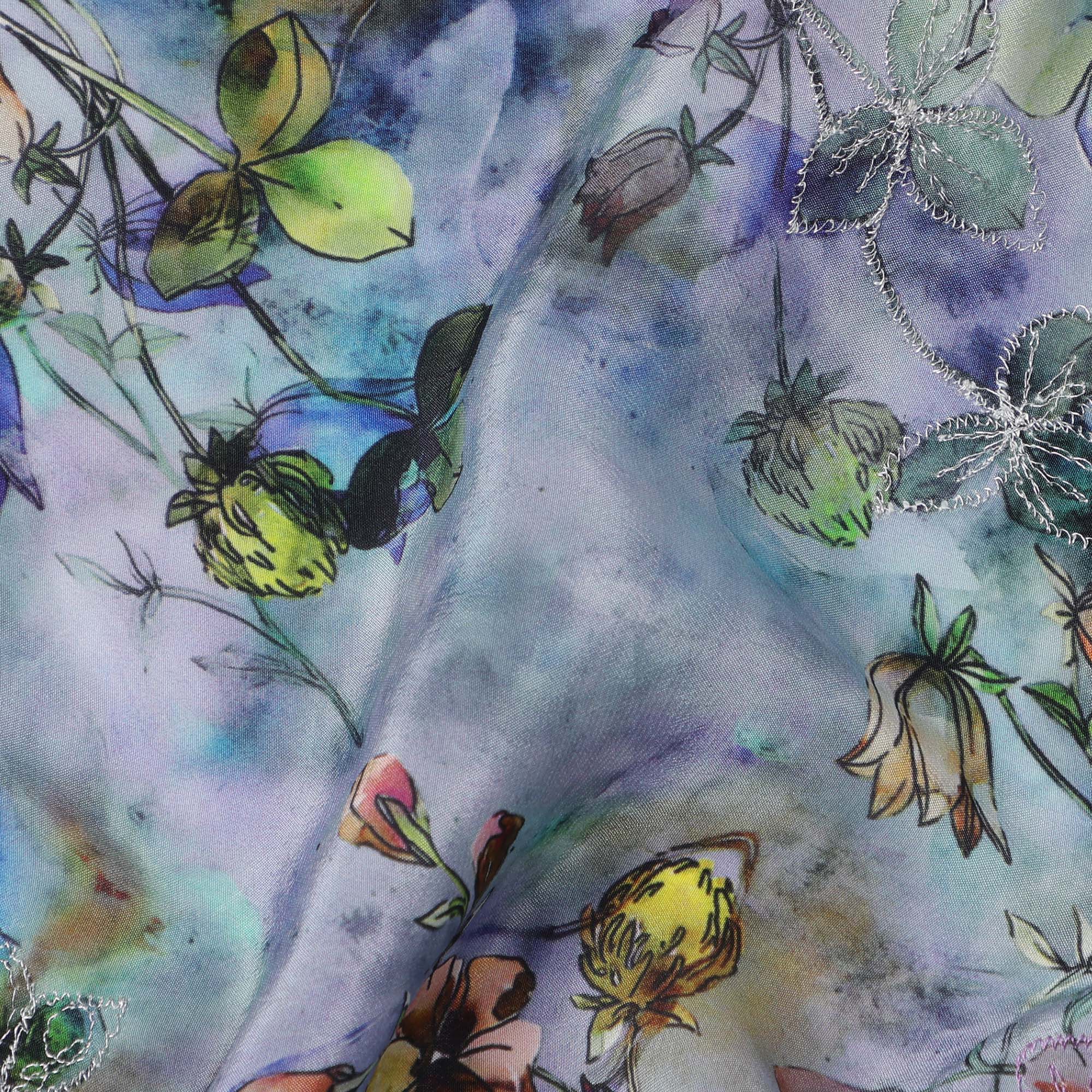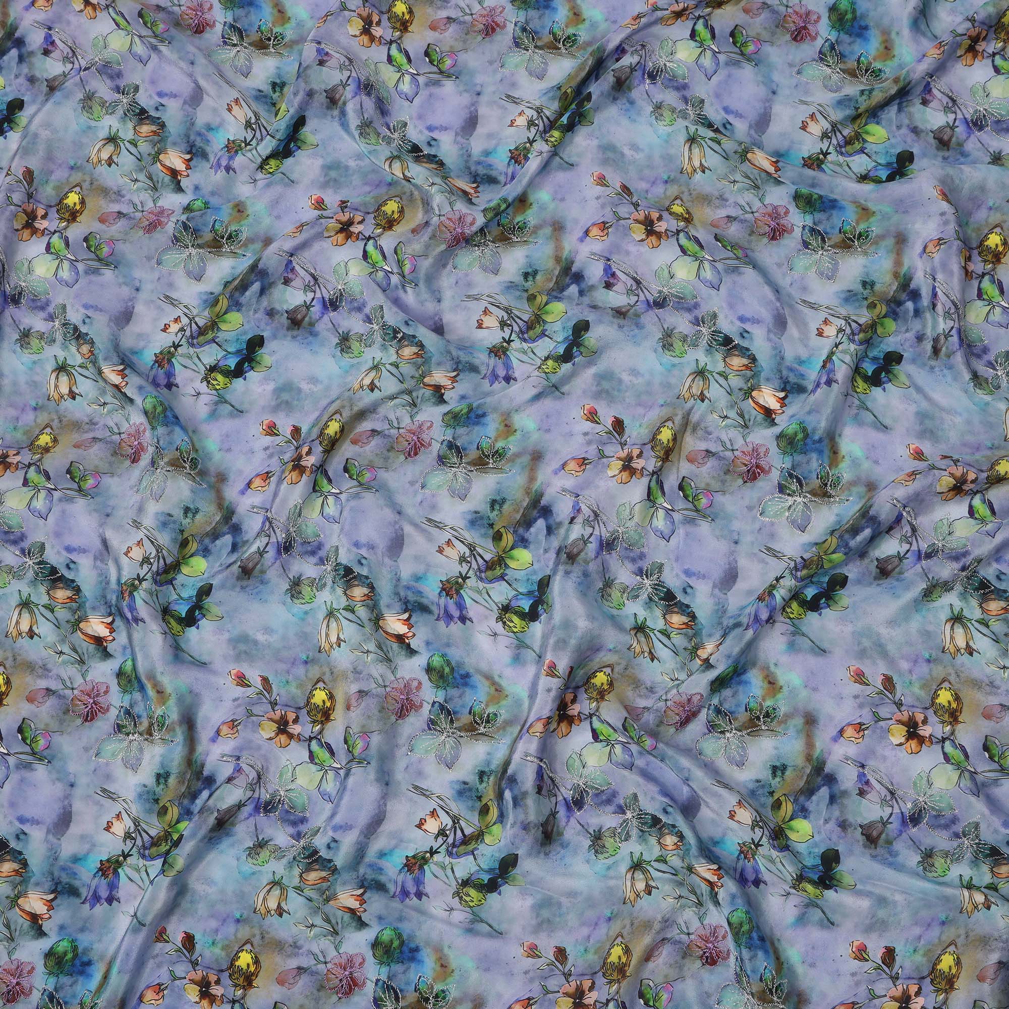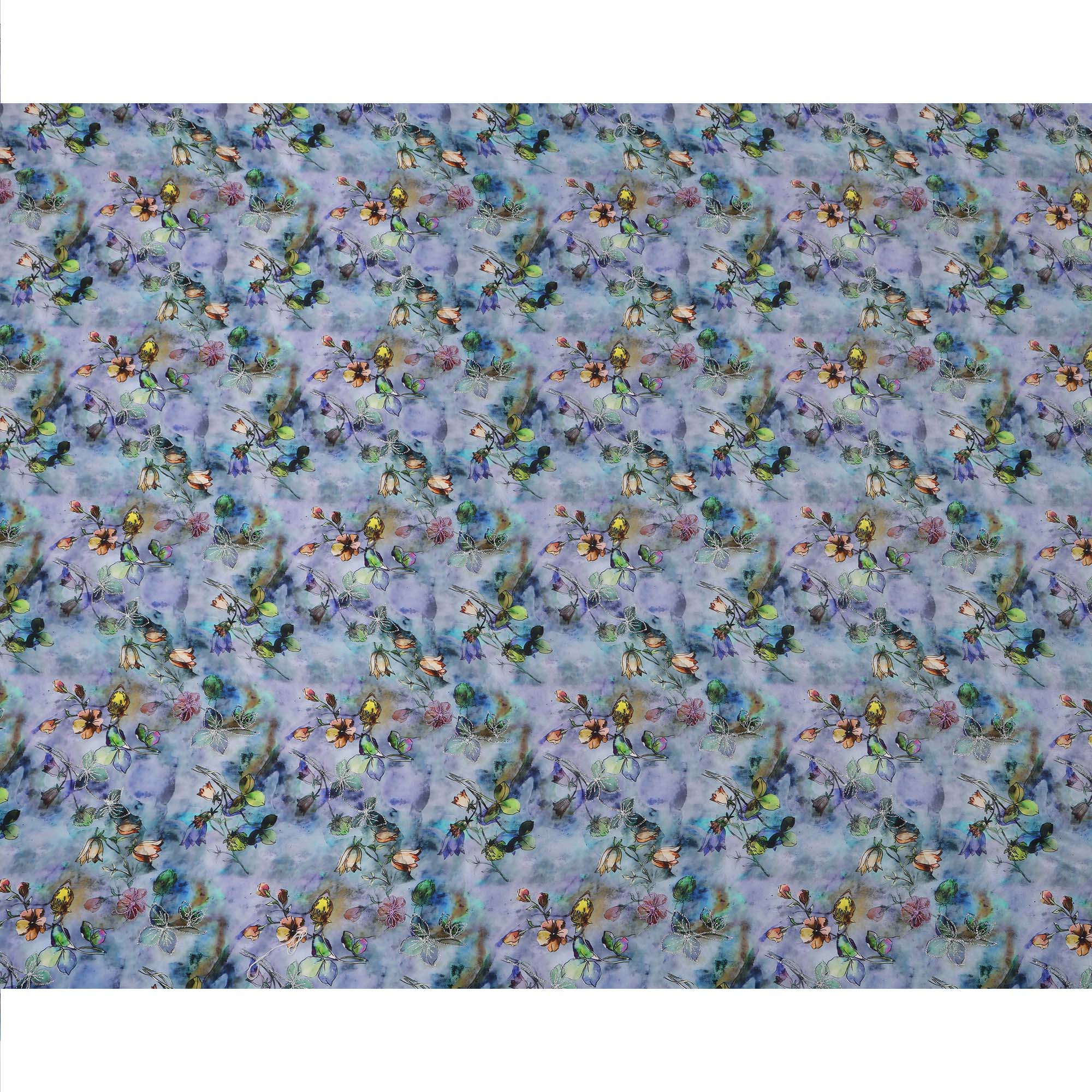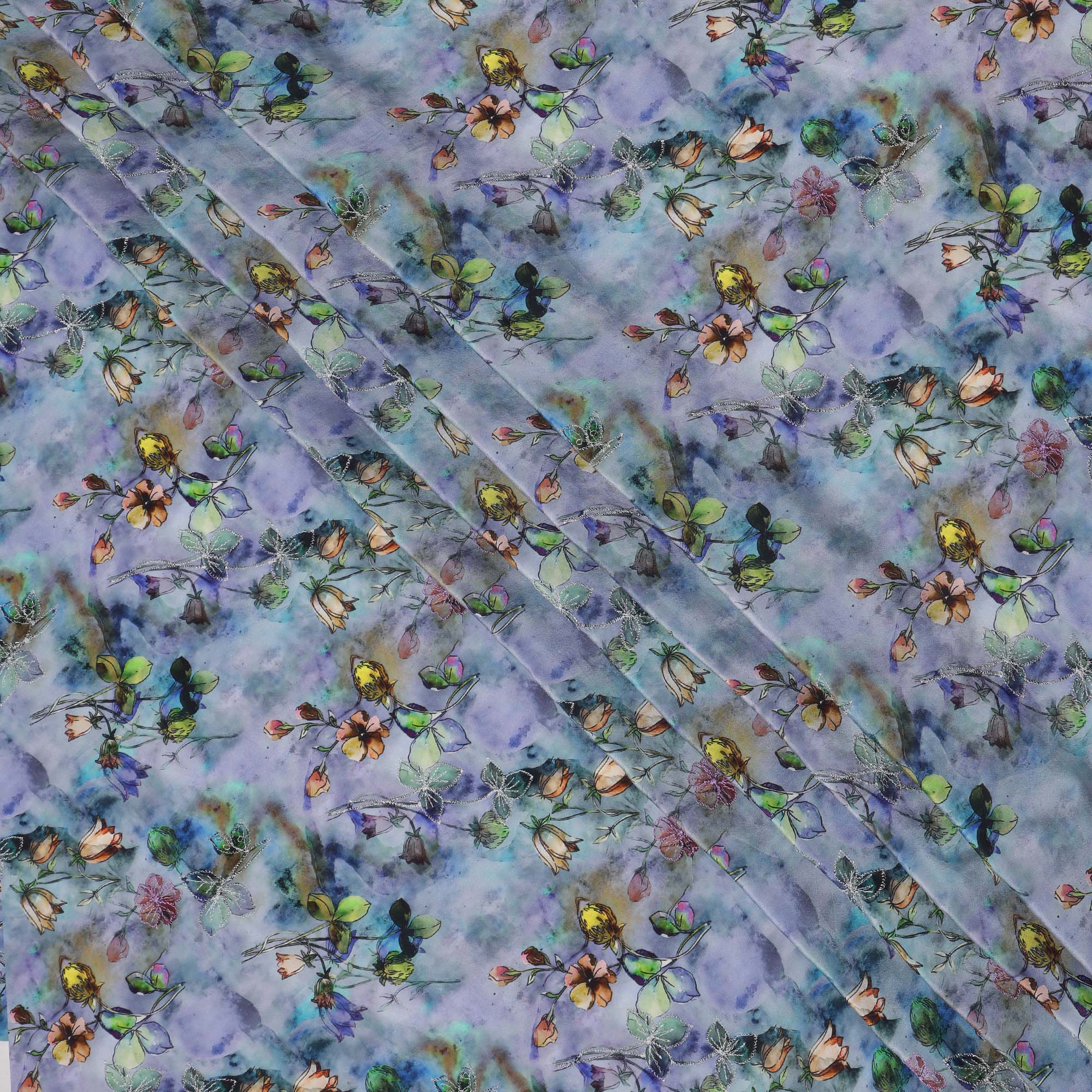 قماش فيسكوز أزرق لافندر أساسي بطبعة زهور وأوراق بألوان مائية متعددة، 110 سم، الهند - D23852