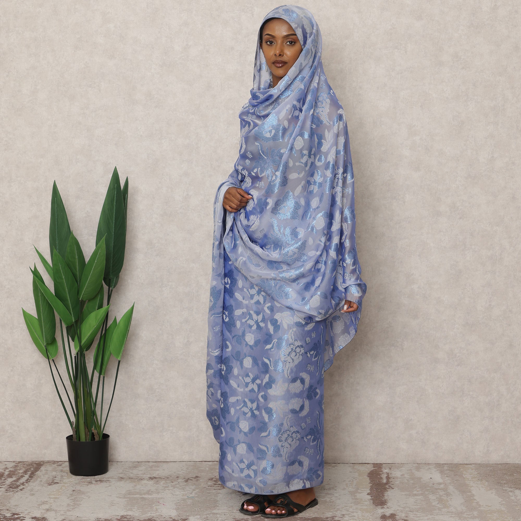 ثوب سوداني تقليدي فرنسي أزرق لافندر، مصنوع من قماش شيفون حرير فرنسي خالص بطول 4.5 متر وقماش لوركس معدني، عرض 140 سم، صنع في فرنسا - D24490