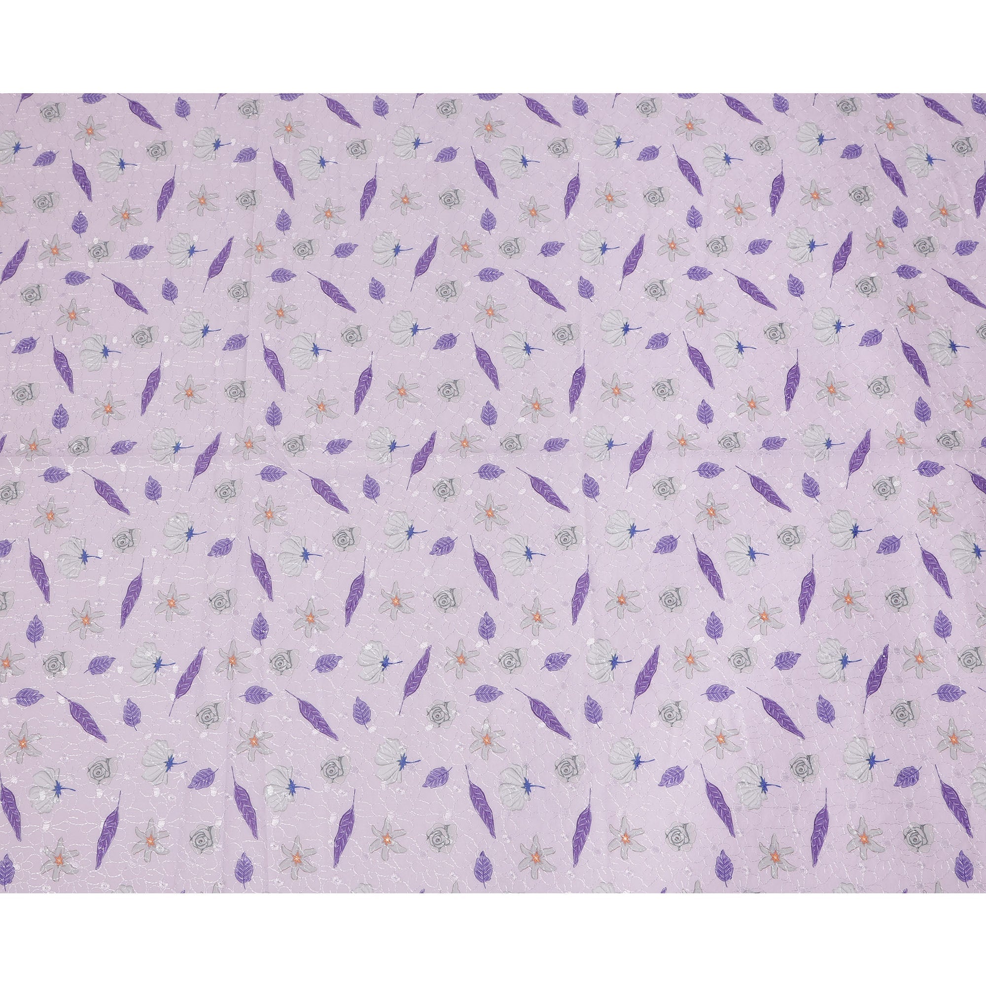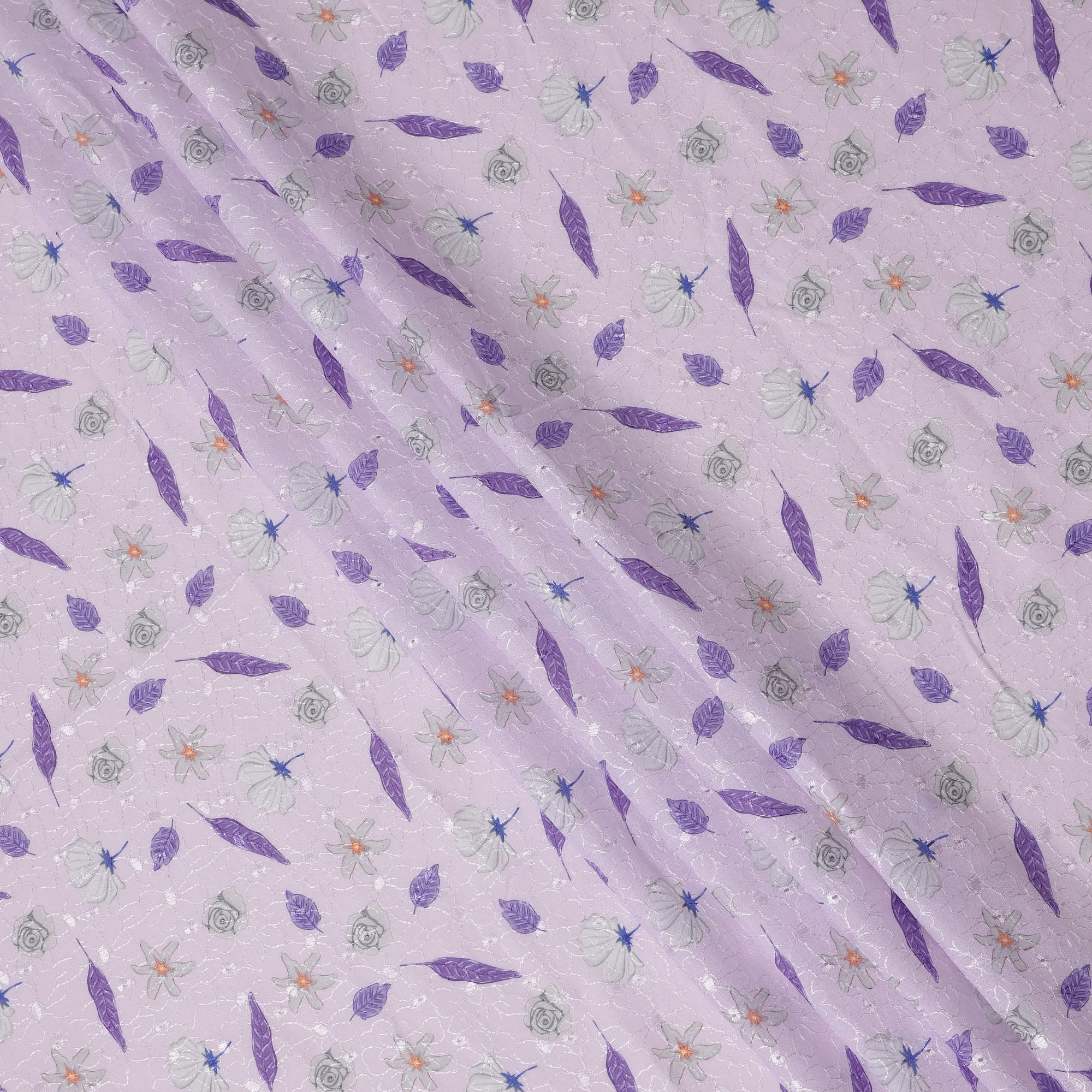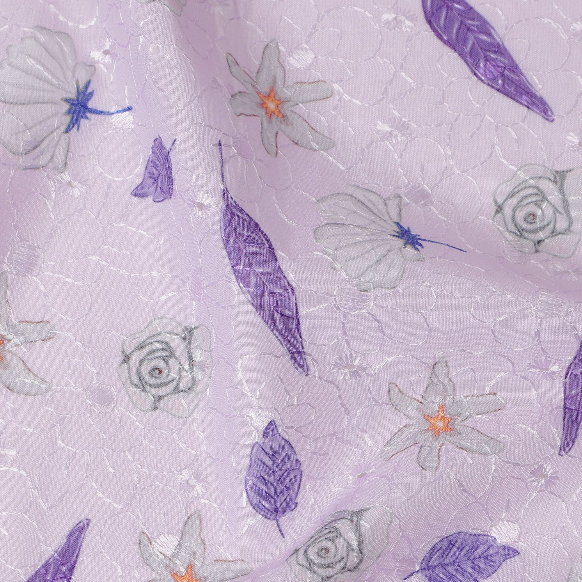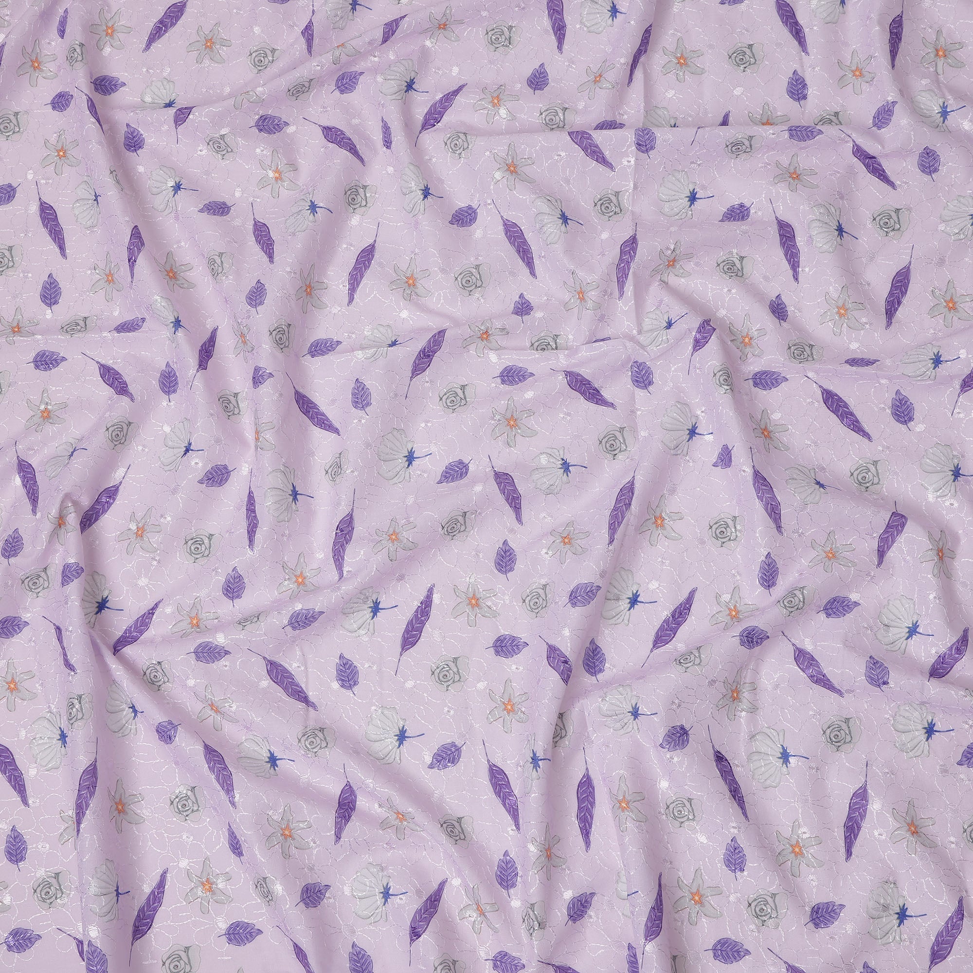 قماش تطريز من القطن الفوال بلون اللافندر مع تصميم أوراق أرجوانية وزهور، عرض 110 سم، الهند - D25296