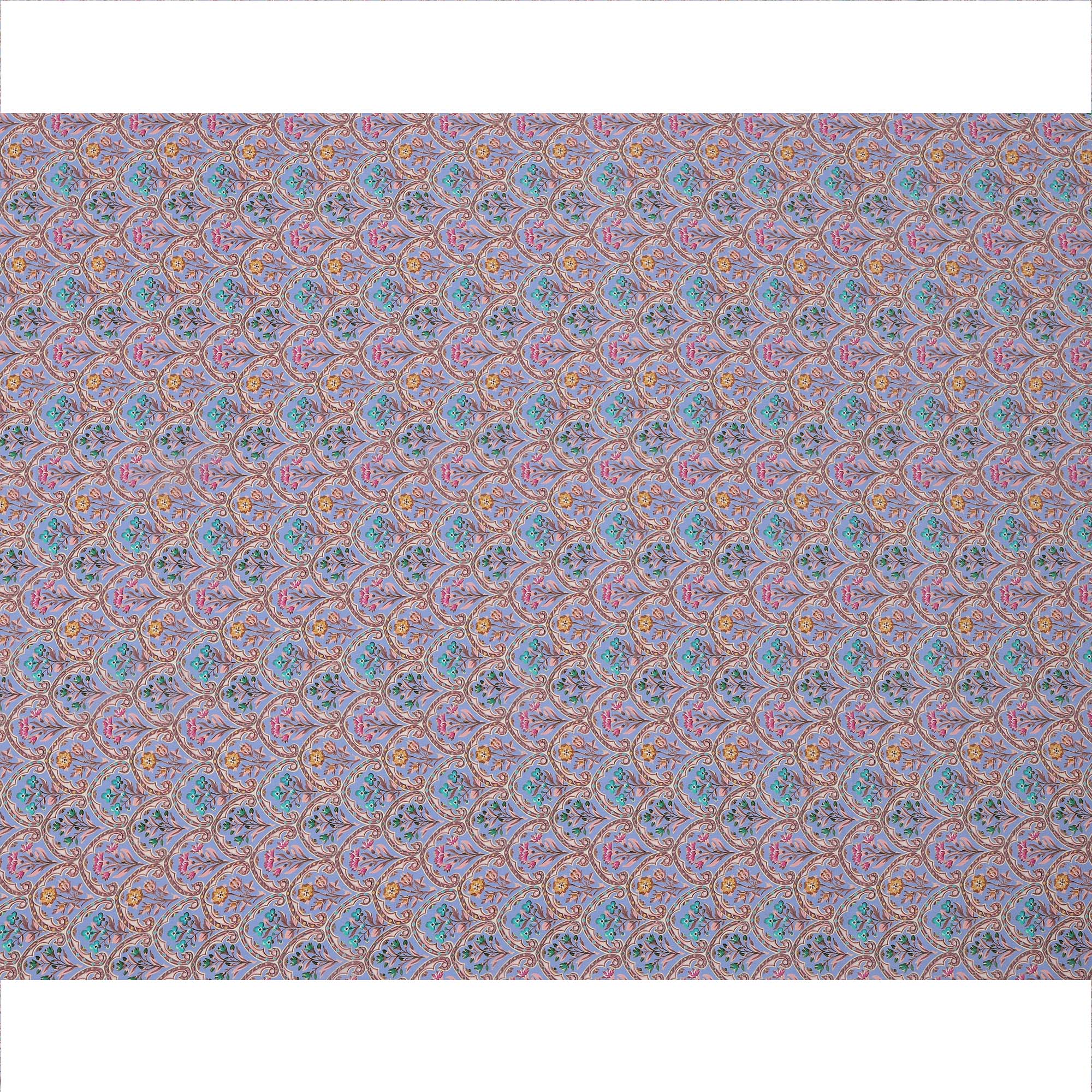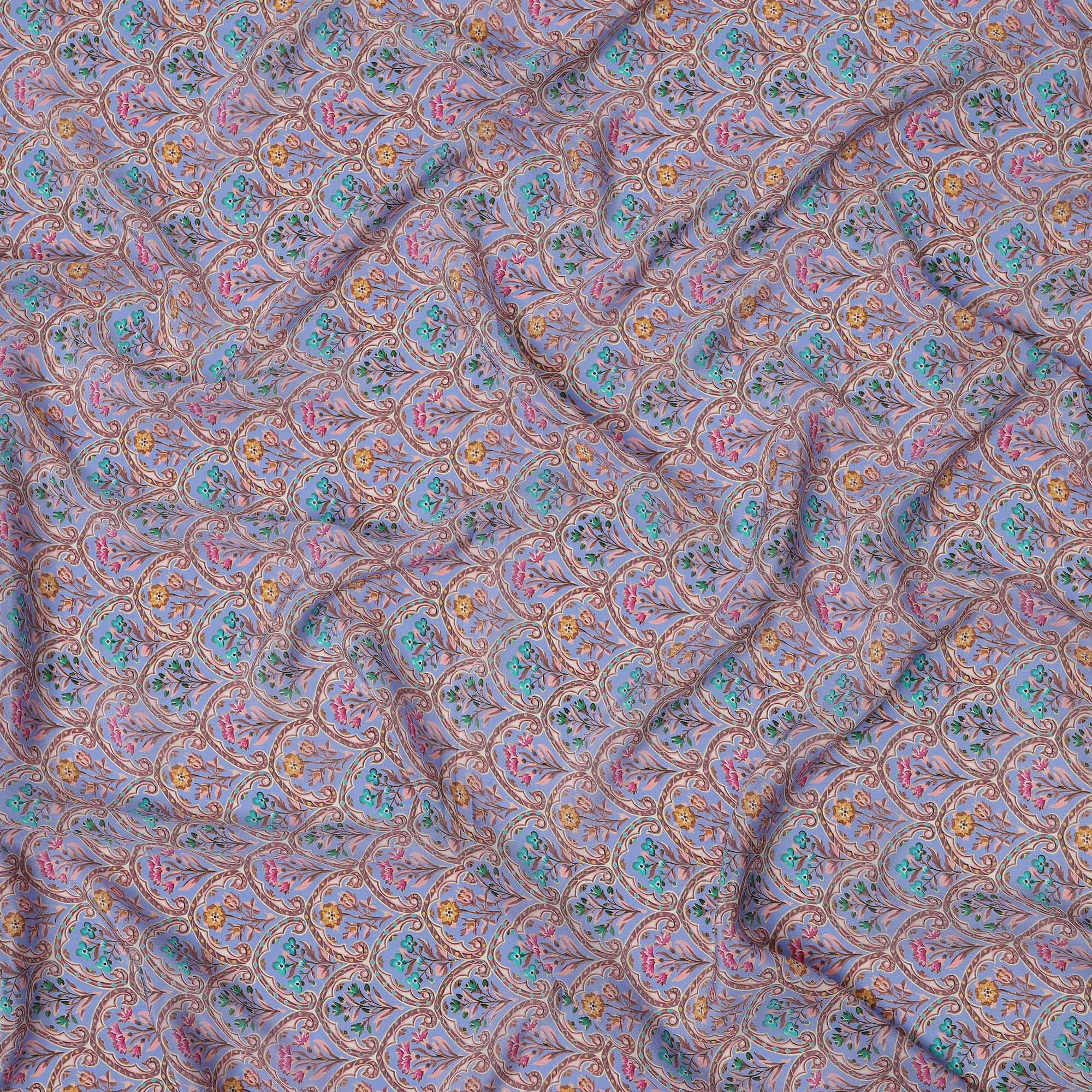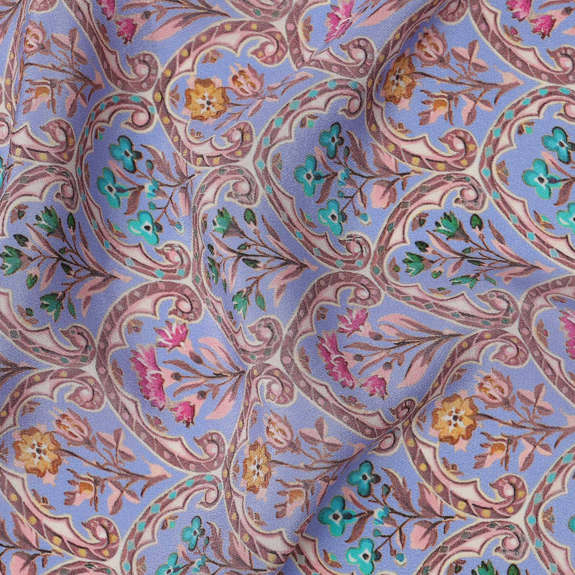 This luxurious lavender pure silk crepe fabric beautifully blends artistic charm and classic sophistication. Featuring a detailed geometric floral print with ornamental motifs in shades of turquoise, coral, mustard, and soft pink, the fabric radiates elegance and vibrancy. Crafted from 100% premium silk, the crepe weave provides a soft, slightly textured finish with an elegant drape and natural sheen. Its lightweight and breathable quality make it perfect for creating refined garments such as dresses, blouses, scarves, and resort wear. The lavender base enhances the intricate multicolor patterns, adding depth and visual appeal. Expertly woven in India, this silk crepe fabric combines traditional textile mastery with a contemporary design aesthetic. Its fluid movement and graceful texture make it ideal for couture creations that require sophistication and comfort. The natural silk fibers ensure a smooth touch and luxurious feel, making every piece stand out with timeless beauty. Professional dry cleaning is advised for best care.
