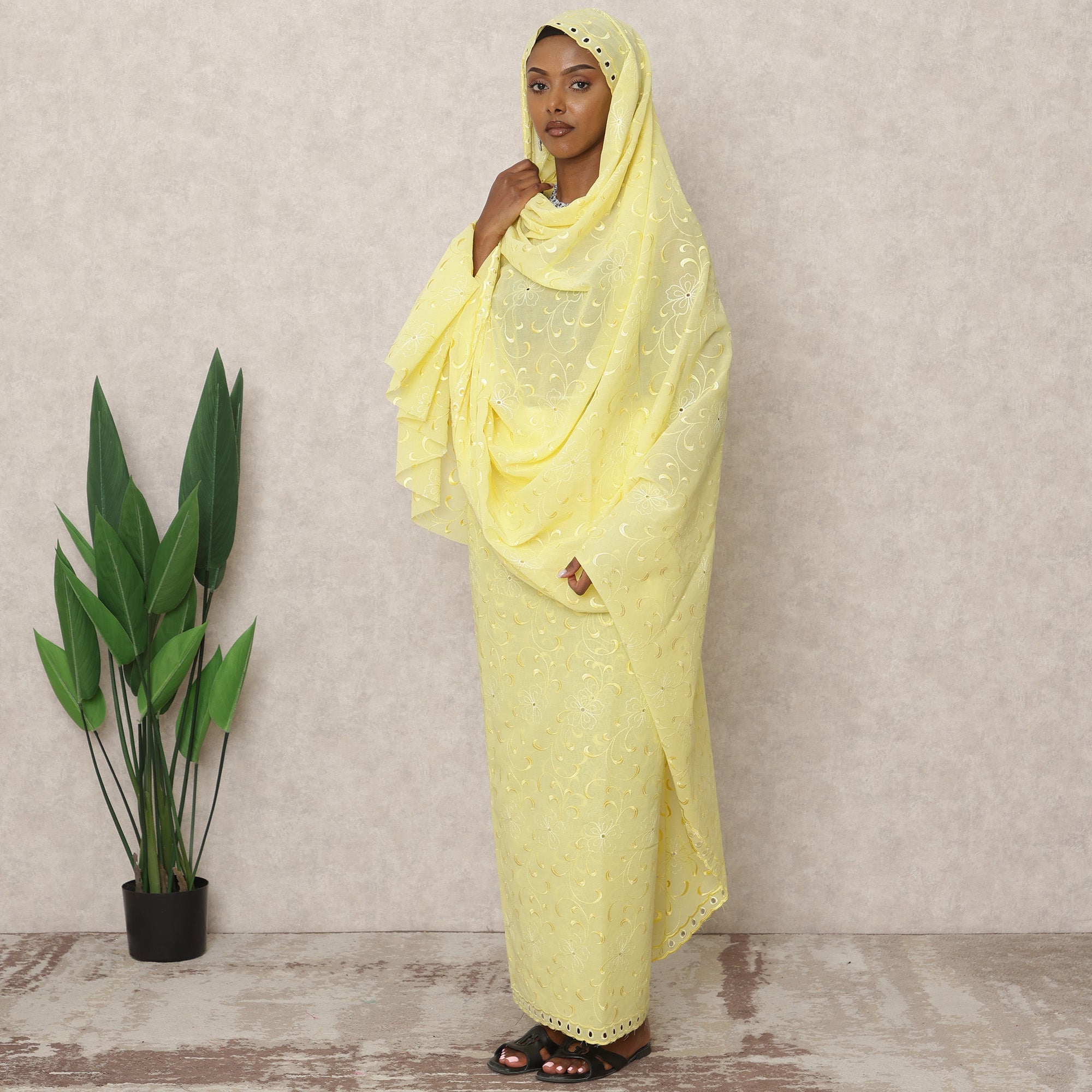 ثوب سوداني تقليدي أصفر ليموني مطرز بالكامل بالفوال، قطعة بطول 4.5 متر، مصنوع من قماش قطني خالص، عرض 140 سم، صنع في الهند - D24475