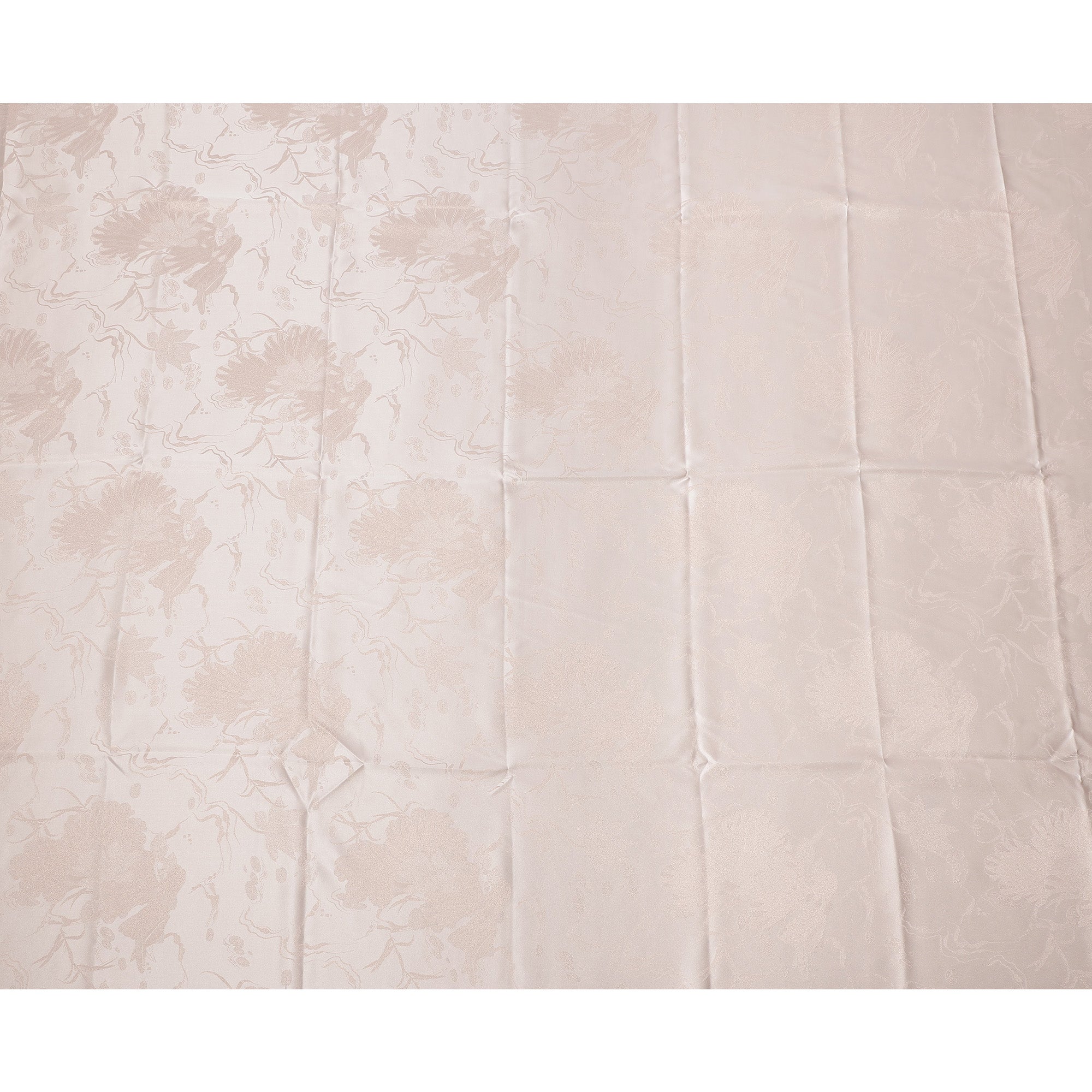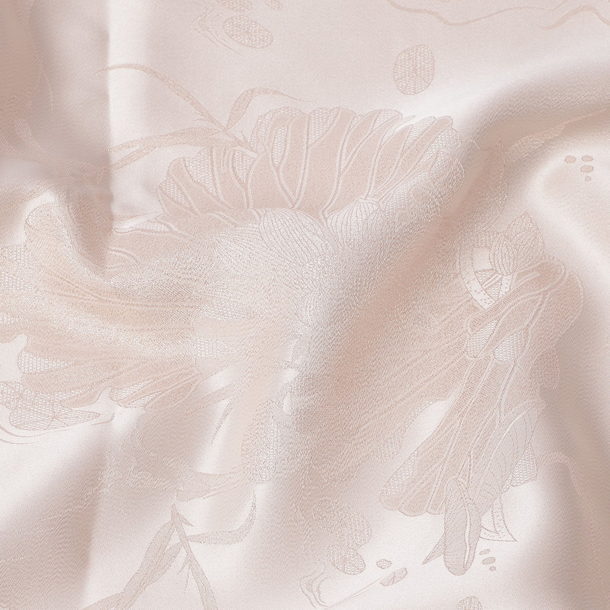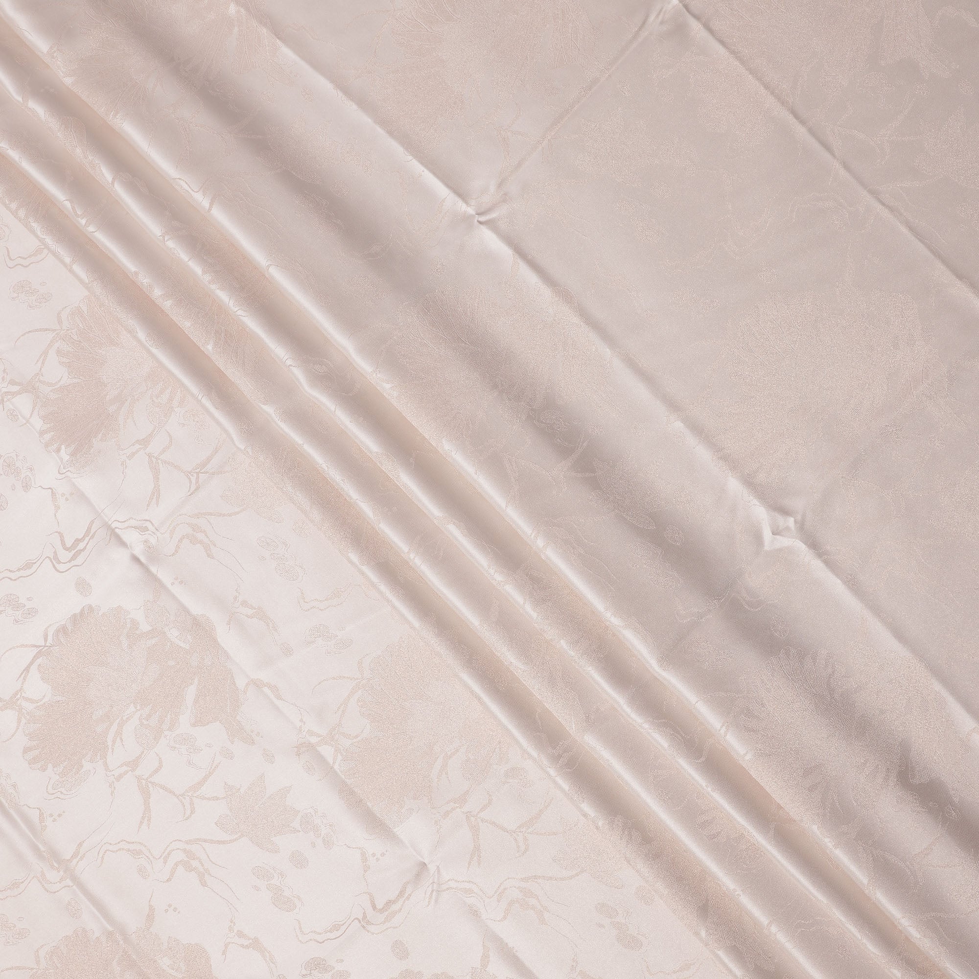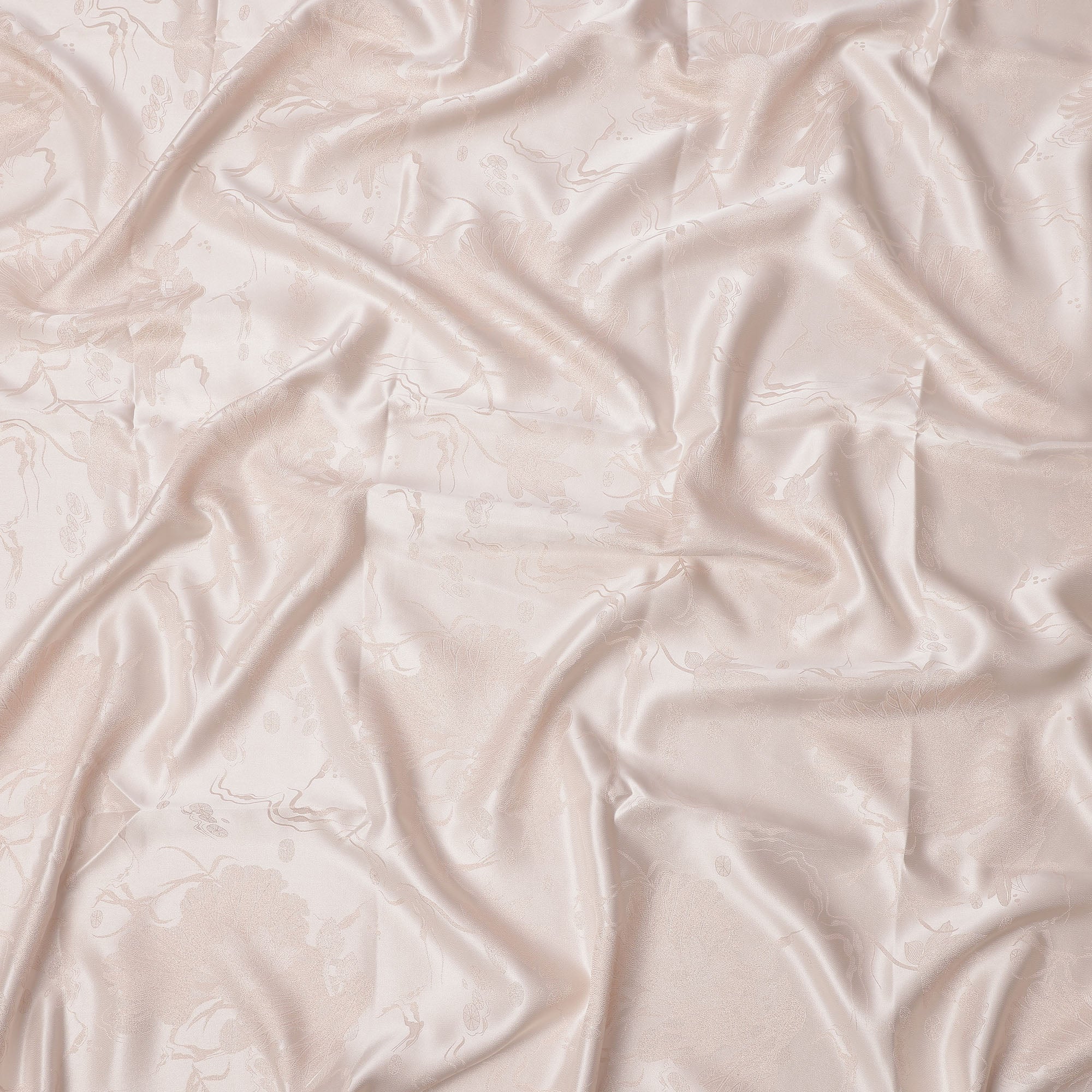قماش ساتان حريري نقي بلون بيج فاتح مع تصميم زهور معقد