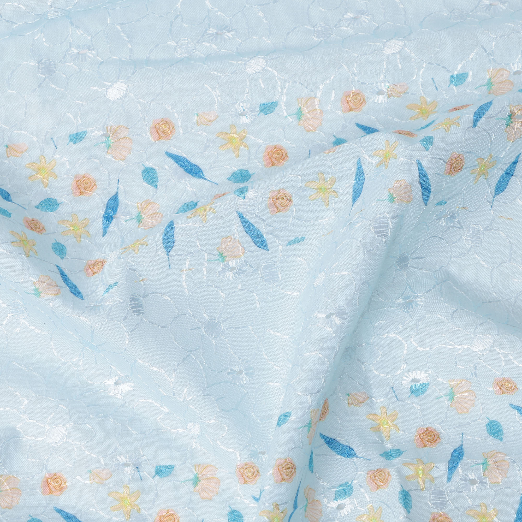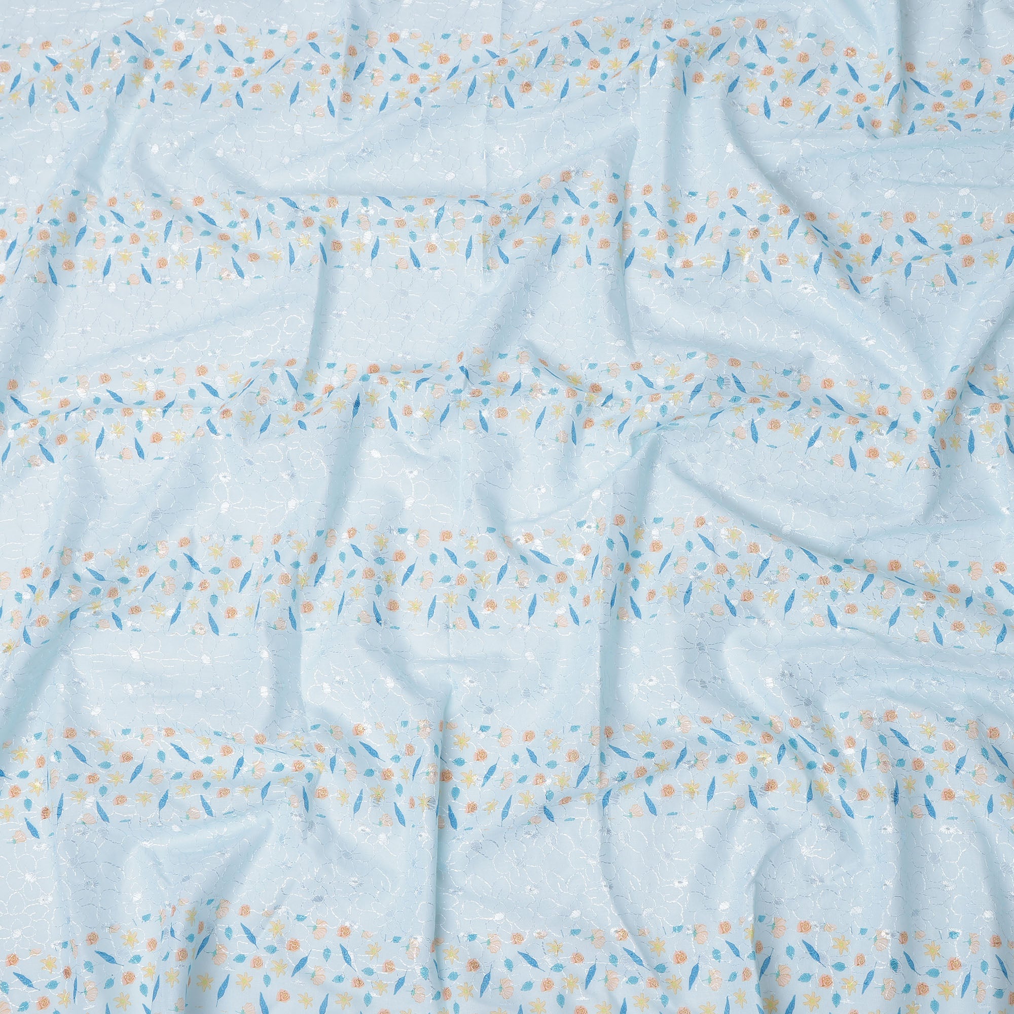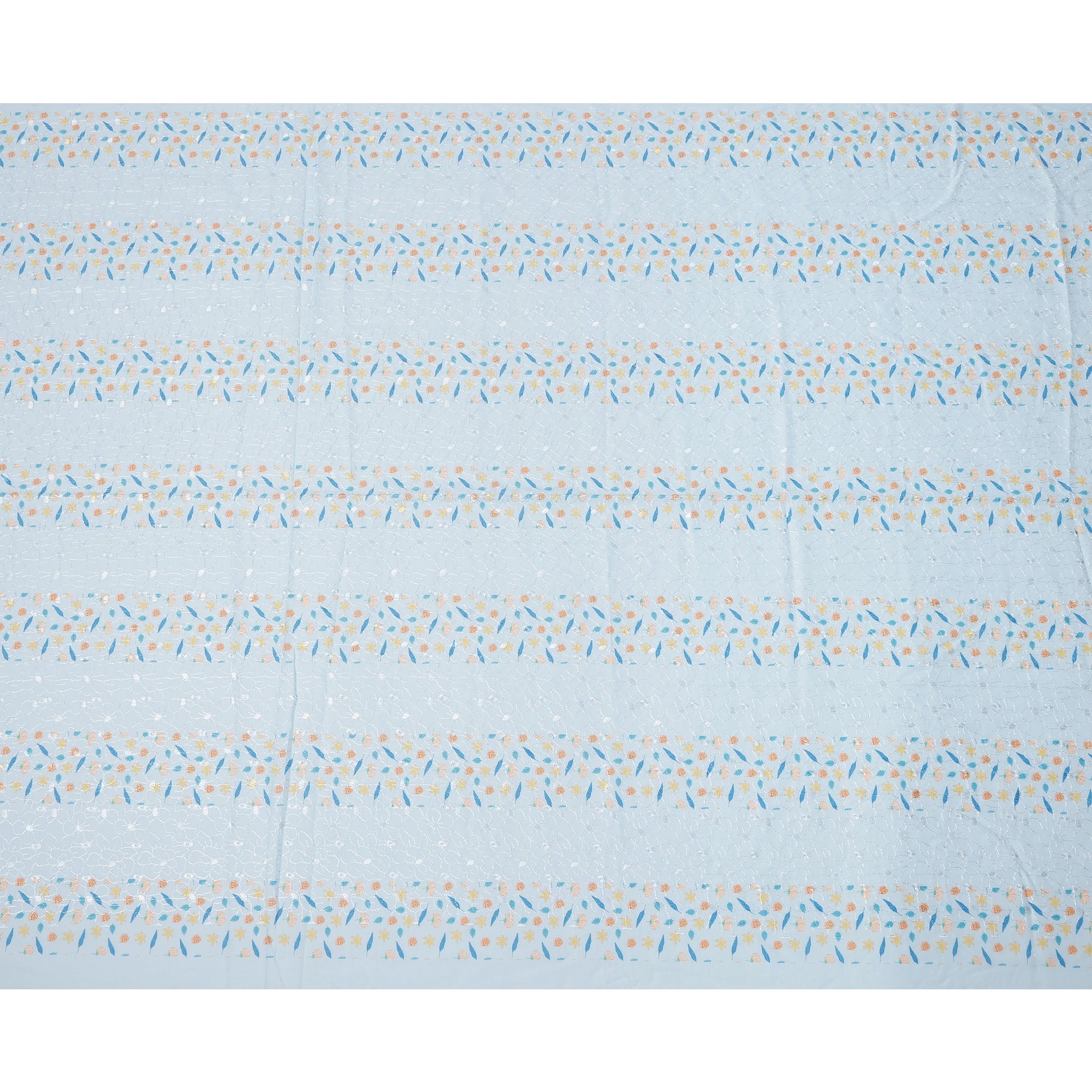 قماش قطني مطرز بنقشة زهور زرقاء فاتحة بتصميم مخطط، عرض 110 سم، الهند - D25204