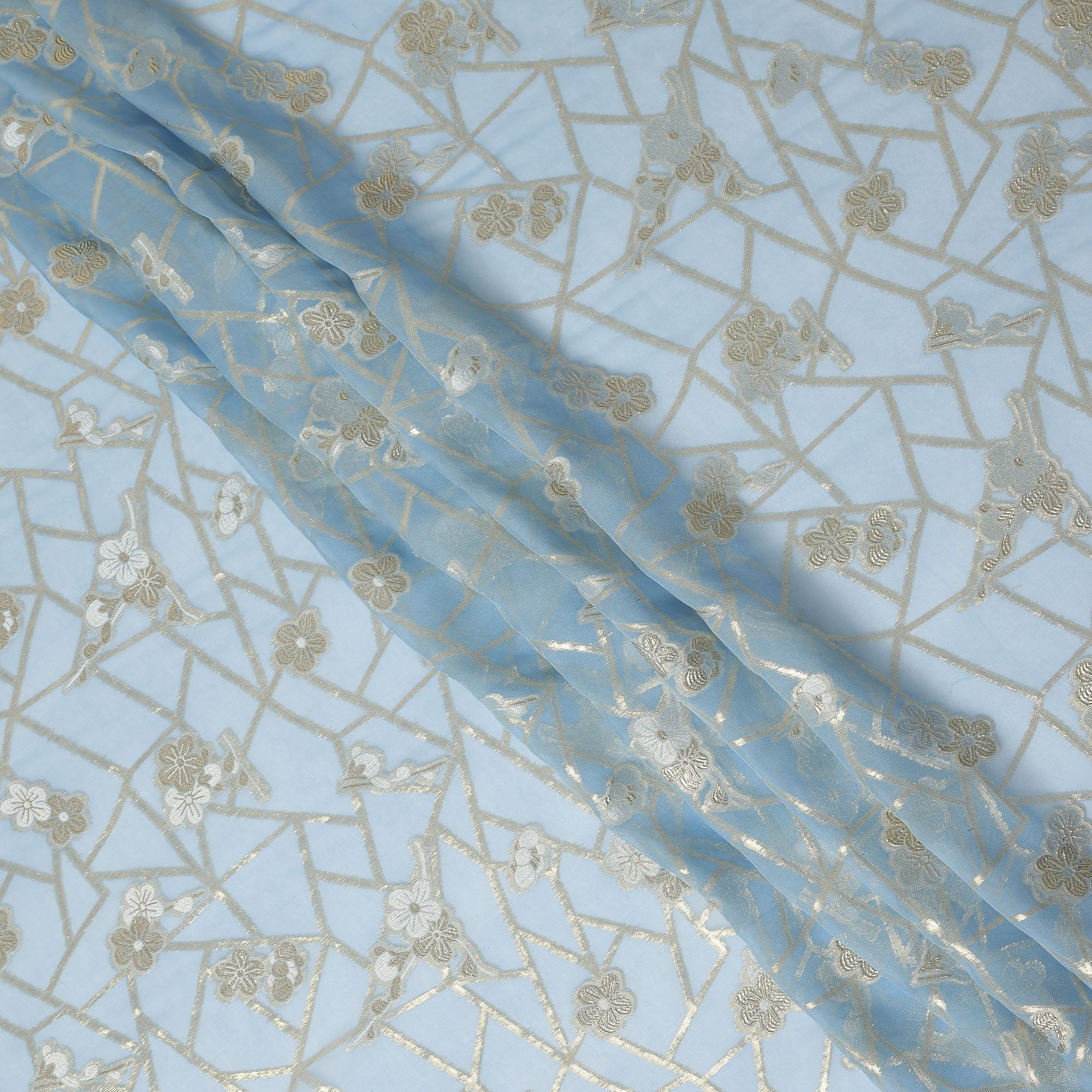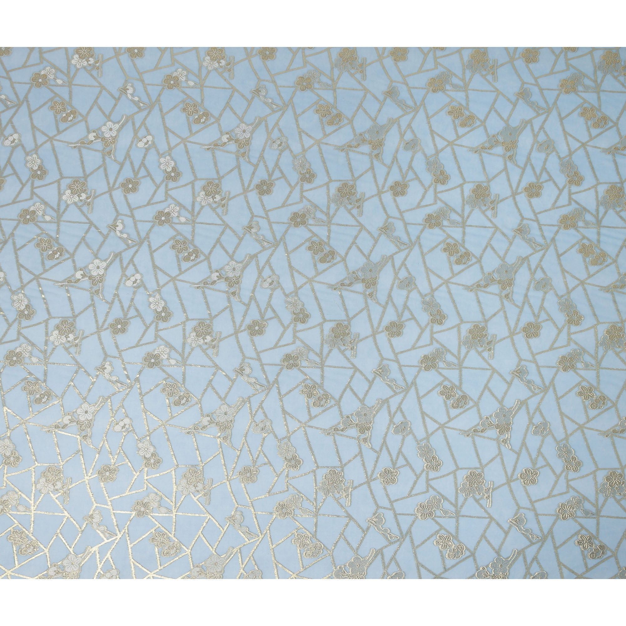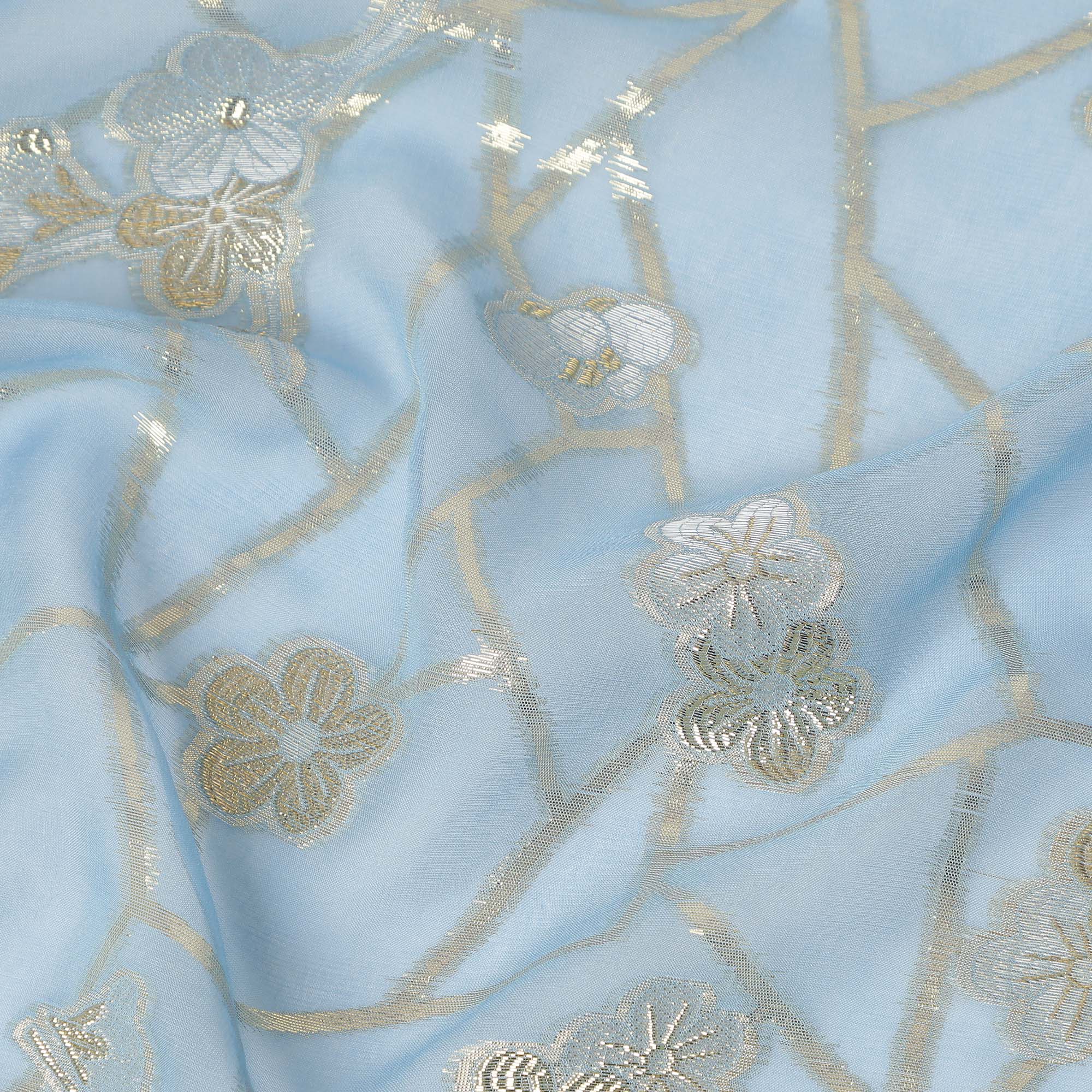 • Light Blue Gold Floral Geometric Metallic Lurex Silk Chiffon Fabric 110 Cms Wide, Made in South Korea-D27544
