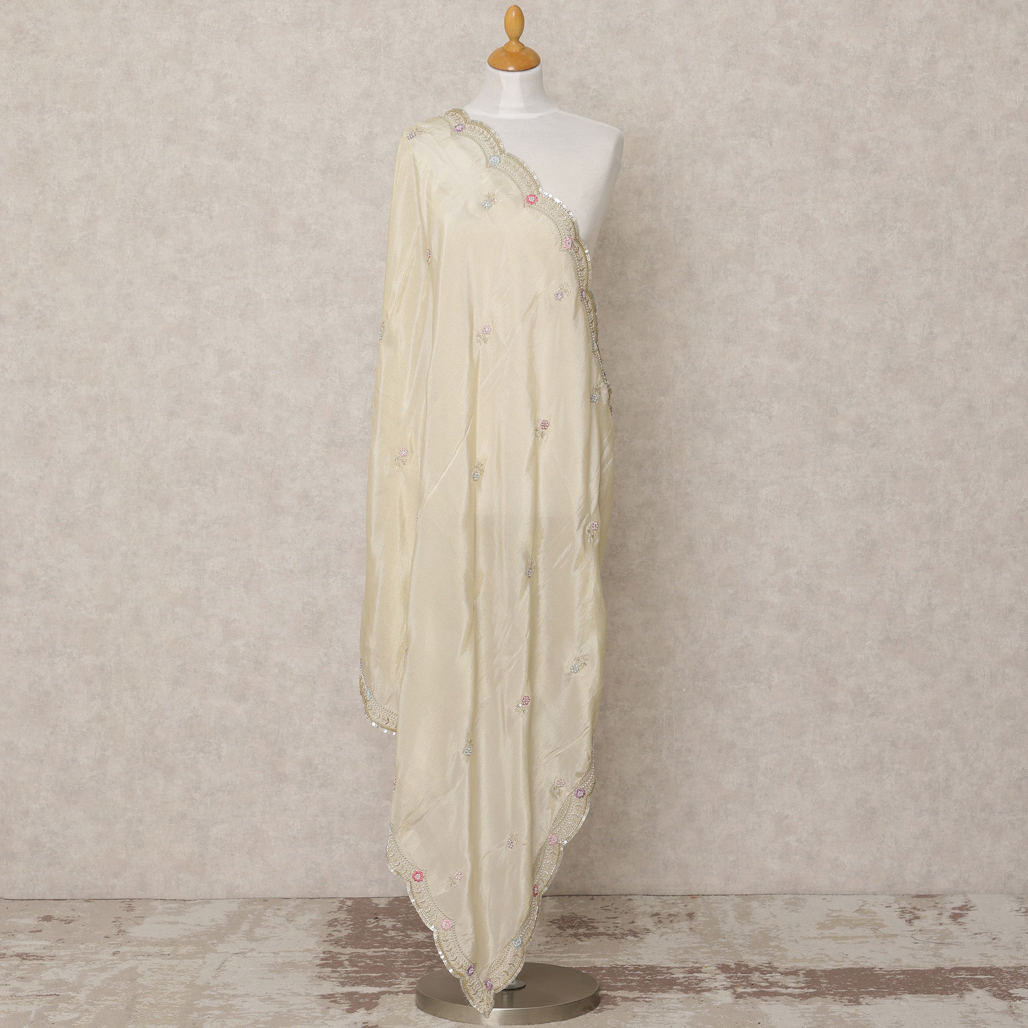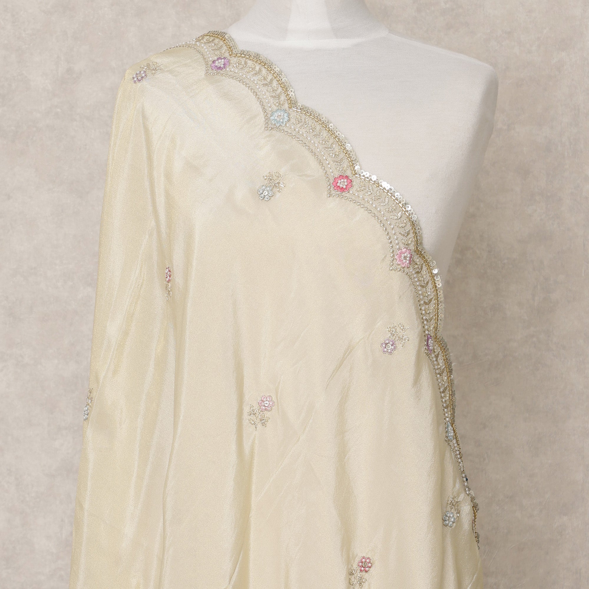 هذه الدوباتا المصنوعة من قماش الديباج الصناعي باللون الذهبي الفاتح، والمصنوعة في الهند، هي قطعة بمقاس 210 × 80 سم تجمع بين اللمعان الرقيق والزخارف المعقدة لإضفاء لمسة عرقية راقية. تتميز قاعدة الديباج الناعمة بلمعان لامع يعزز ثرائها، بينما تنتشر الزخارف الزهرية الرقيقة المطرزة بخيوط متعددة الألوان والترتر اللامع برشاقة على القماش. الميزة البارزة للدوباتا هي حدودها المزخرفة ذات الشكل الصدفي، والمزينة بزري ومرآة تضيف سحرًا احتفاليًا دون التغلب على الأناقة. مثالية للاقتران مع الليهنغا أو بدلات السلوار أو الكورتا الطويلة، يمزج هذا الدوباتا خفيف الوزن بين التقاليد والتنوع ويسهل ارتداؤه لحفلات الزفاف أو الاحتفالات الدينية أو المناسبات الاحتفالية. إضافة جميلة لخزانة ملابسك، تجسد هذه القطعة براعة الصنع وجاذبية خالدة.