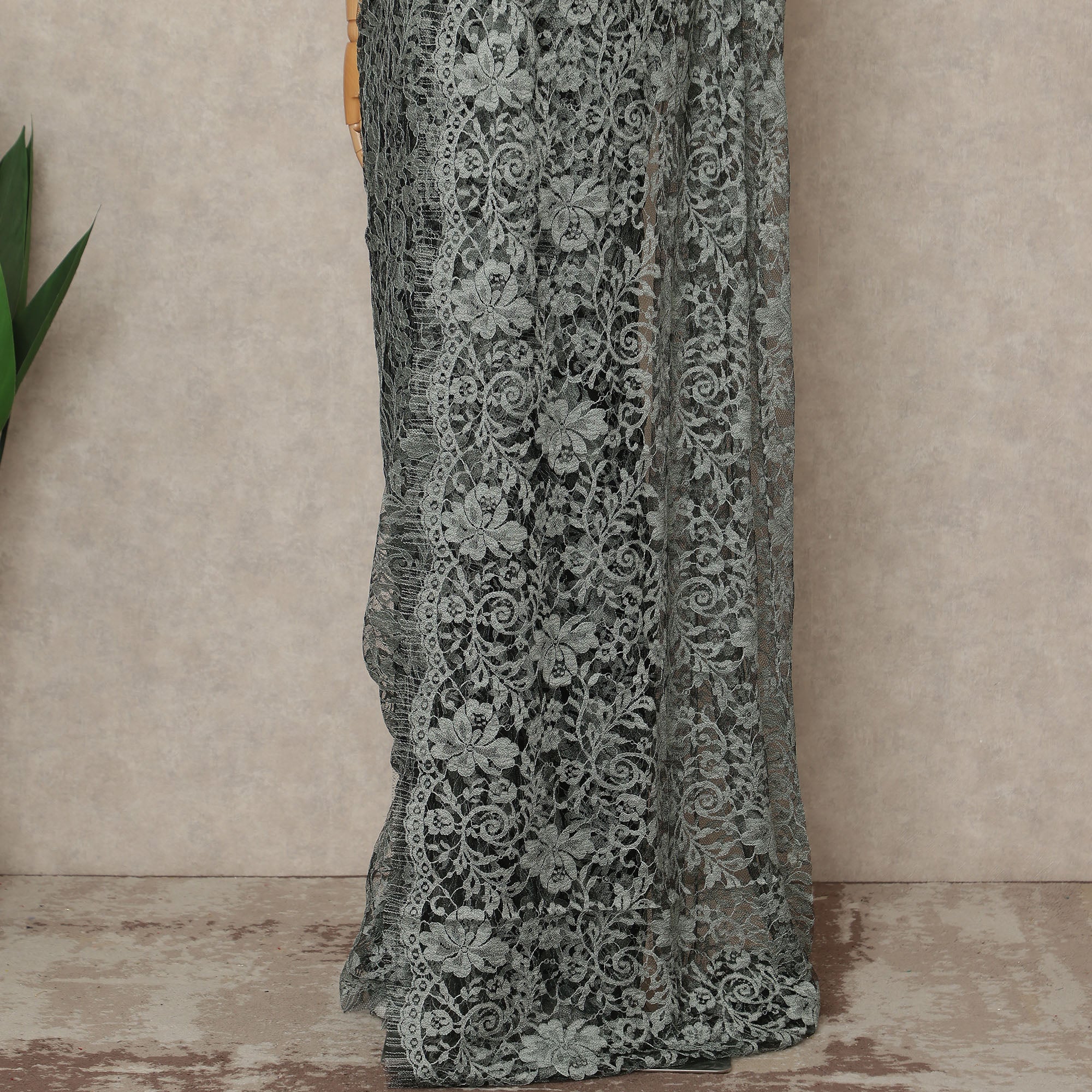 This Light Green 2tone premium French Chantilly saree lace offers a sophisticated blend of soft grey undertones layered with deeper accents, creating a refined and contemporary look. Crafted in France, the intricate floral Chantilly patterns are delicately woven over a fine sheer net base, delivering elegance with a lightweight and graceful drape. The subtle 2tone effect enhances depth and texture, making it an excellent choice for evening occasions, receptions, formal gatherings, and modern bridal styling. Measuring approximately 5.5 meters in length and 110 cms in width, this lace provides ample fabric to create a complete saree ensemble with timeless charm and understated luxury. Blouse not included.