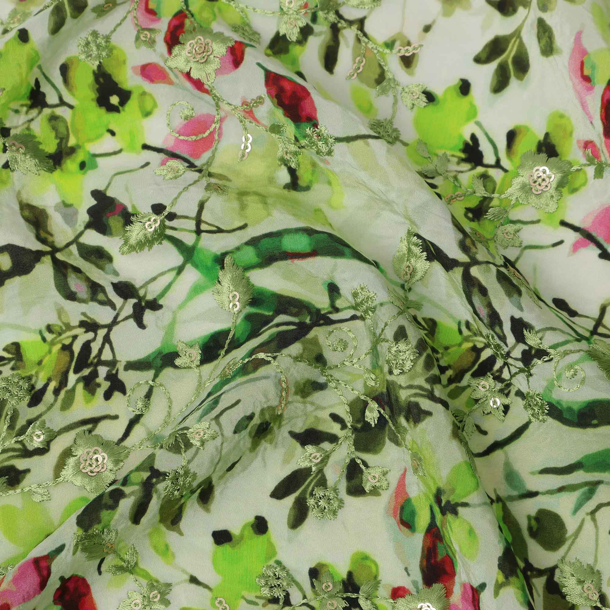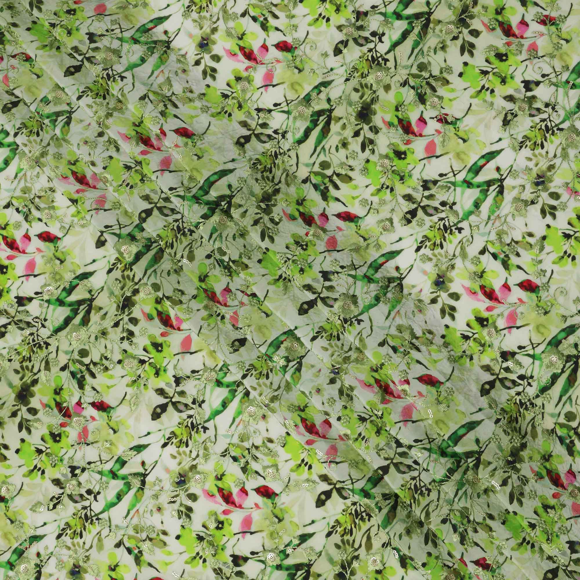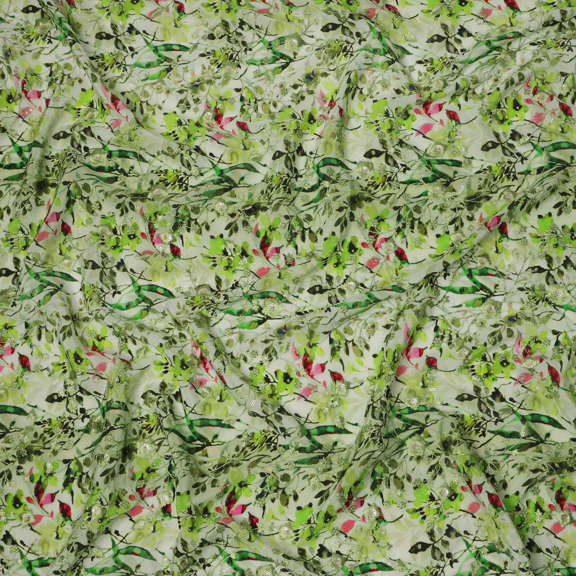 قماش كريب فيسكوز بطبعة رقمية زهرية باللونين الأخضر الفاتح والوردي، عرض 110 سم، صنع في الهند - D23624