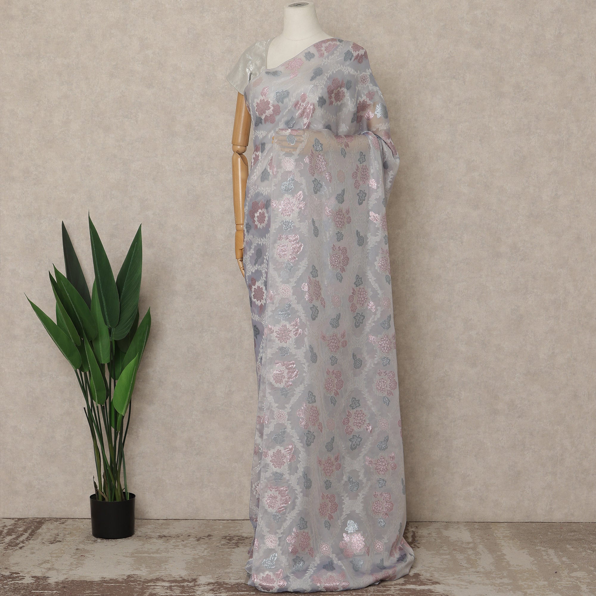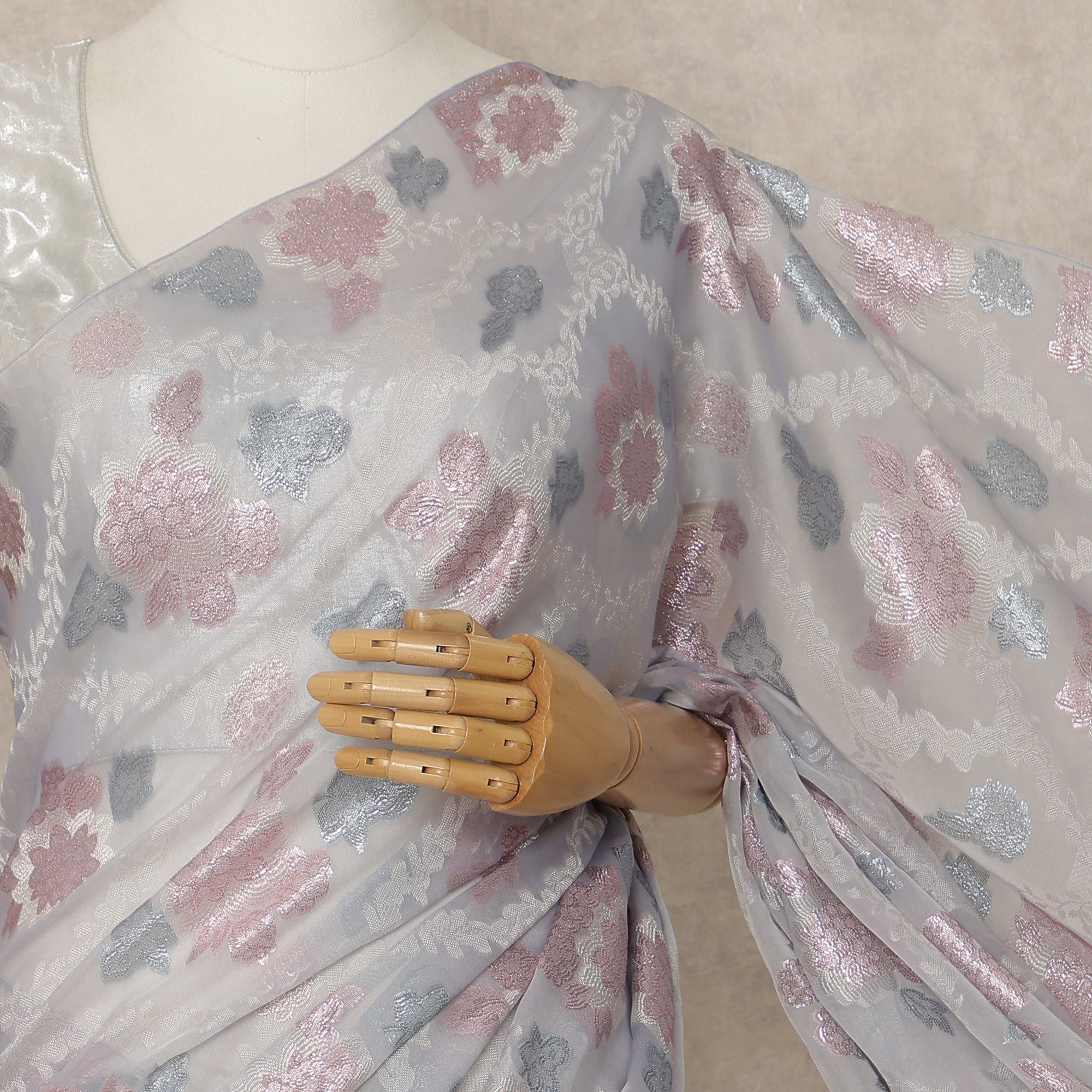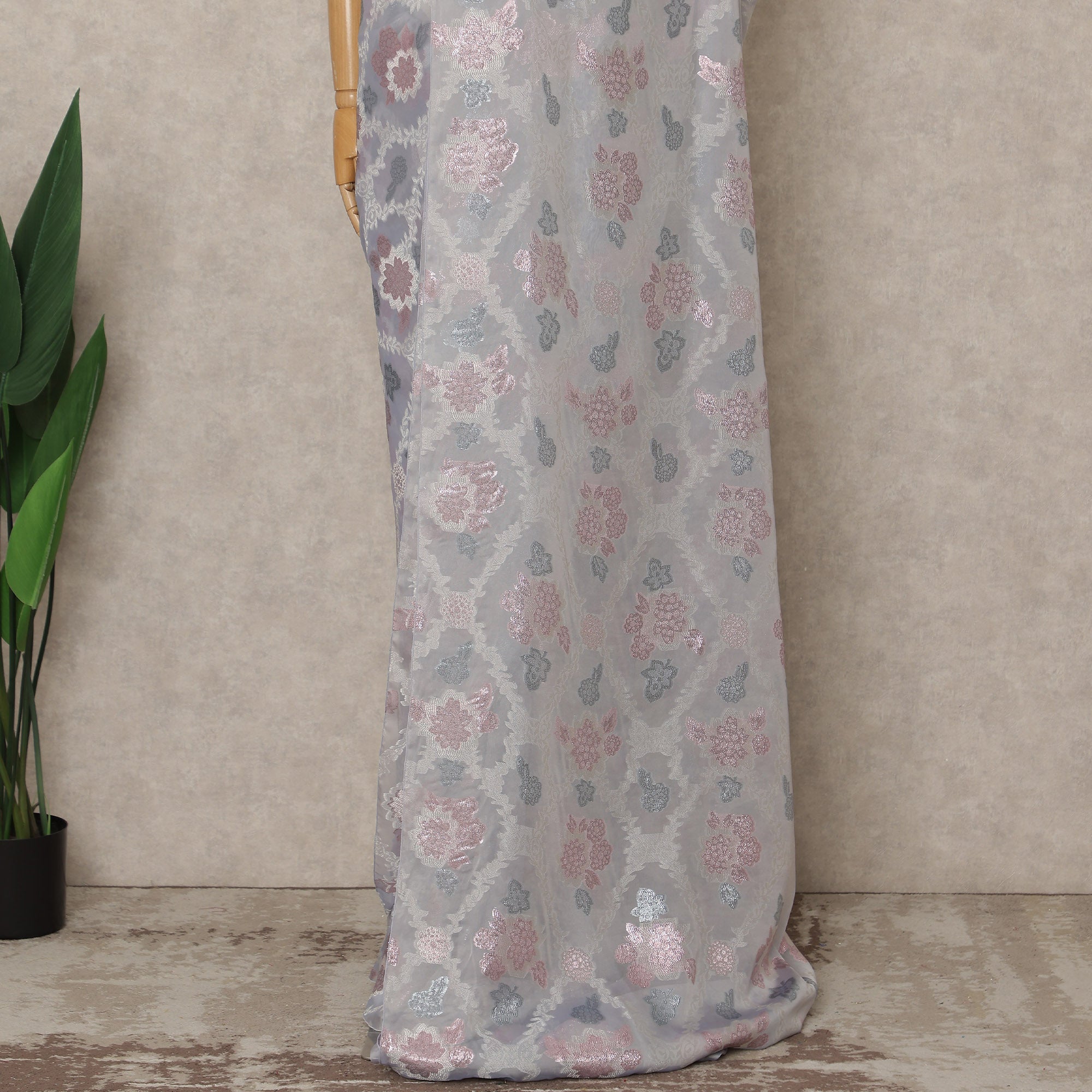 Elegant light grey base highlighted with pink and silver floral woven design.