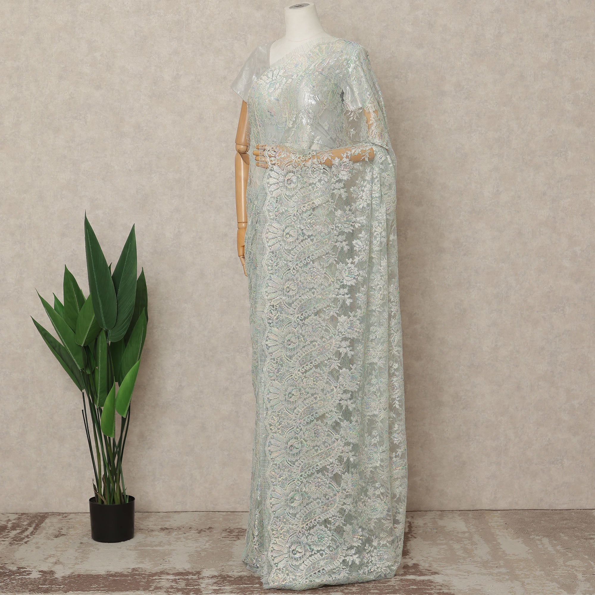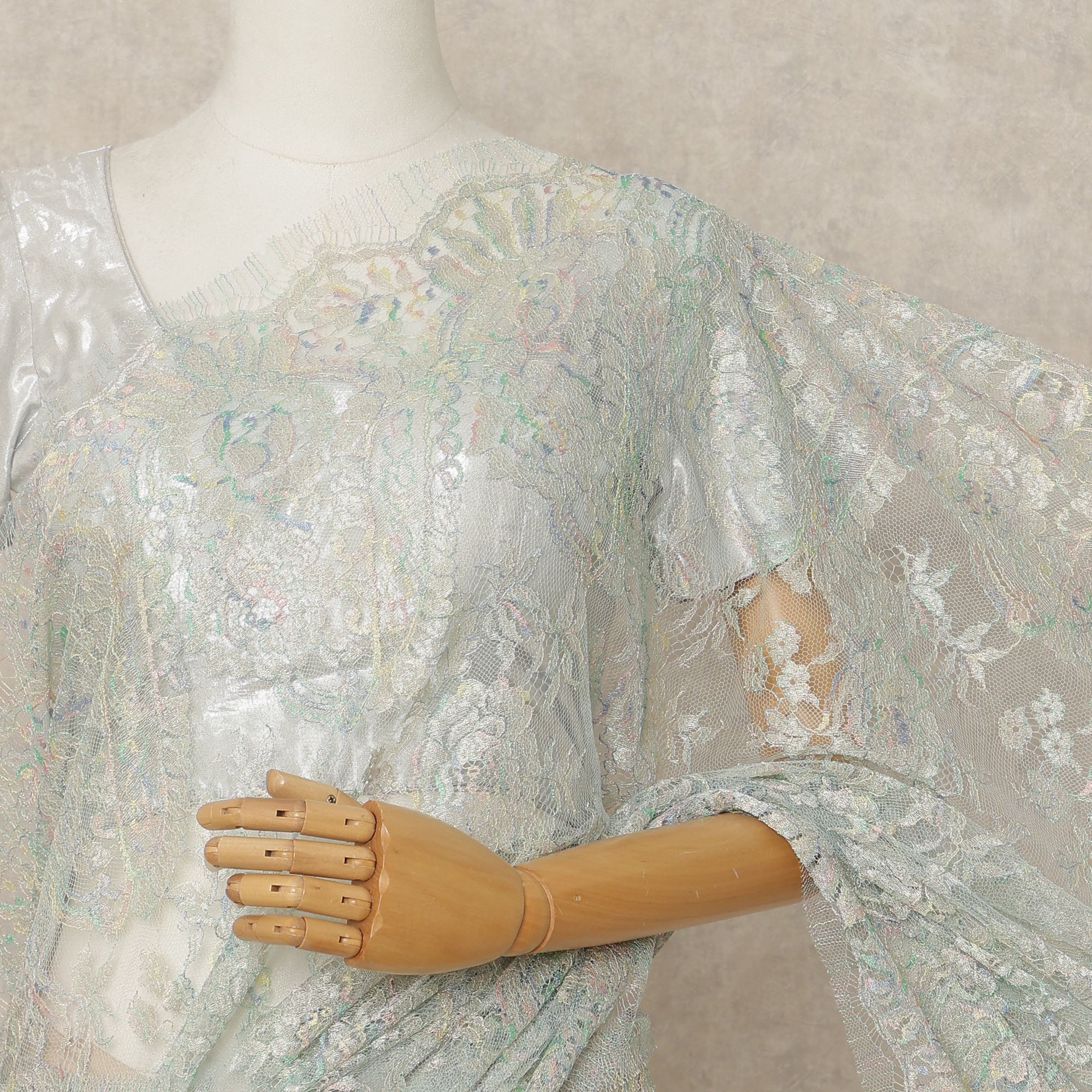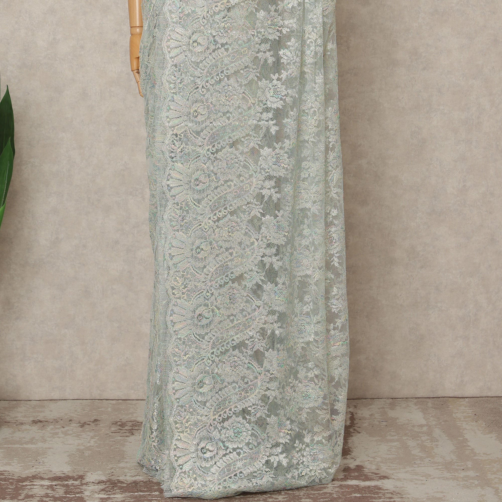 Light Mint Iridescent Premium French Metallic Chantilly Lace Saree Fabric, 5.5 Mtrs Length, 110 Cms Width, Crafted in France – Exquisite Multitone Floral Lace, Blouse Not Included-D26411