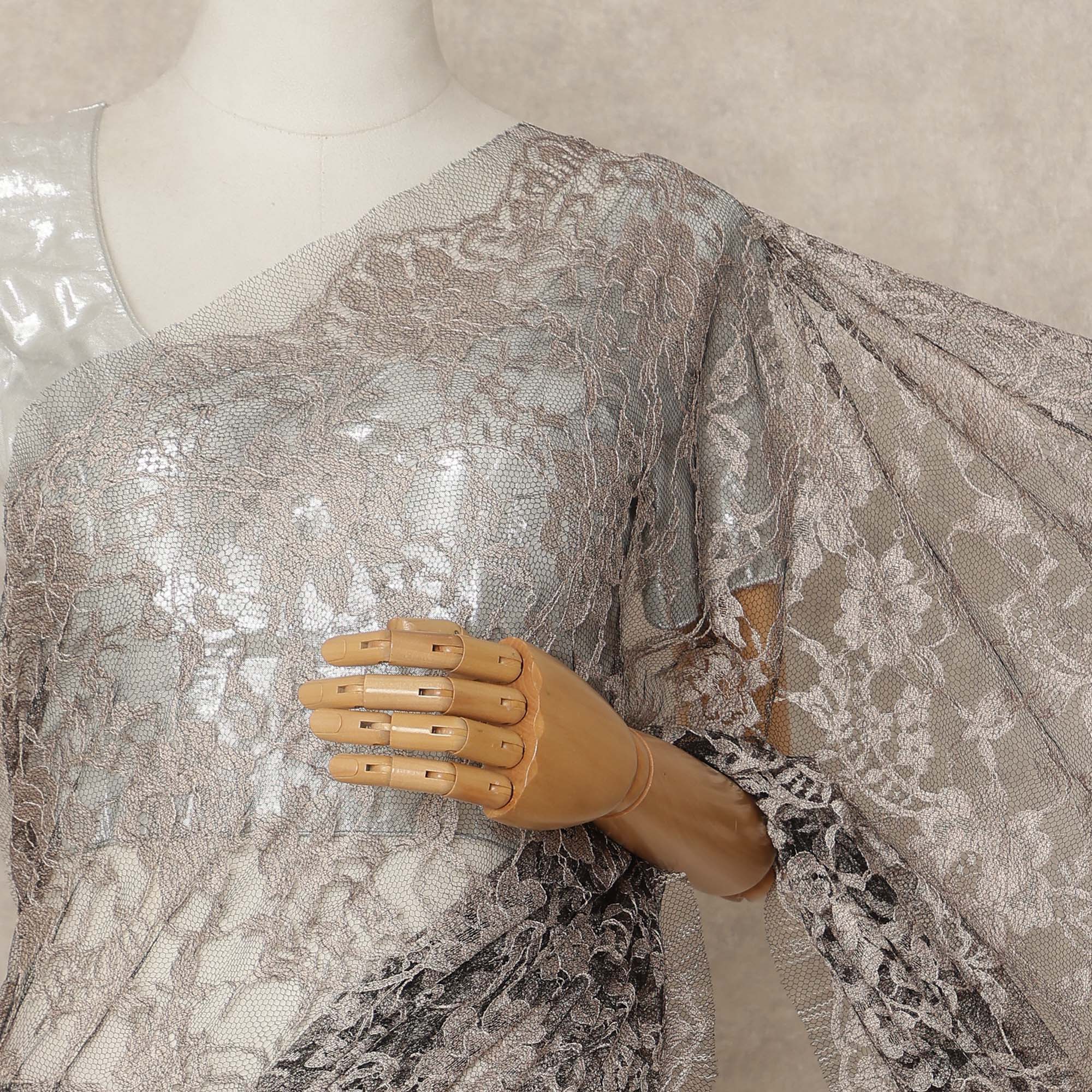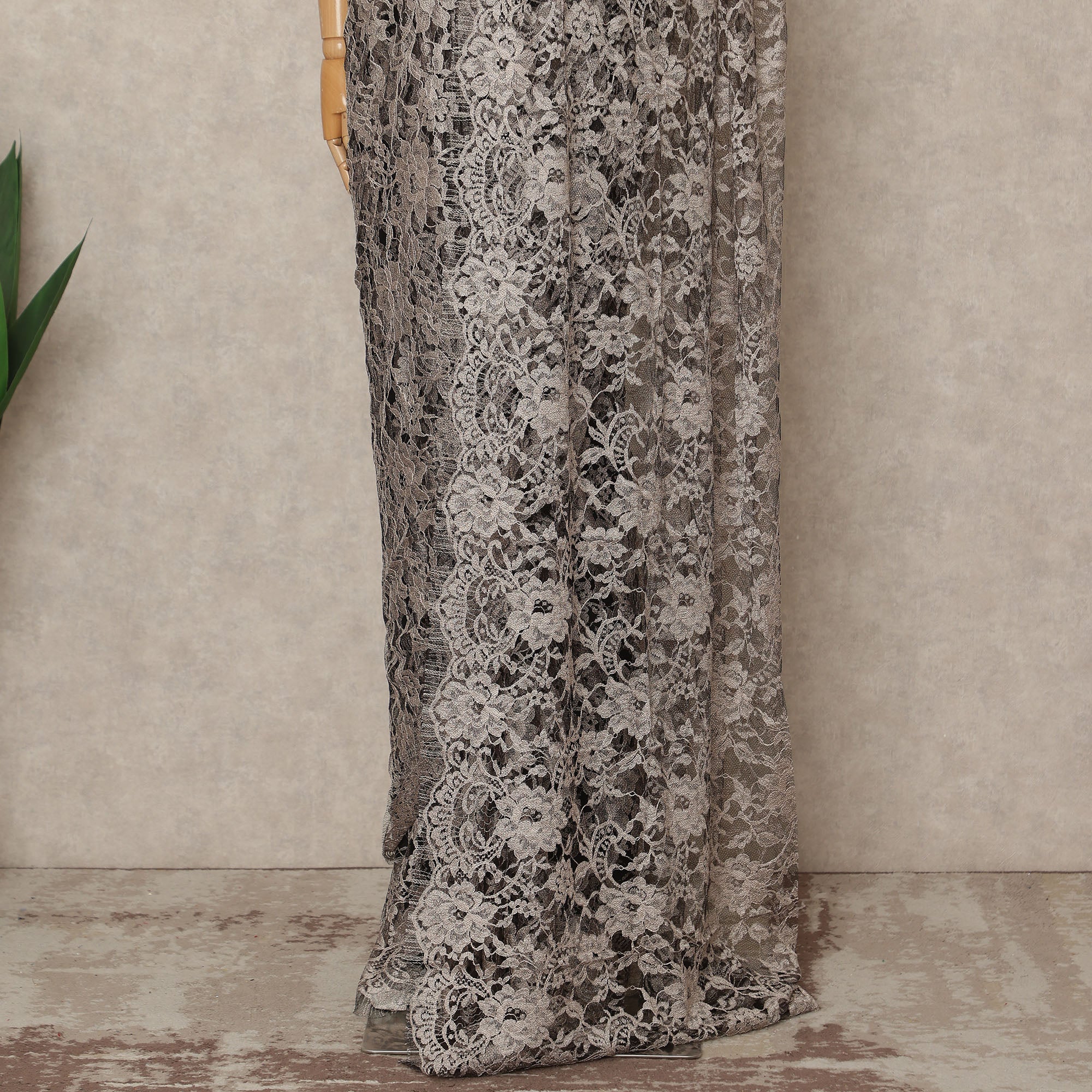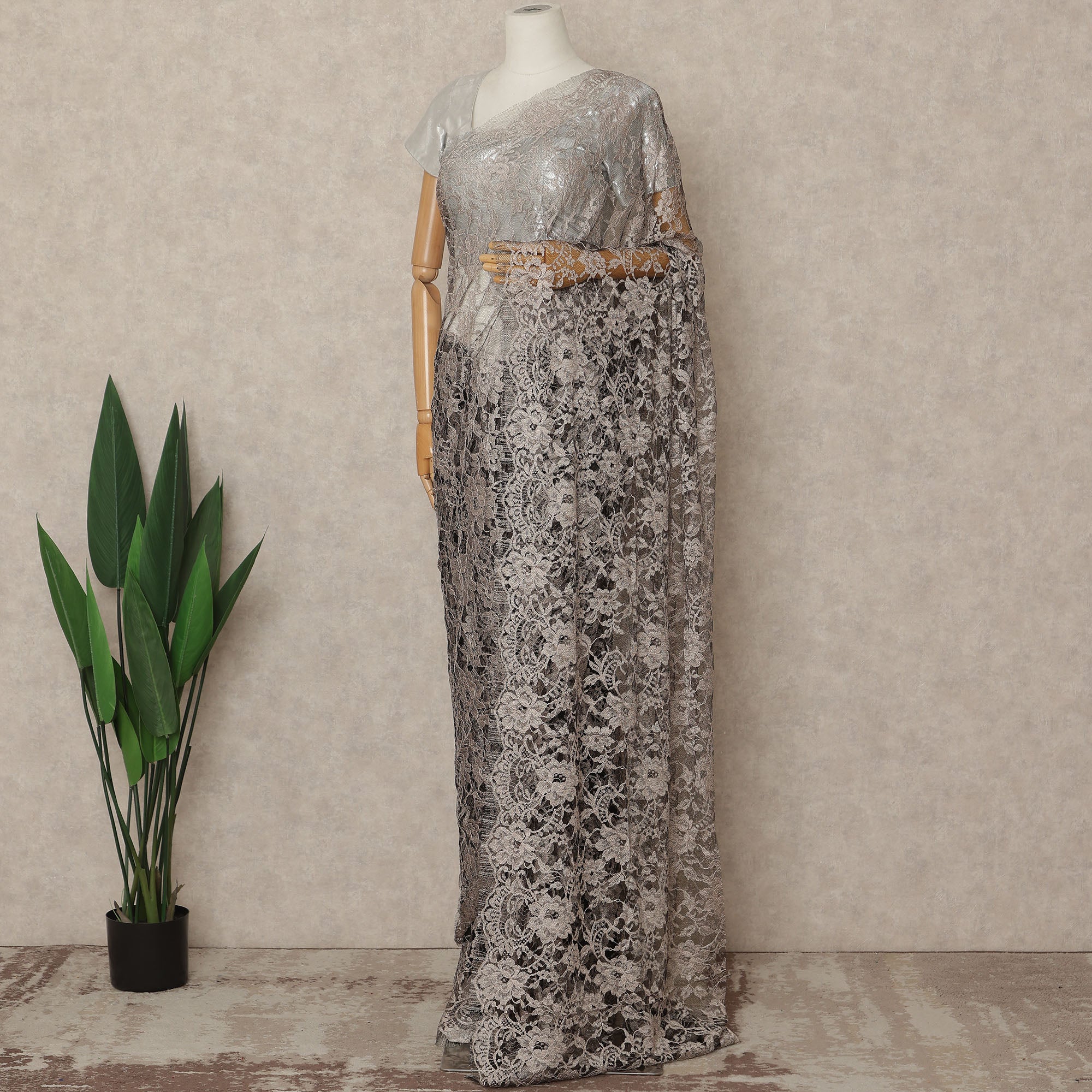 This Light Pink 2tone premium French Chantilly saree lace reflects understated luxury with its elegant blend of soft taupe and grey tones intricately woven over a delicate sheer net base. Expertly crafted in France, the refined Chantilly floral and vine motifs create beautiful depth and dimension through its subtle dual tone effect. The lightweight, airy texture ensures a smooth and graceful drape that enhances the silhouette, making it an ideal choice for evening gatherings, formal occasions, and sophisticated celebrations. Measuring approximately 5.5 meters in length and 110 cms in width, this lace offers generous coverage for a complete saree look with timeless charm. Blouse not included.