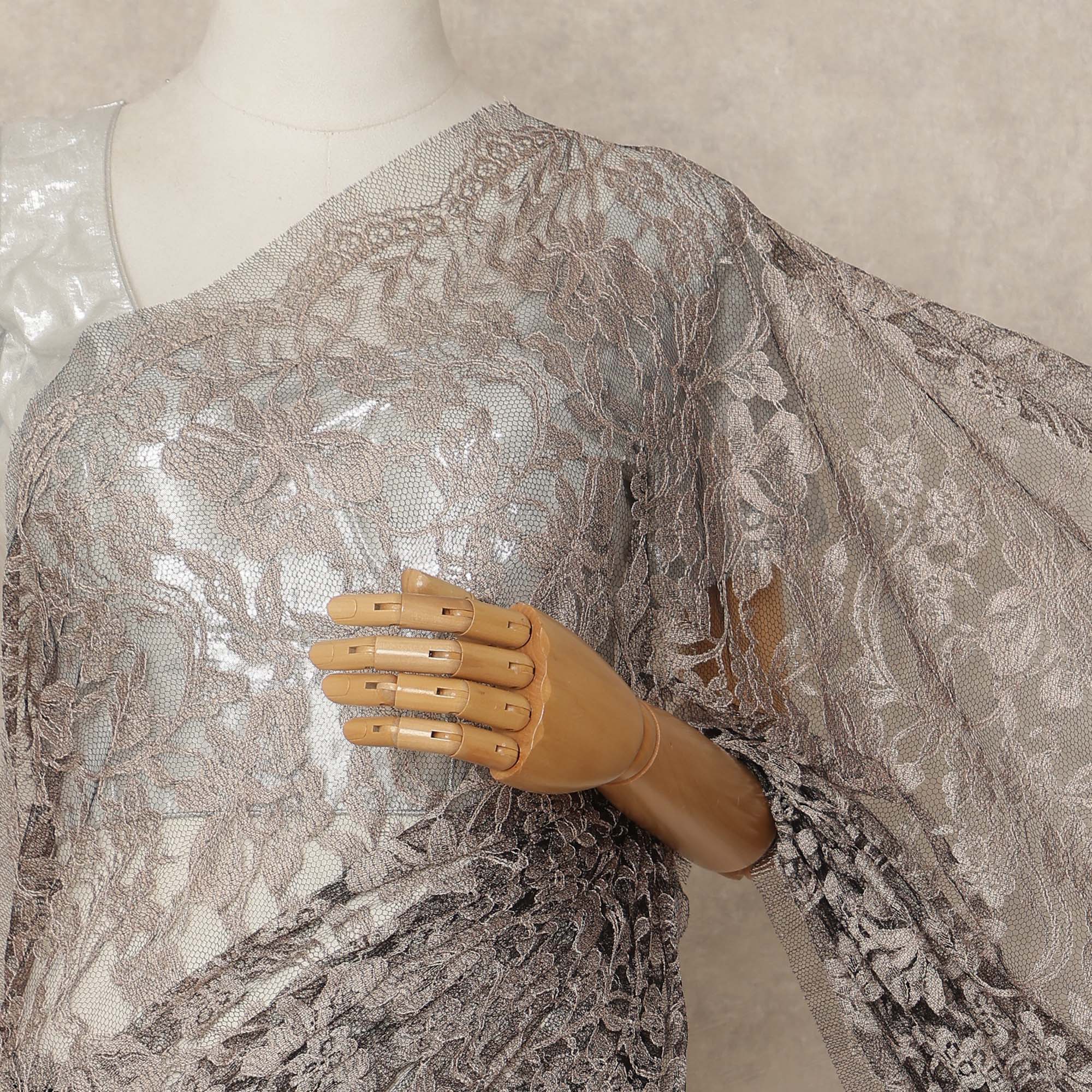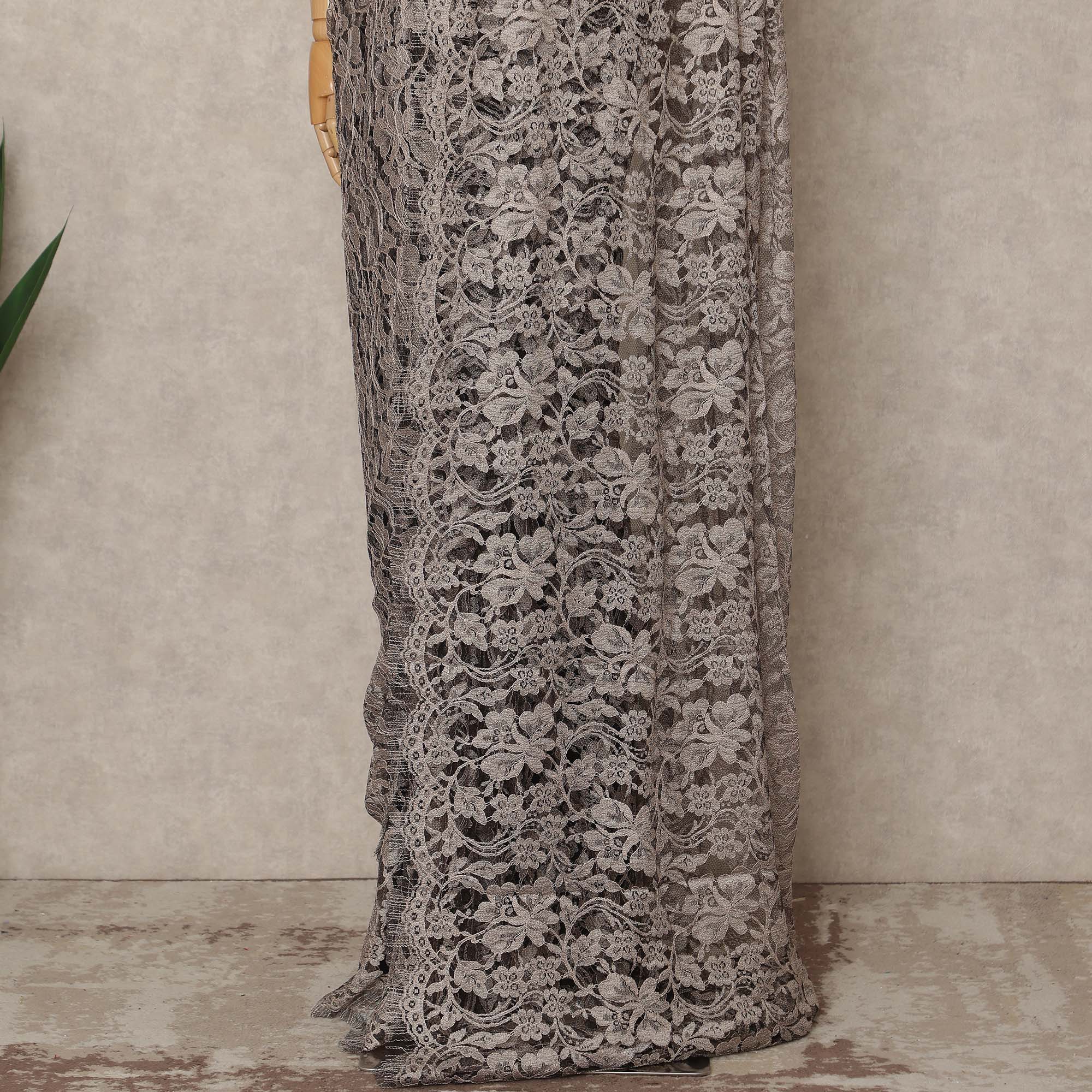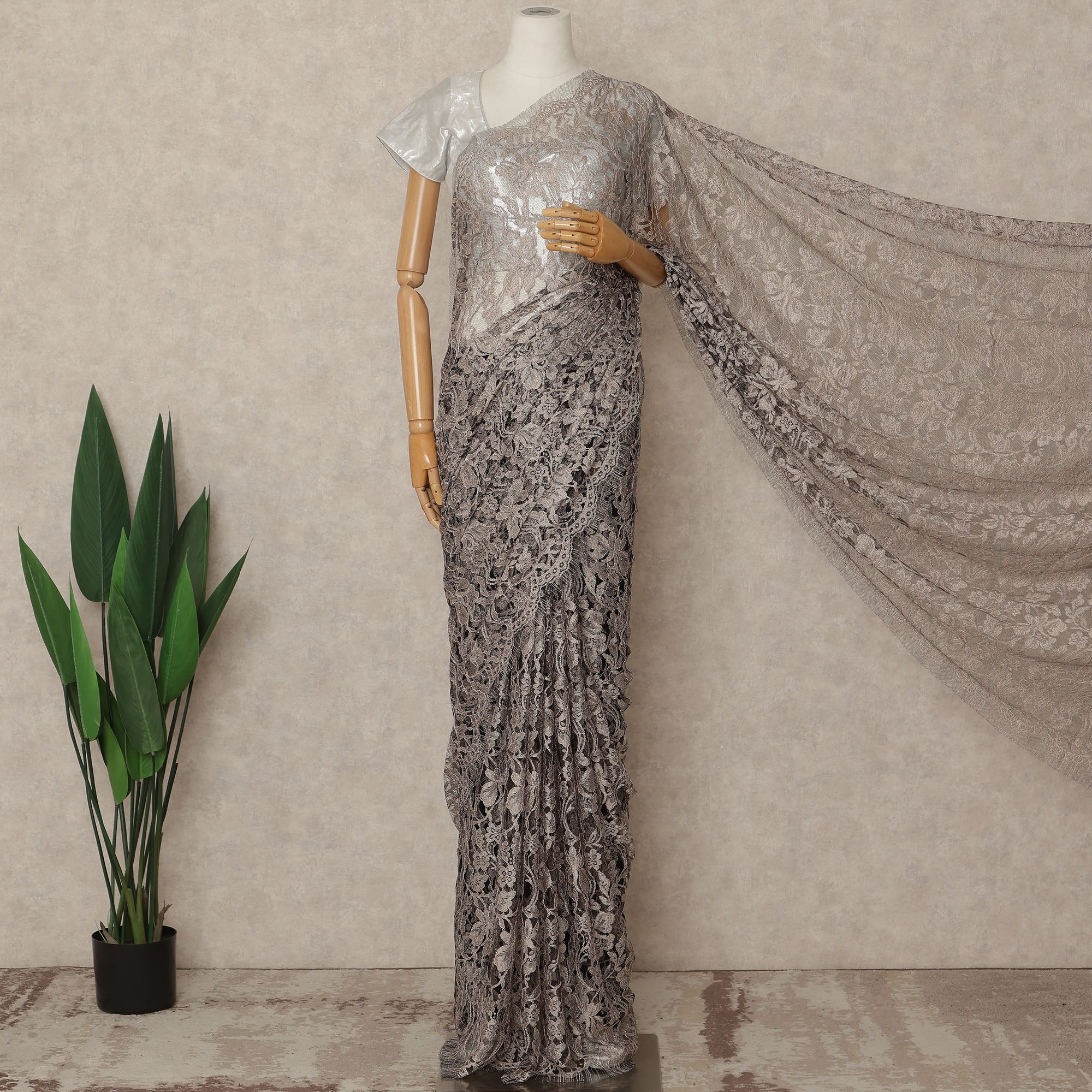 This Light Pink 2tone premium French Chantilly saree lace embodies understated luxury with its delicately woven floral motifs layered over a fine sheer net base, creating depth and refined texture. Crafted in France, the elegant two-tone interplay of soft brown and muted metallic hues enhances its sophisticated charm, making it ideal for evening occasions, receptions, festive gatherings, and couture ensembles. The lightweight construction ensures a fluid, graceful drape while maintaining a rich designer appeal. Measuring approximately 5.5 meters in length and 110 cms in width, this lace provides ample fabric to create a complete saree with timeless elegance and modern refinement. Blouse not included.