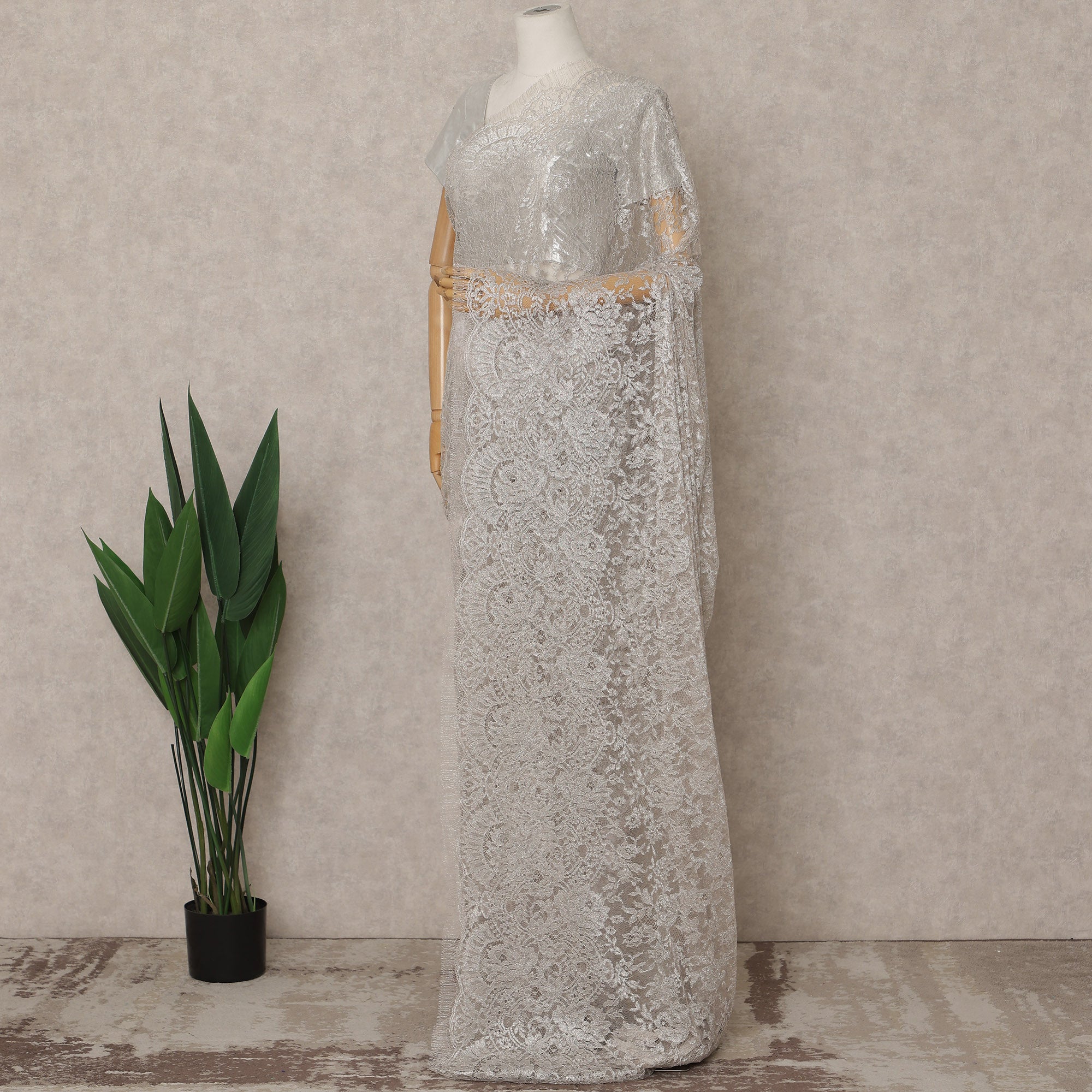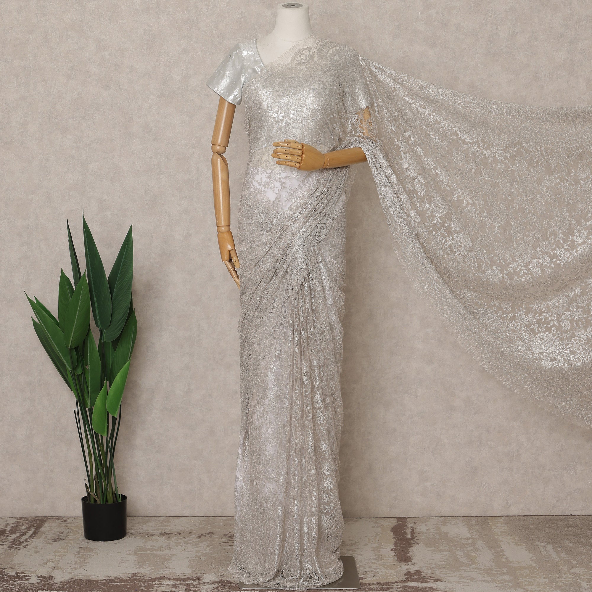 This Light Pink Premium French Metallic Chantilly Lace Saree is a breathtaking example of refined elegance, beautifully combining a pristine white undertone with a radiant silver metallic sheen that highlights the saree’s luxurious craftsmanship. Made in France using authentic Chantilly weaving techniques, the saree features intricately detailed floral and vine motifs that shimmer gracefully across the fabric, creating a couture-inspired finish ideal for weddings, receptions, cocktail events, festive occasions, and sophisticated evening functions. The sheer, feather-light lace drapes effortlessly, forming fluid pleats and enhancing the saree’s ethereal charm. Despite its opulent appearance, the fabric maintains exceptional comfort, offering a generous 5.5-meter length and a 110 cm width that allow graceful styling for both traditional and contemporary looks. Crafted with Regal-quality precision, the metallic lace is durable yet delicate in appearance, ensuring longevity when cared for with gentle dry-clean maintenance. The luminous silver-white palette brings a serene, modern sophistication that pairs beautifully with silver, white, or embellished blouses for a complete designer ensemble. Shop online and buy online to experience the harmony of French artistry, metallic brilliance, and timeless elegance captured in this exquisite saree. (Blouse not included)