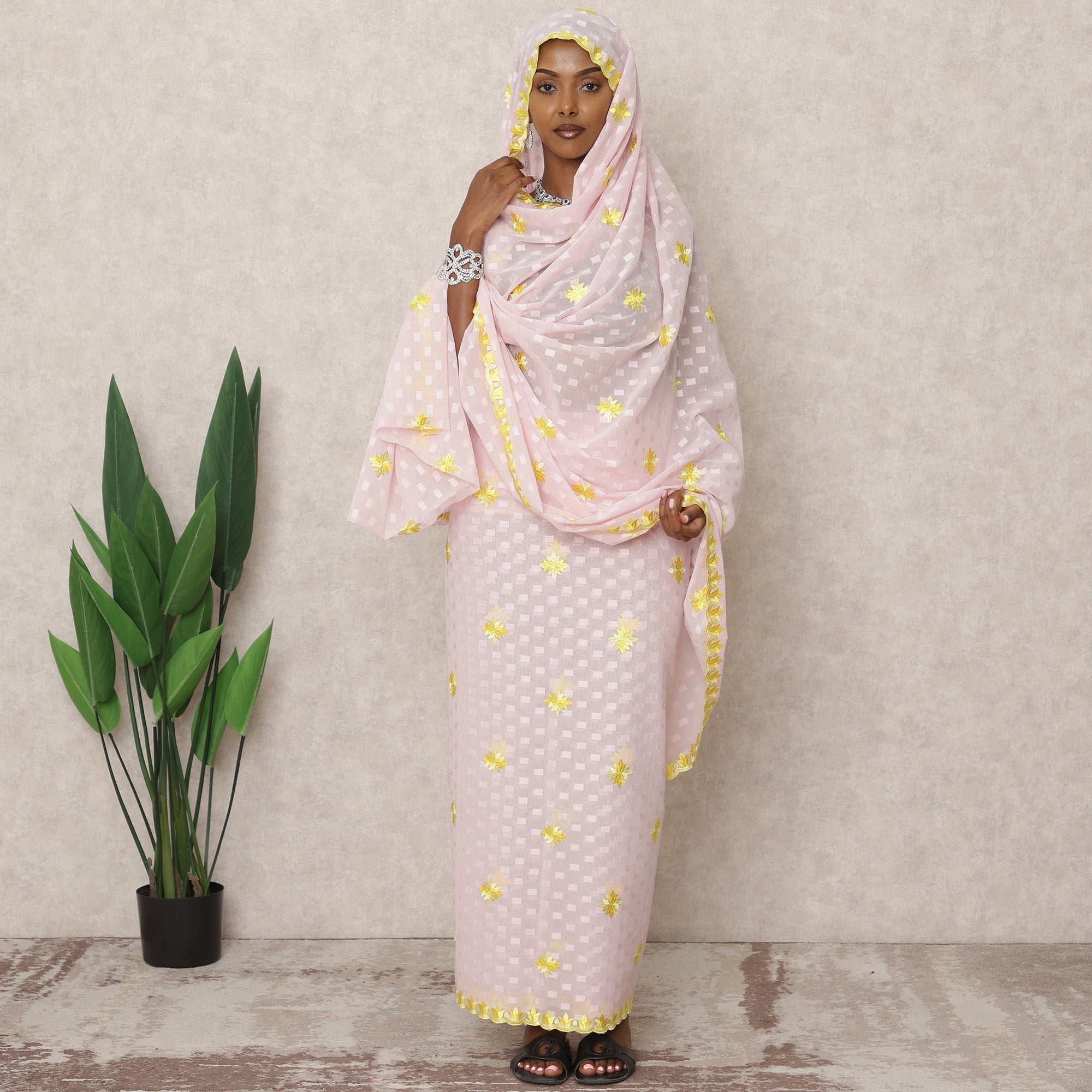 ثوب سوداني تقليدي وردي فاتح مع تطريز زهور صفراء، قطعة 4.5 متر، قماش قطني خالص، عرض 140 سم، صنع في الهند - D24471