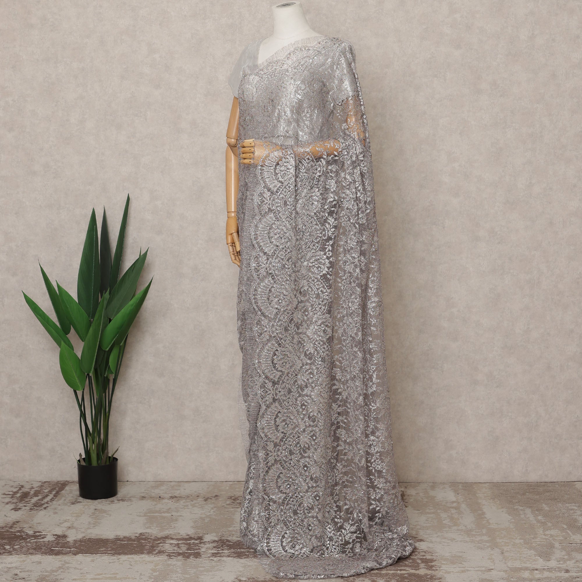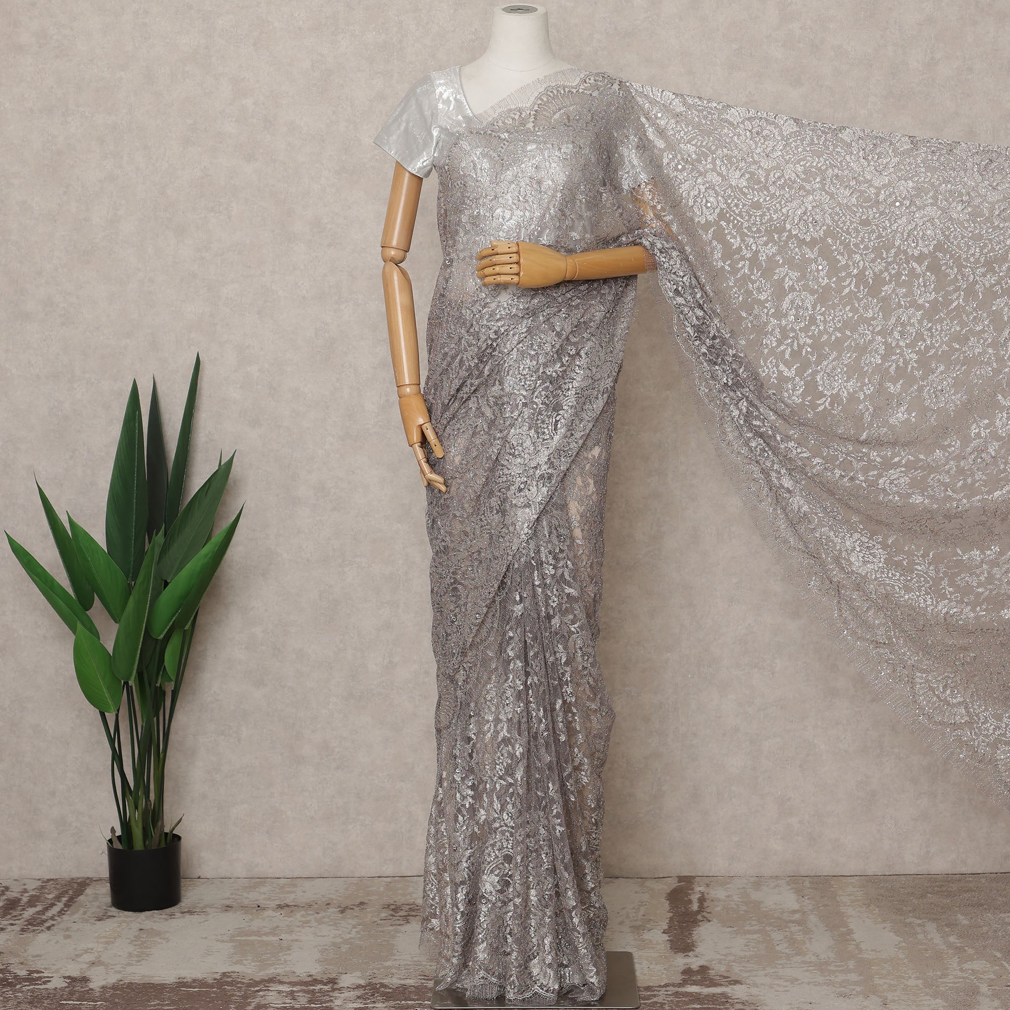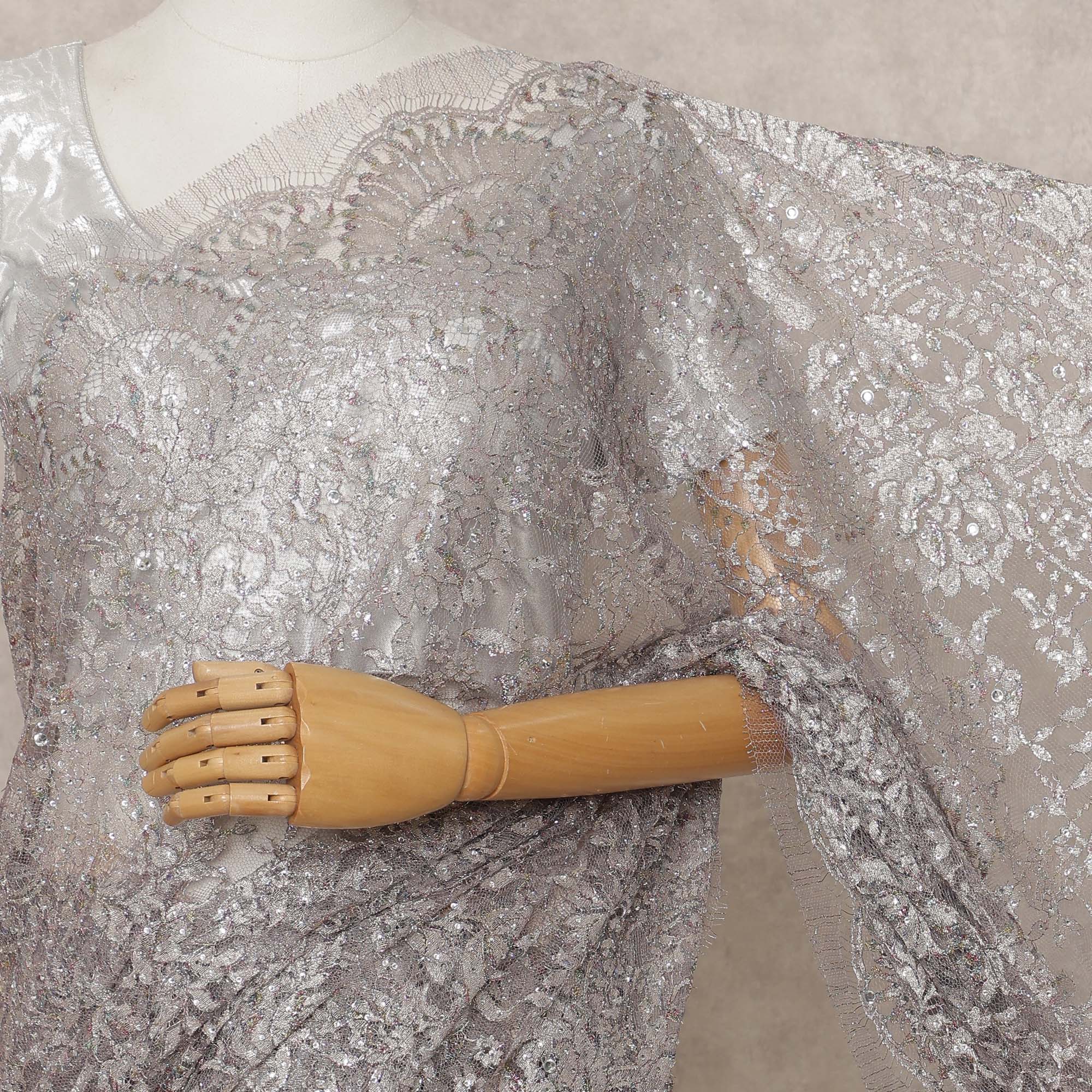 ساري فرنسي فاخر من الدانتيل الشانتيلي باللون الأرجواني البلاتيني الفاتح مع لمعان معدني