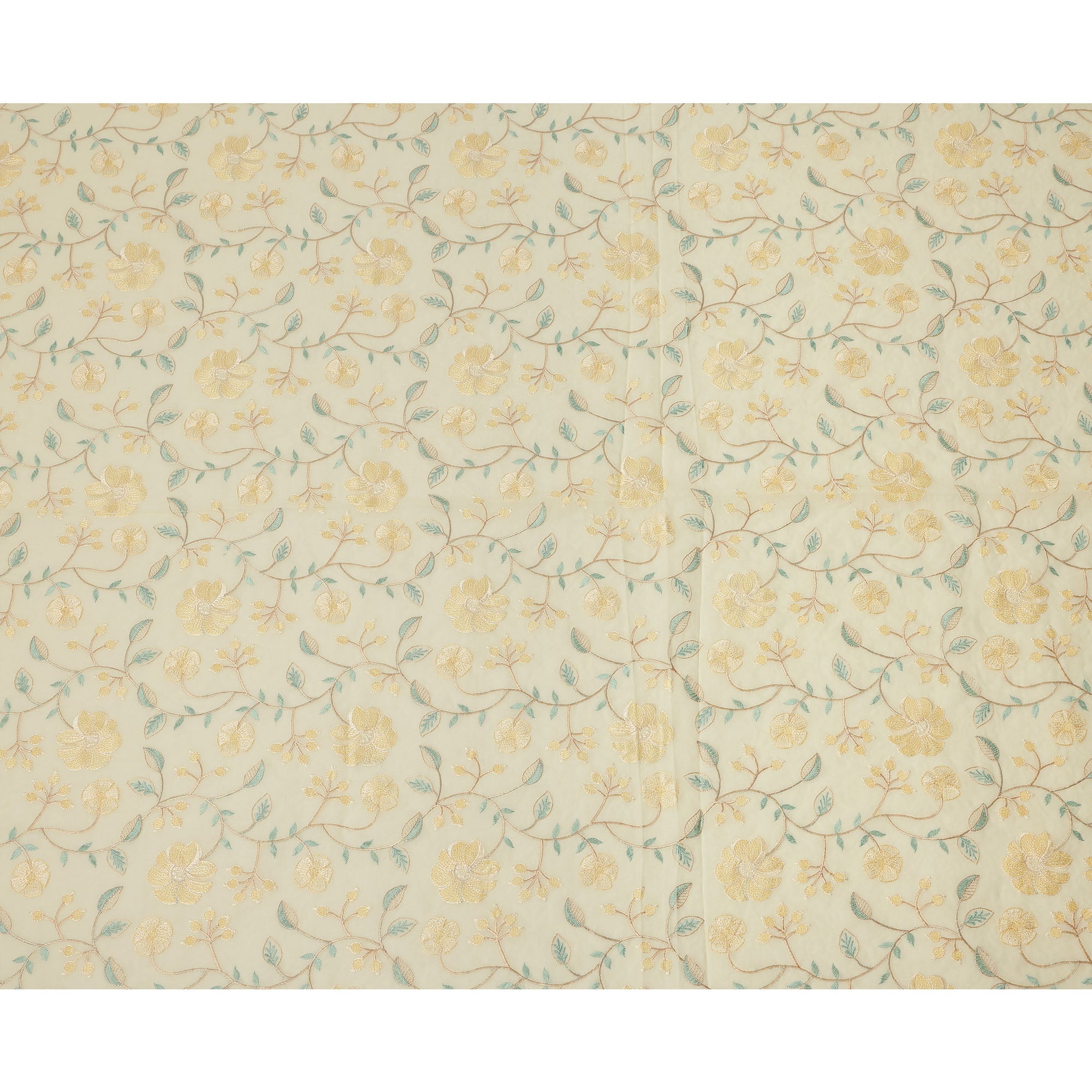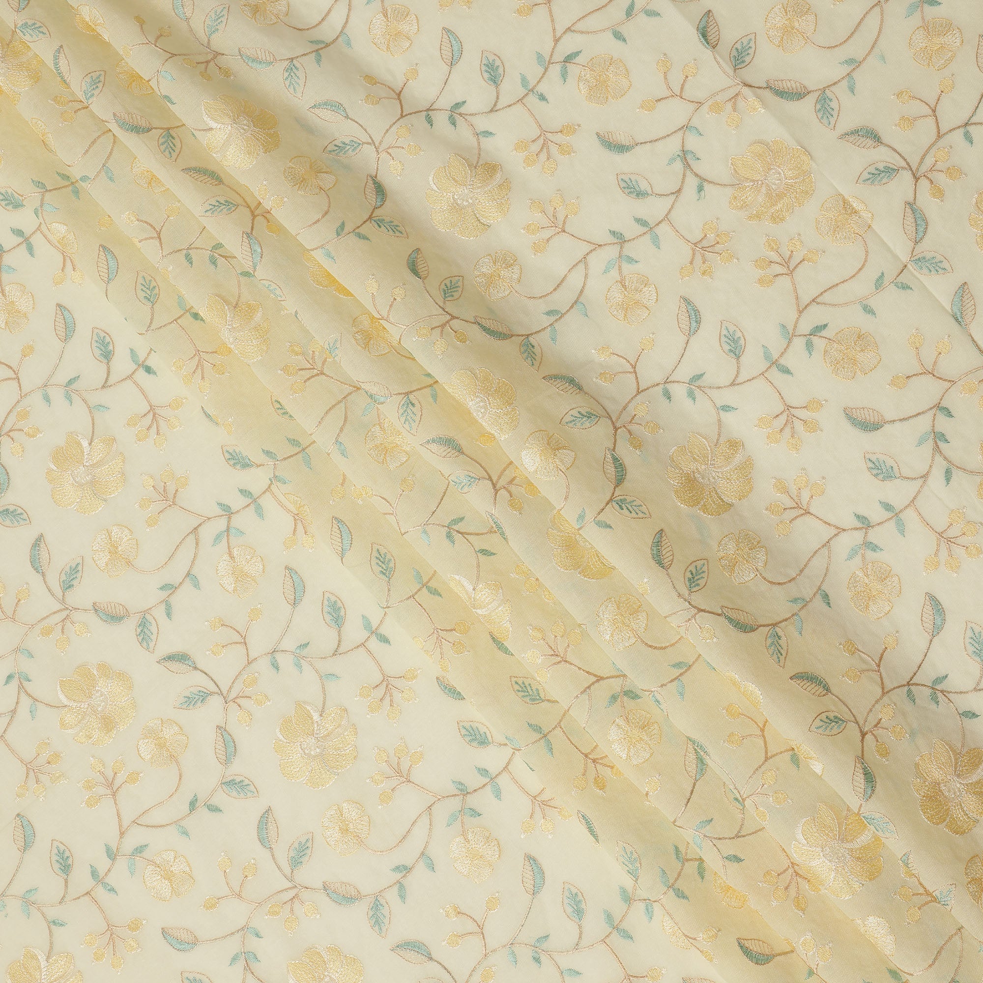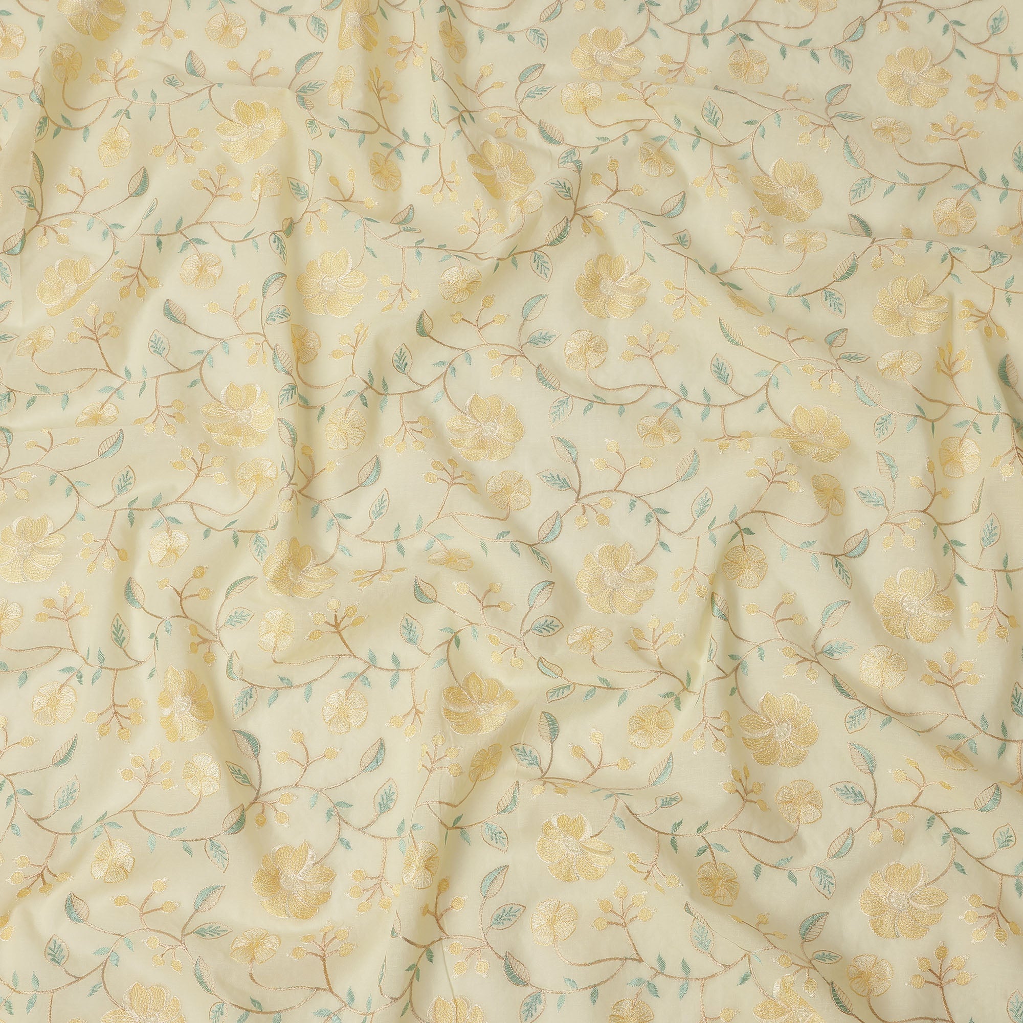 قماش فوال قطني أصفر فاتح مطرز بزهور ذهبية، عرض 110 سم، الهند - D25311