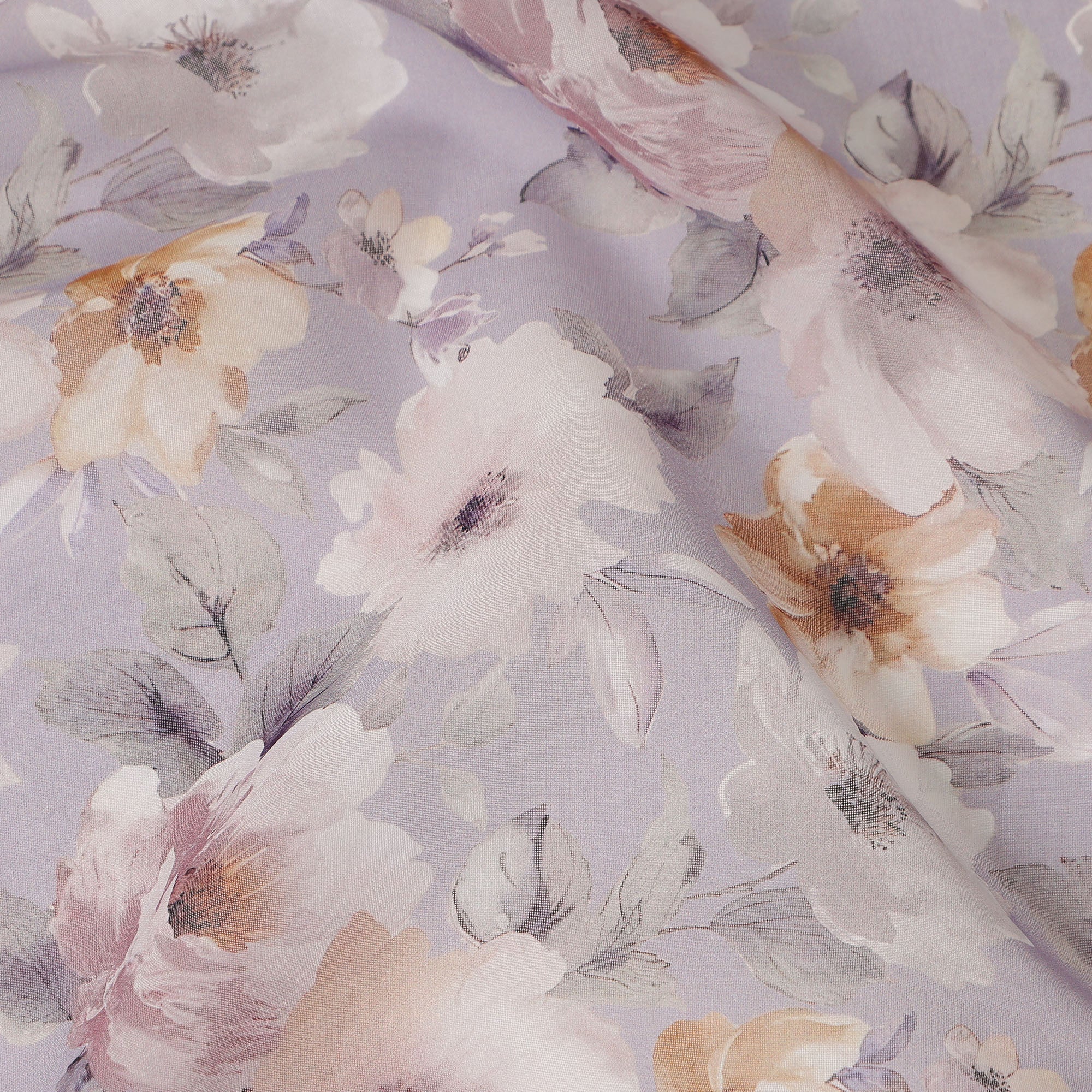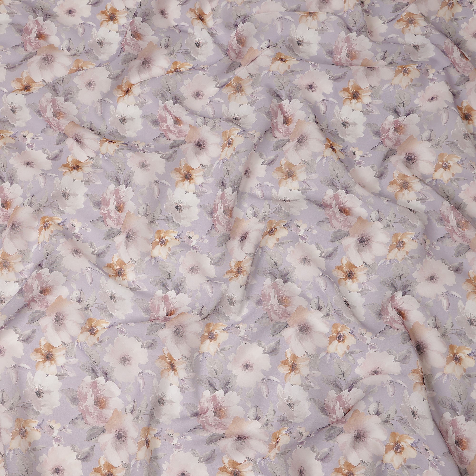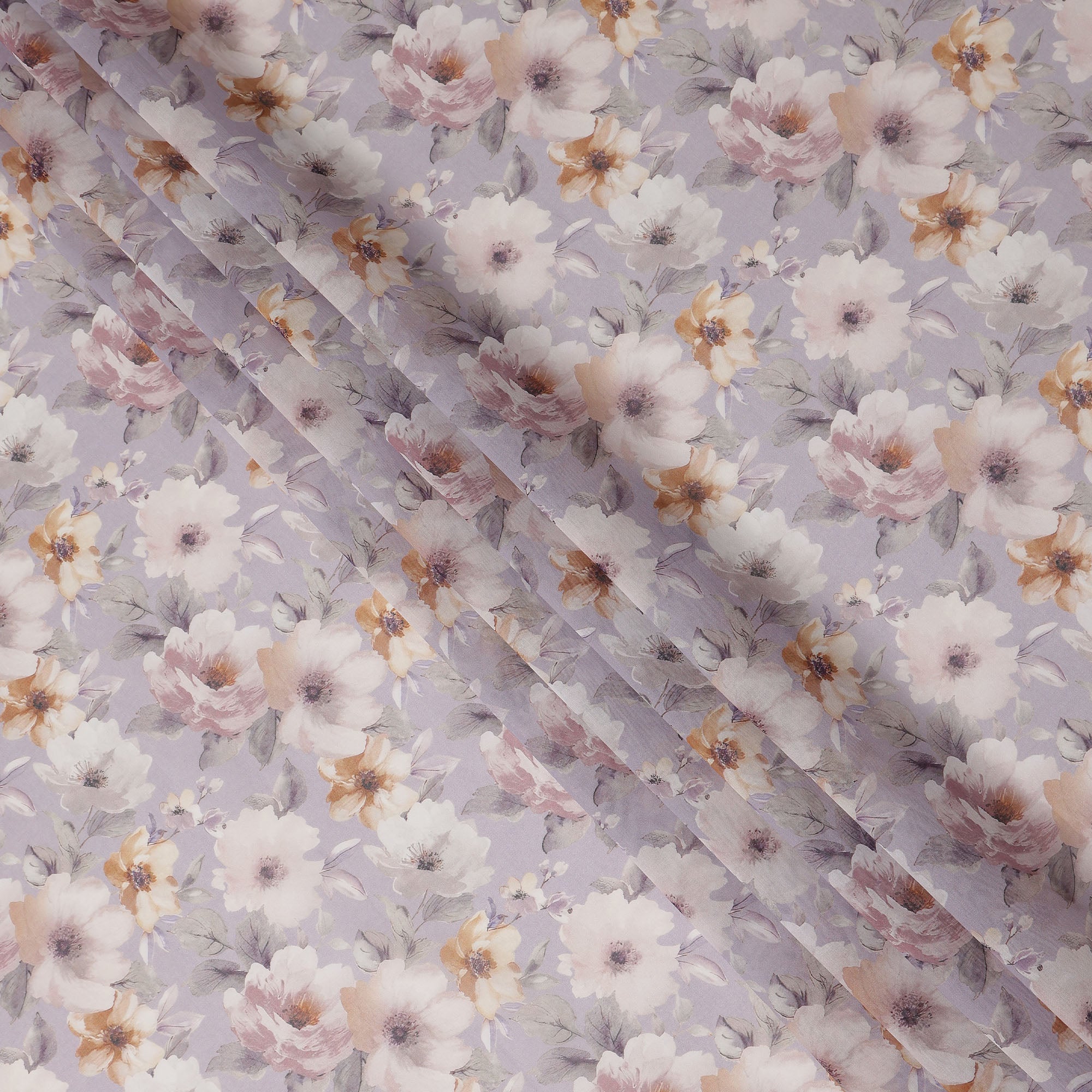 This lilac pastel floral blossom printed cotton voile fabric features a soft lilac base beautifully decorated with airy ivory, blush pink, and warm beige blossoms accented by subtle grey foliage, creating a delicate and elegant aesthetic. Crafted from lightweight and breathable cotton voile, it offers a smooth and sheer texture that feels gentle against the skin while allowing graceful movement and flow. With a generous 150 cms width, this fabric is ideal for dresses, blouses, tunics, scarves, and charming home décor accents. Perfect for designers, boutiques, and DIY sewing enthusiasts, it combines romantic floral style with comfort and versatility for refined everyday and occasion wear creations.