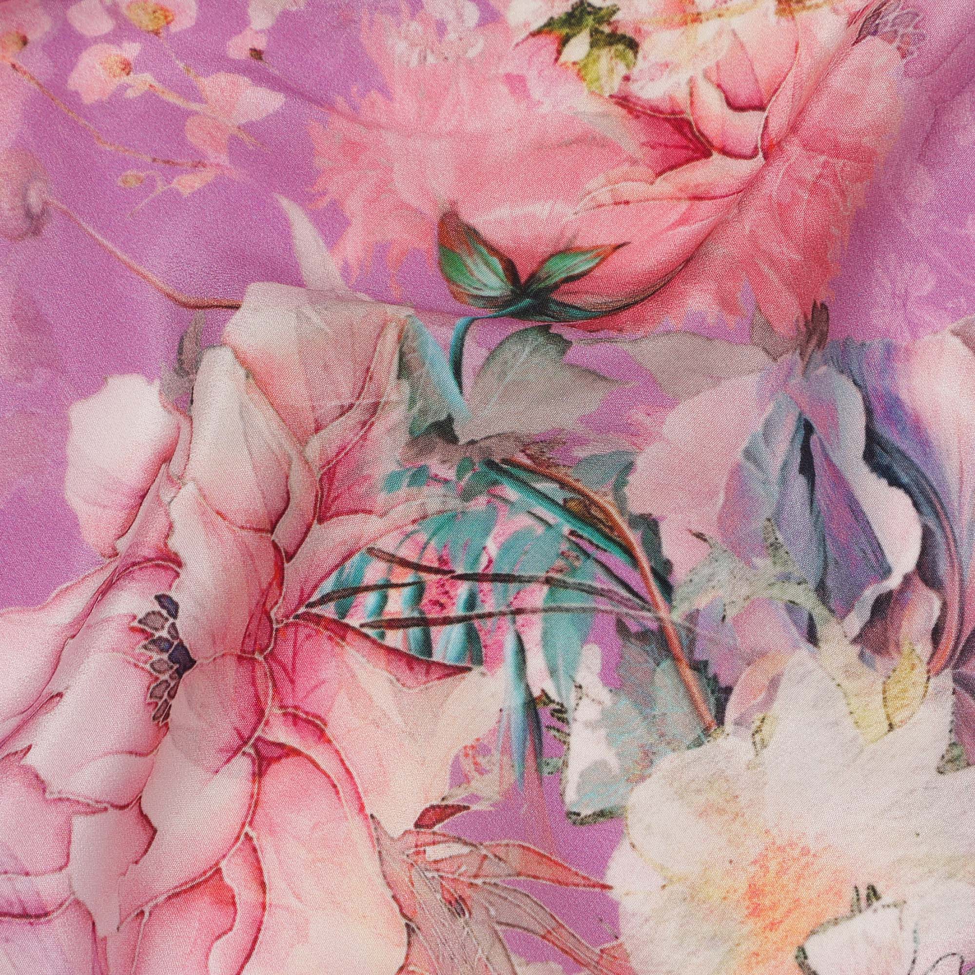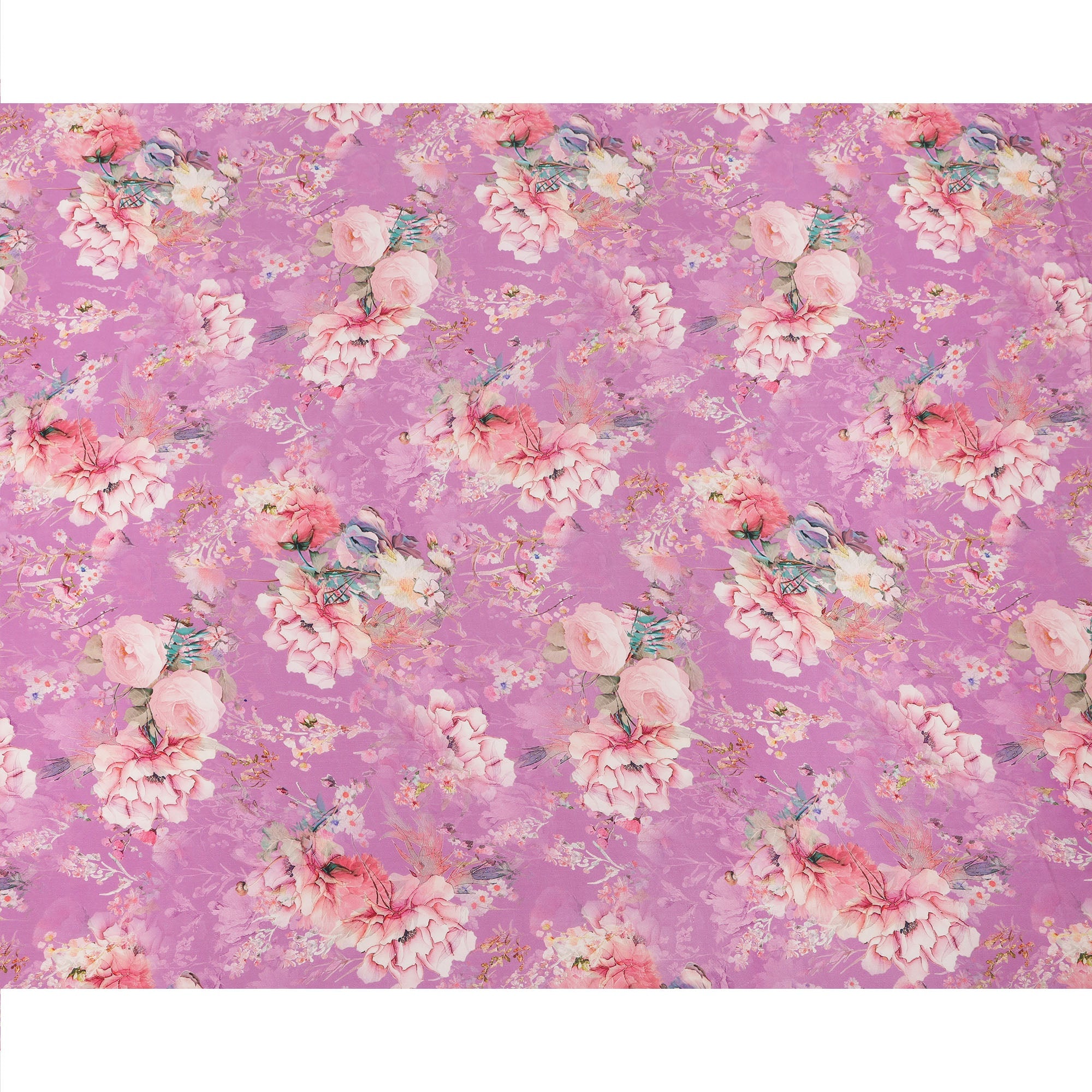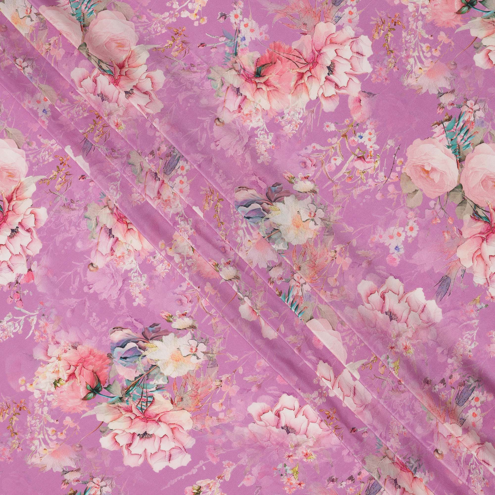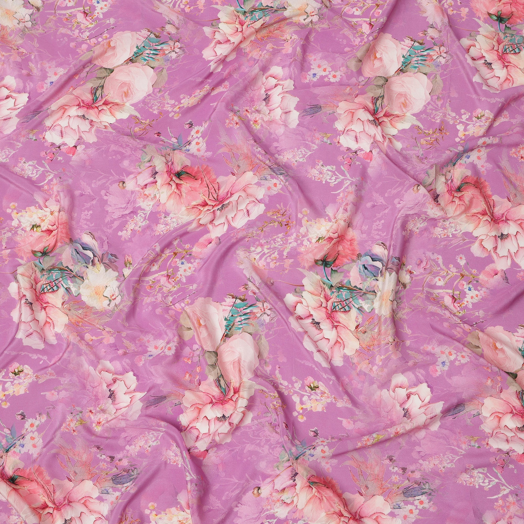 قماش كريب حريري خالص بطبعة زهور الفاوانيا والفراشات الفنية متعدد الألوان، قاعدة أرجوانية أرجوانية، عرض 110 سم، صنع في الهند - D23974