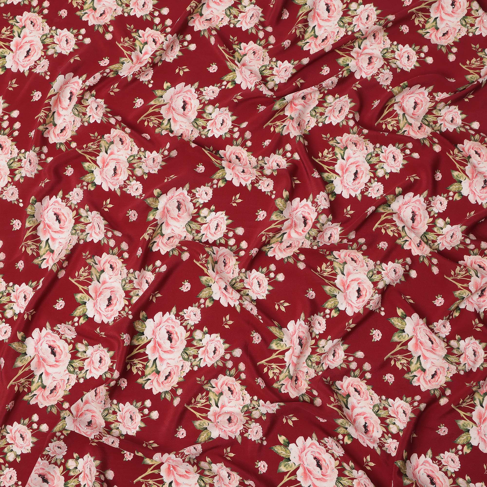 • Maroon Pink Floral Pattern Pure Silk Crepe Fabric with Stone Work, Width 110 Cms, Made in India-D26071