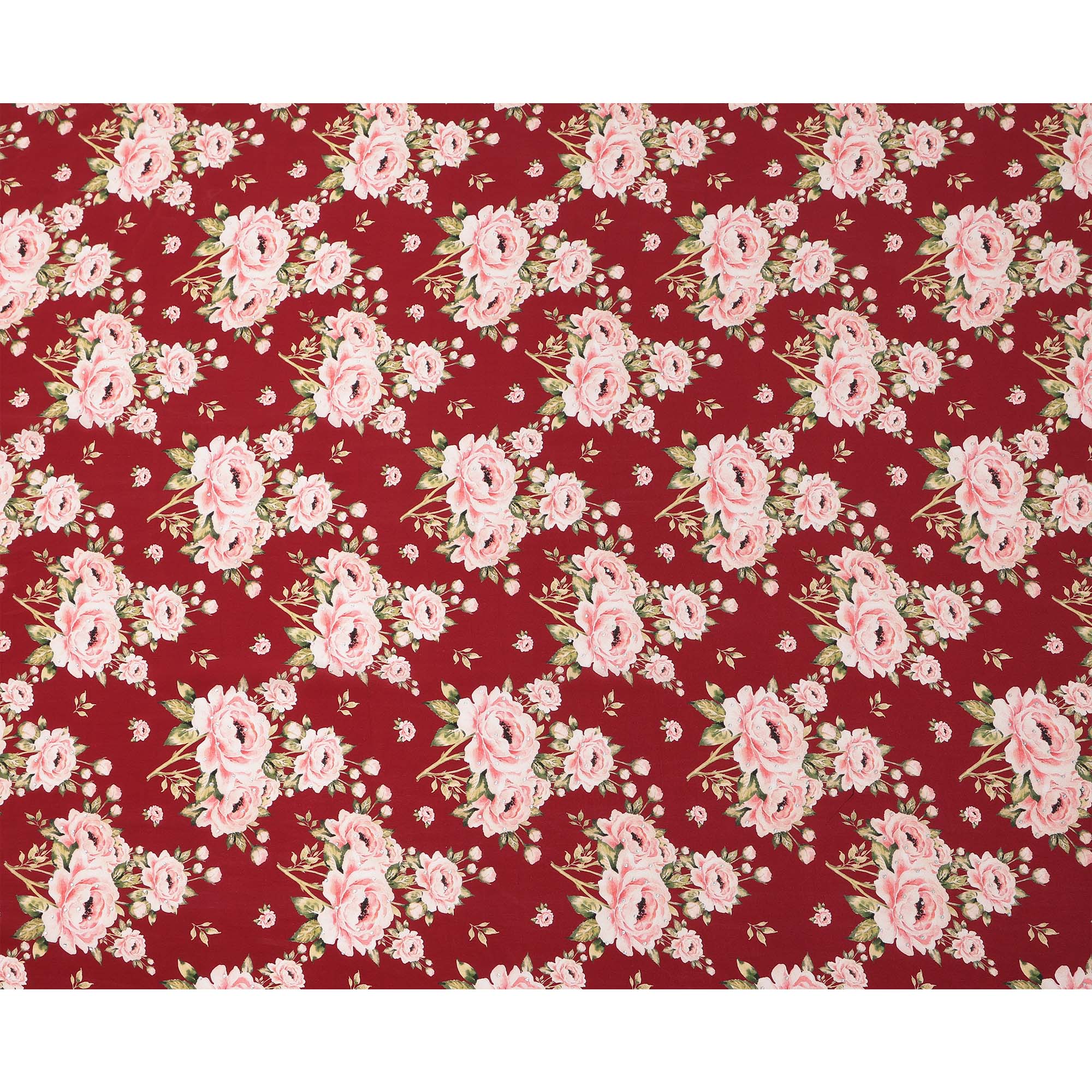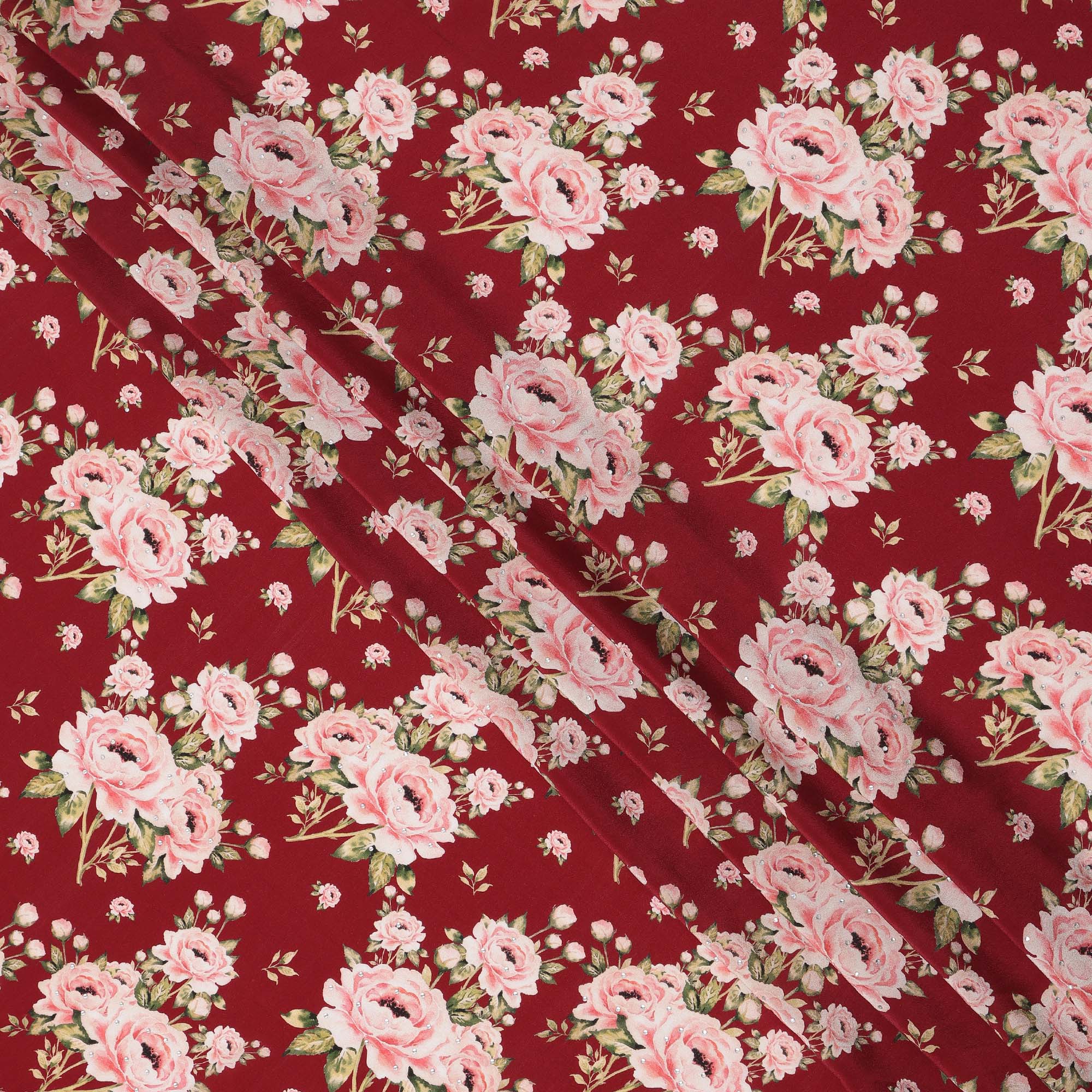 Premium Maroon Pink Floral Pattern Pure Silk Crepe Fabric with Stone Work made in India