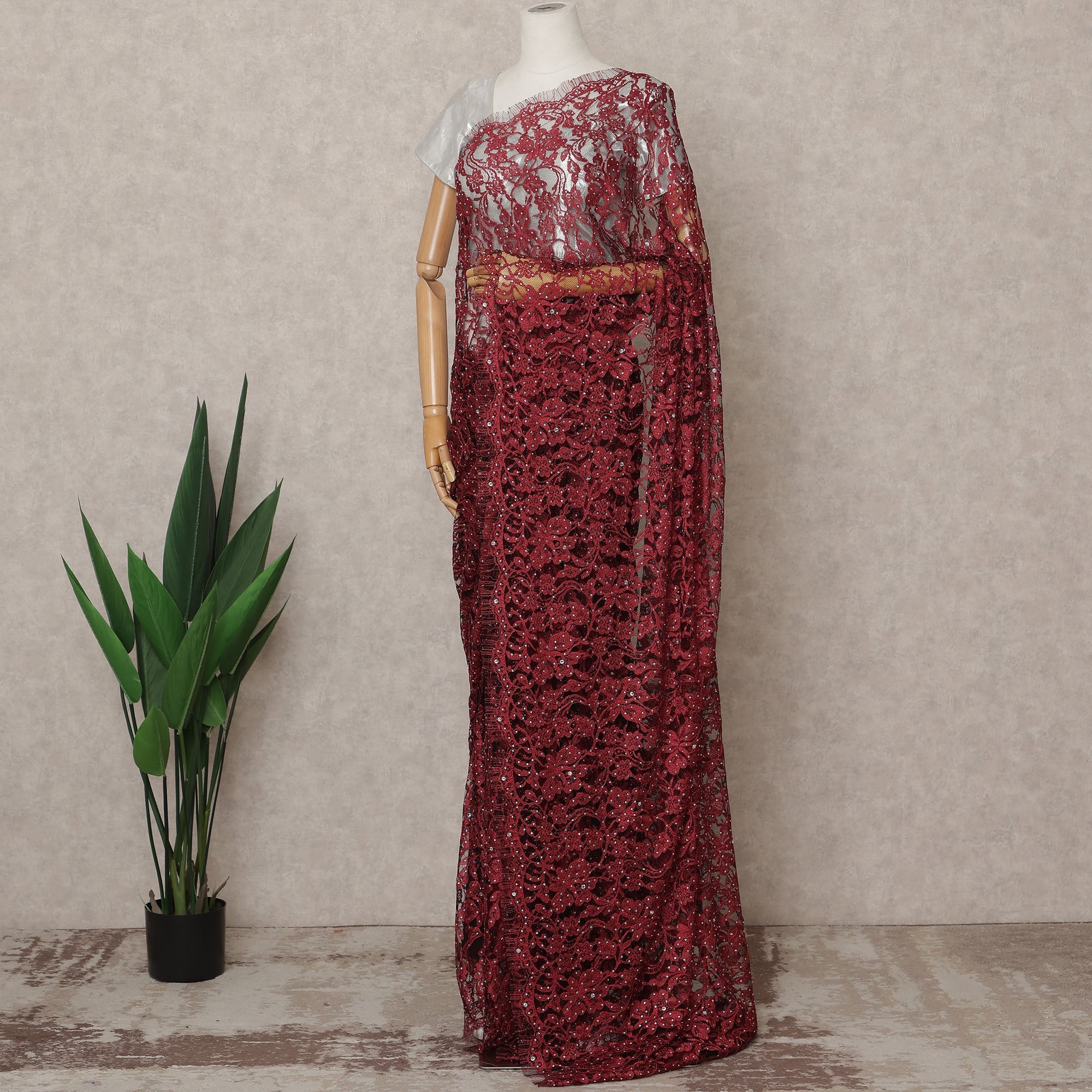 Maroon Premium French 2-Tone Chantilly Lace Saree with Stone Work, Width 110 Cms, Length 5.5 Mtrs, Imported from France-D25683