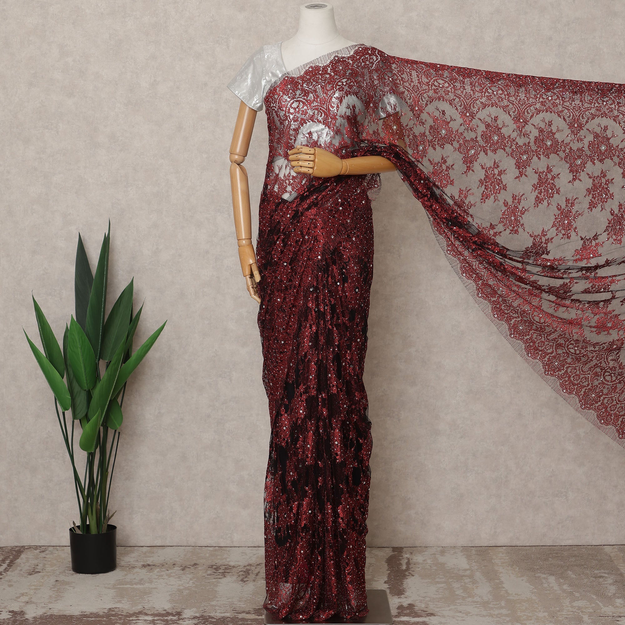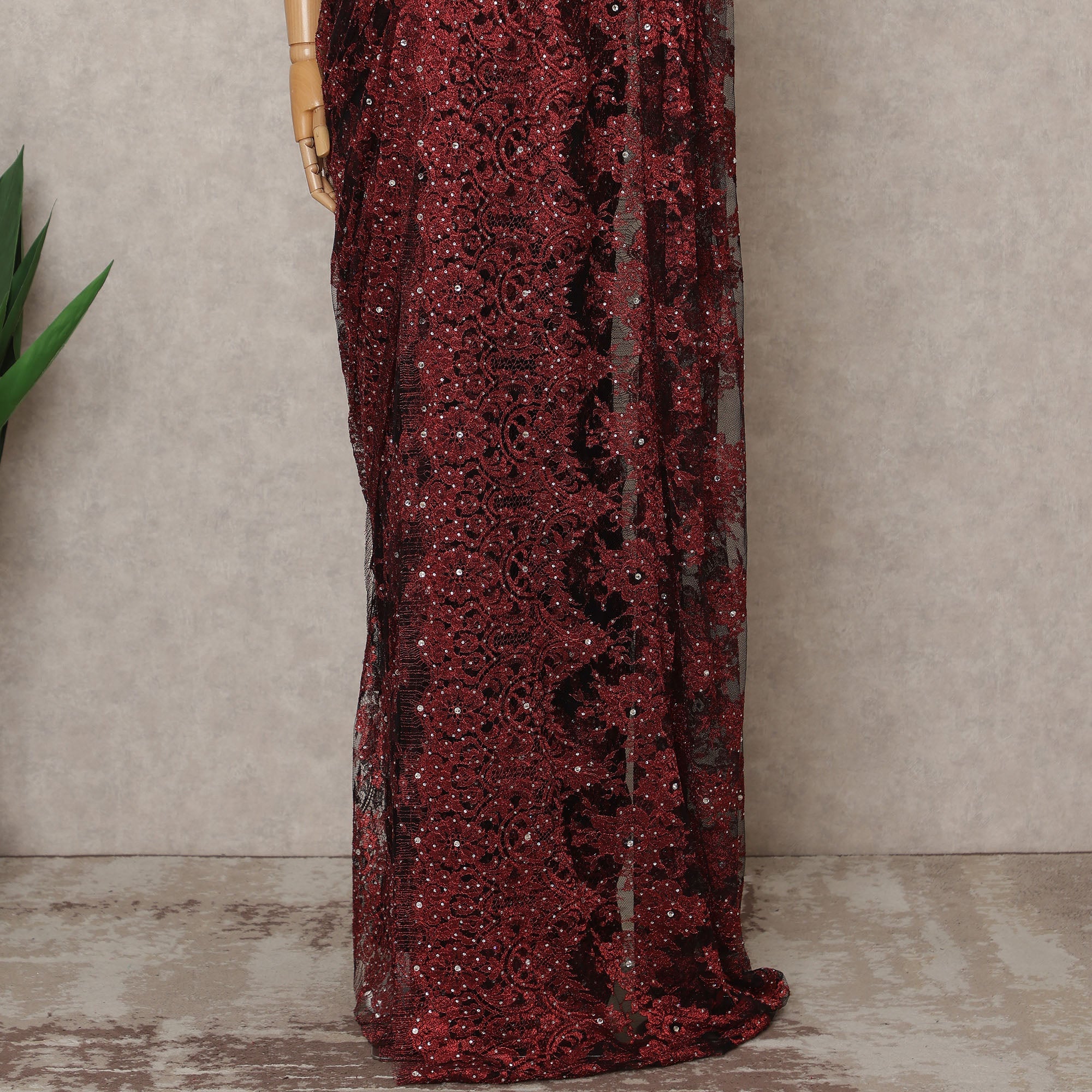 Maroon Premium French Metallic Chantilly Lace Saree Fabric with Stone Work – 5.5 Meters Length, 110 Cms Width, Imported from France-D25724