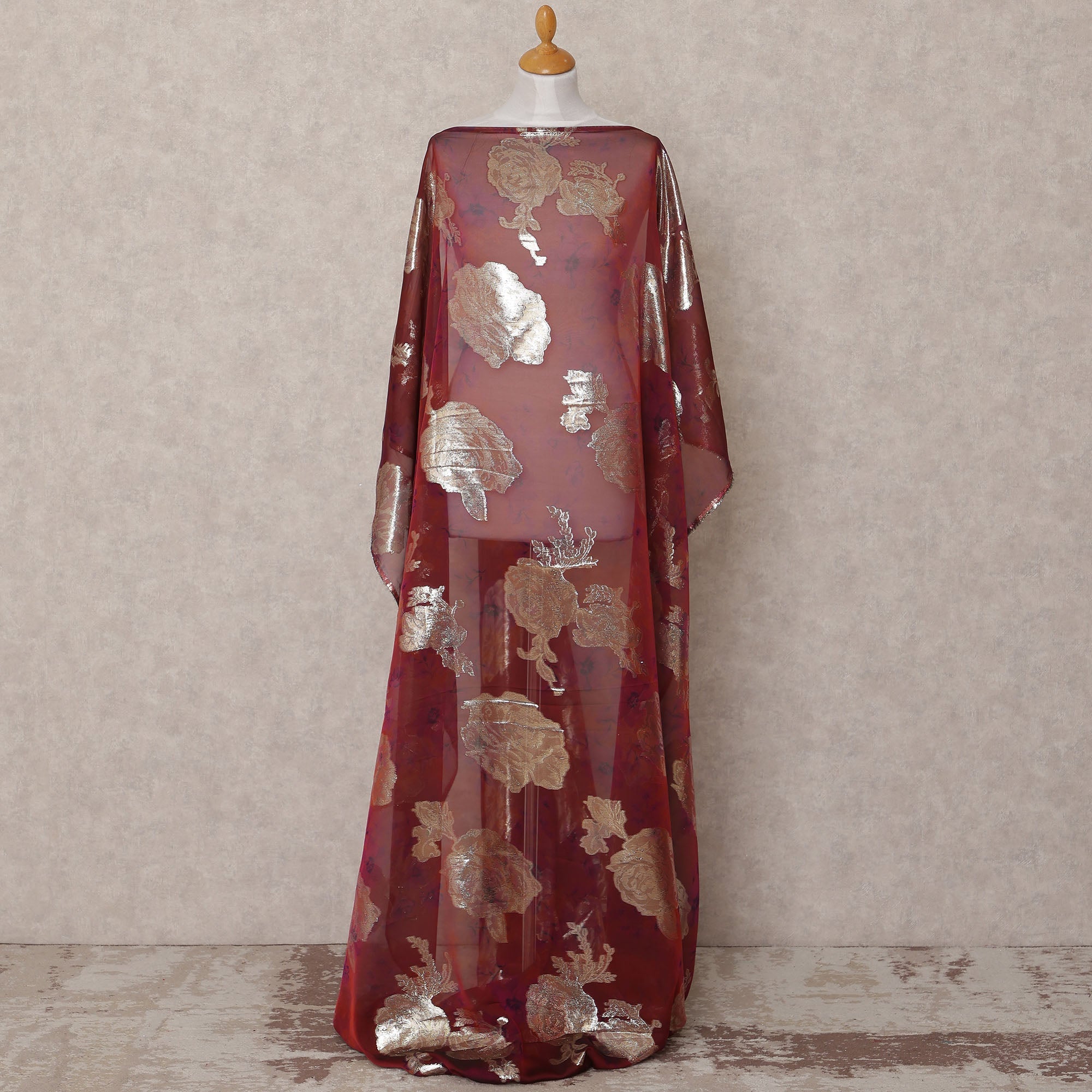 قماش ديراك شيفون حريري صومالي تقليدي بلون العنابي مع لوركس معدني، قماش أنيق يجمع بين قاعدة بلون العنابي الغني وزخارف... اقرأ أكثر اقرأ أكثر