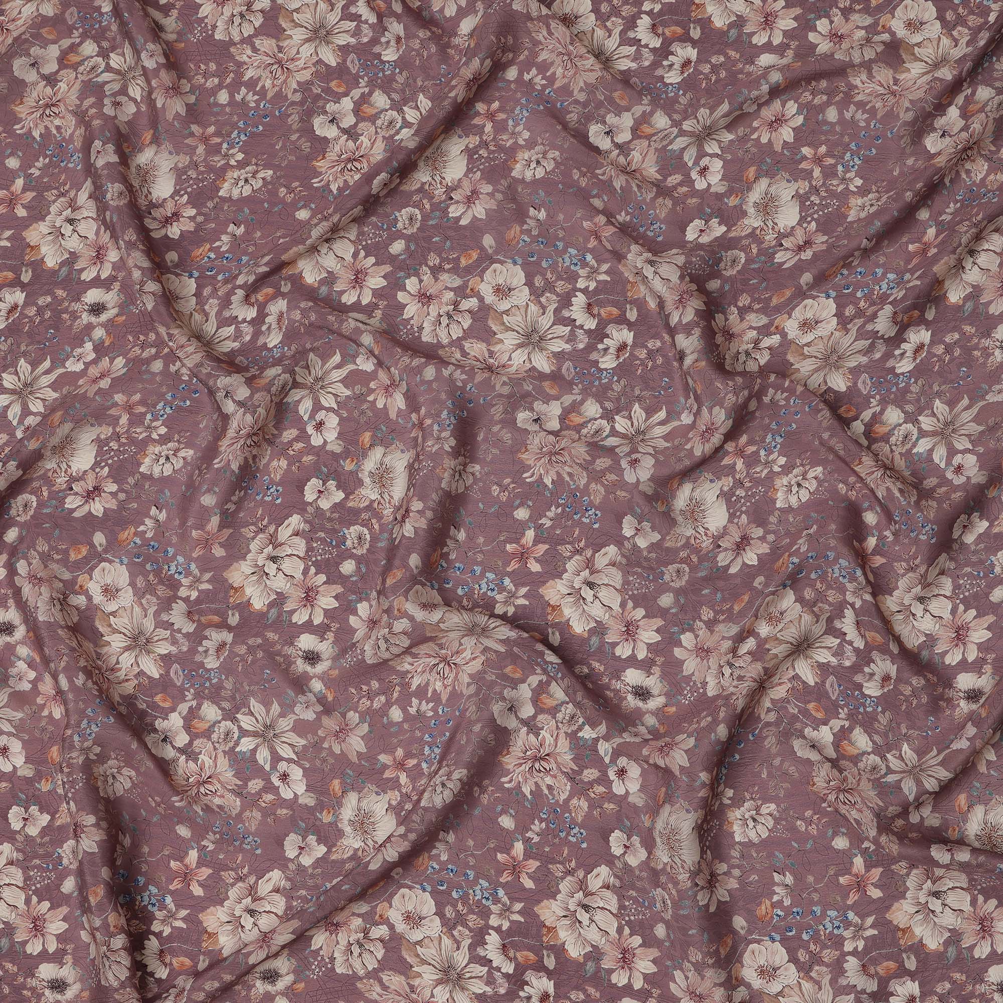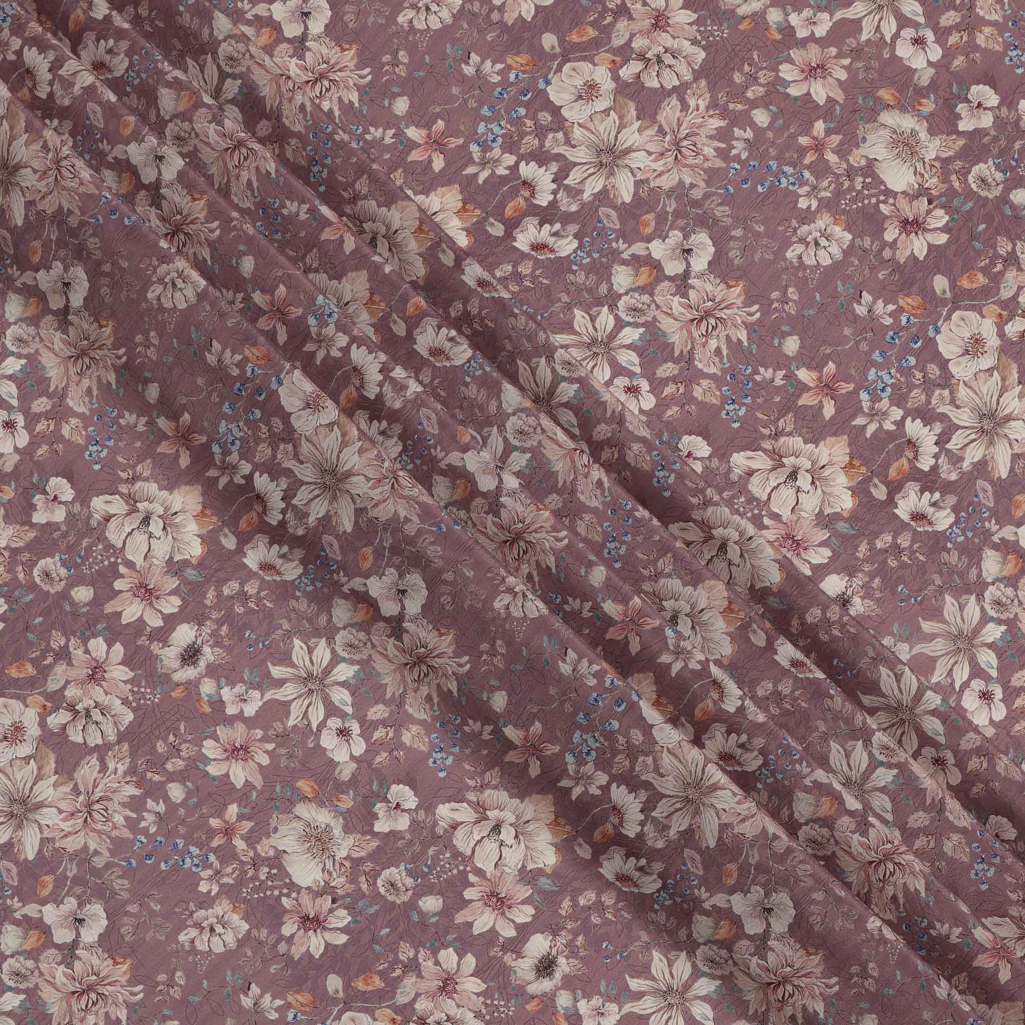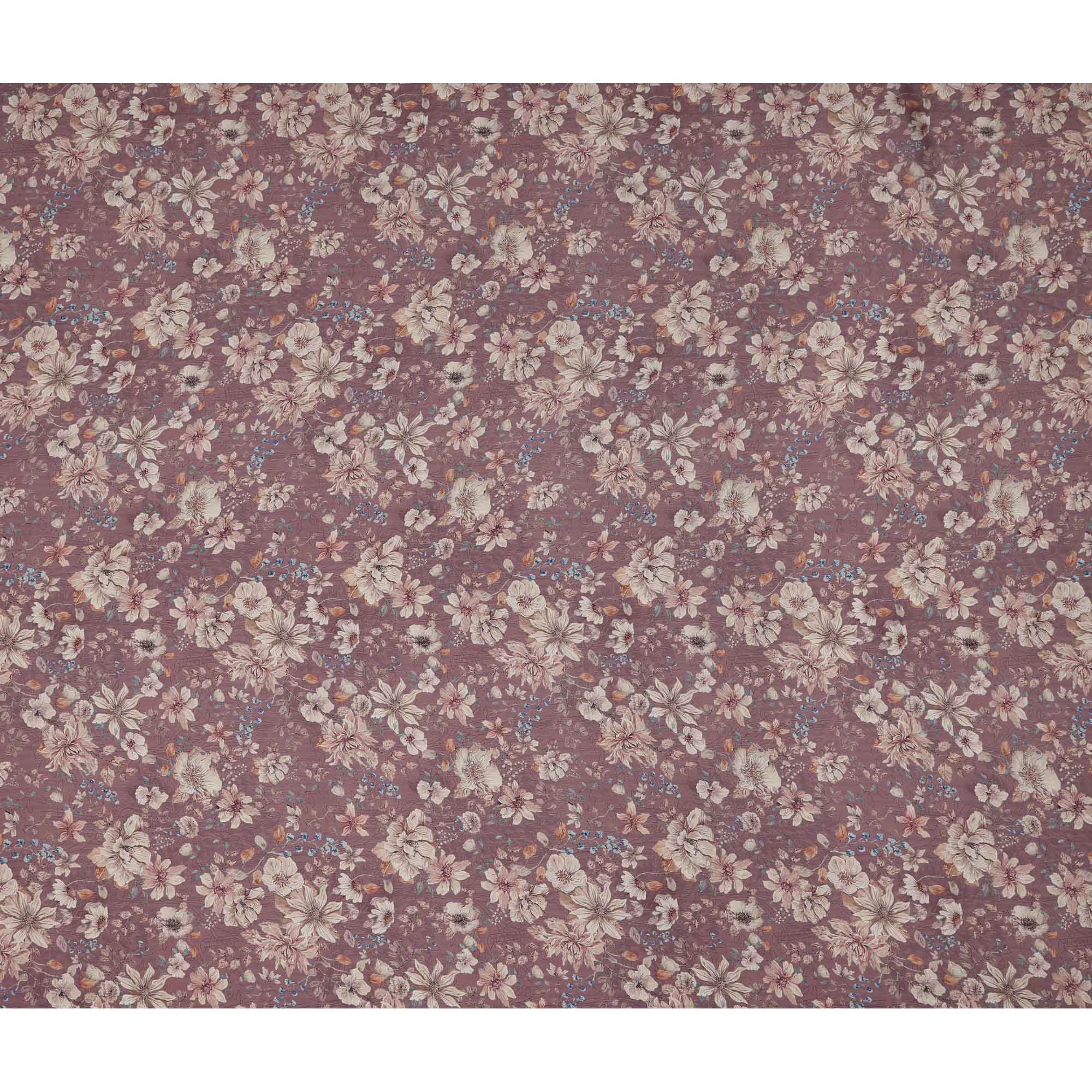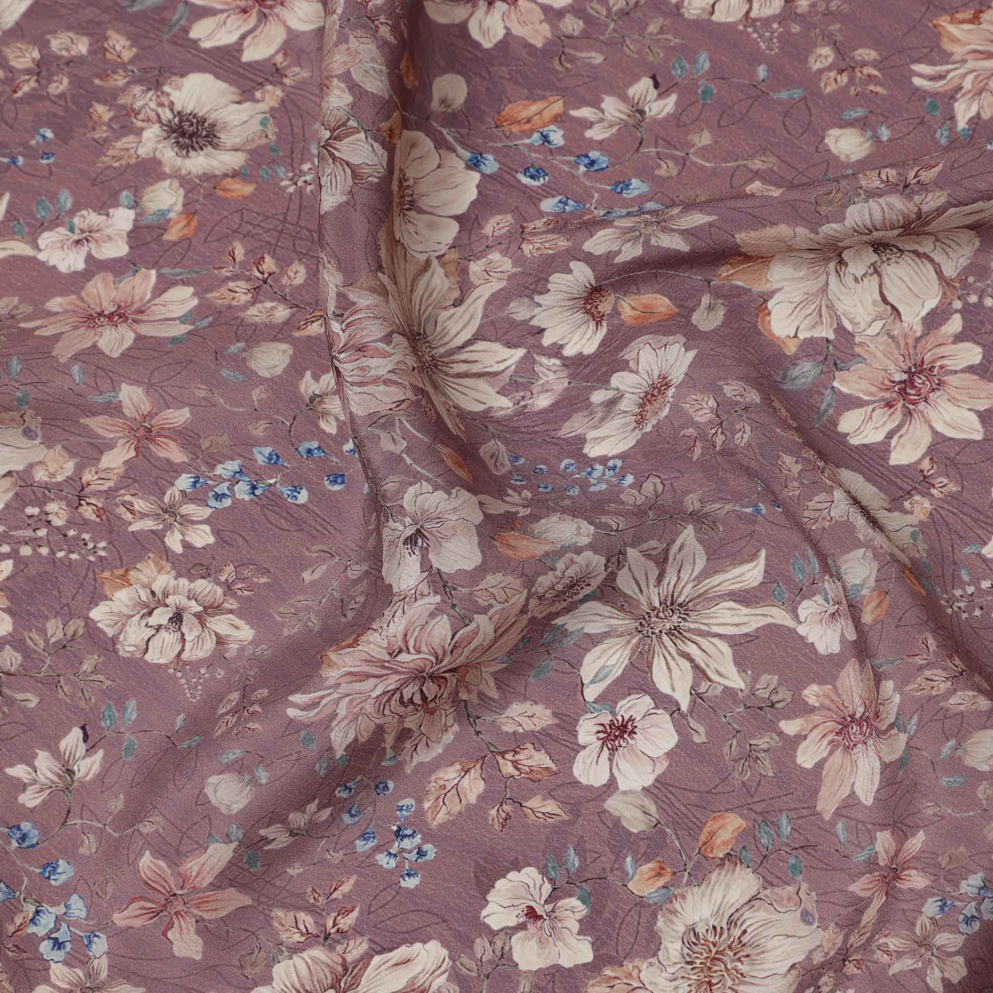 قماش كريب فيسكوز مطبوع عليه زهور باللون البني الموف، مع تفاصيل زهور باللونين البيج والأزرق مع لمسات من أوراق الخريف، عرض 110 سم، صنع في الهند - D23461