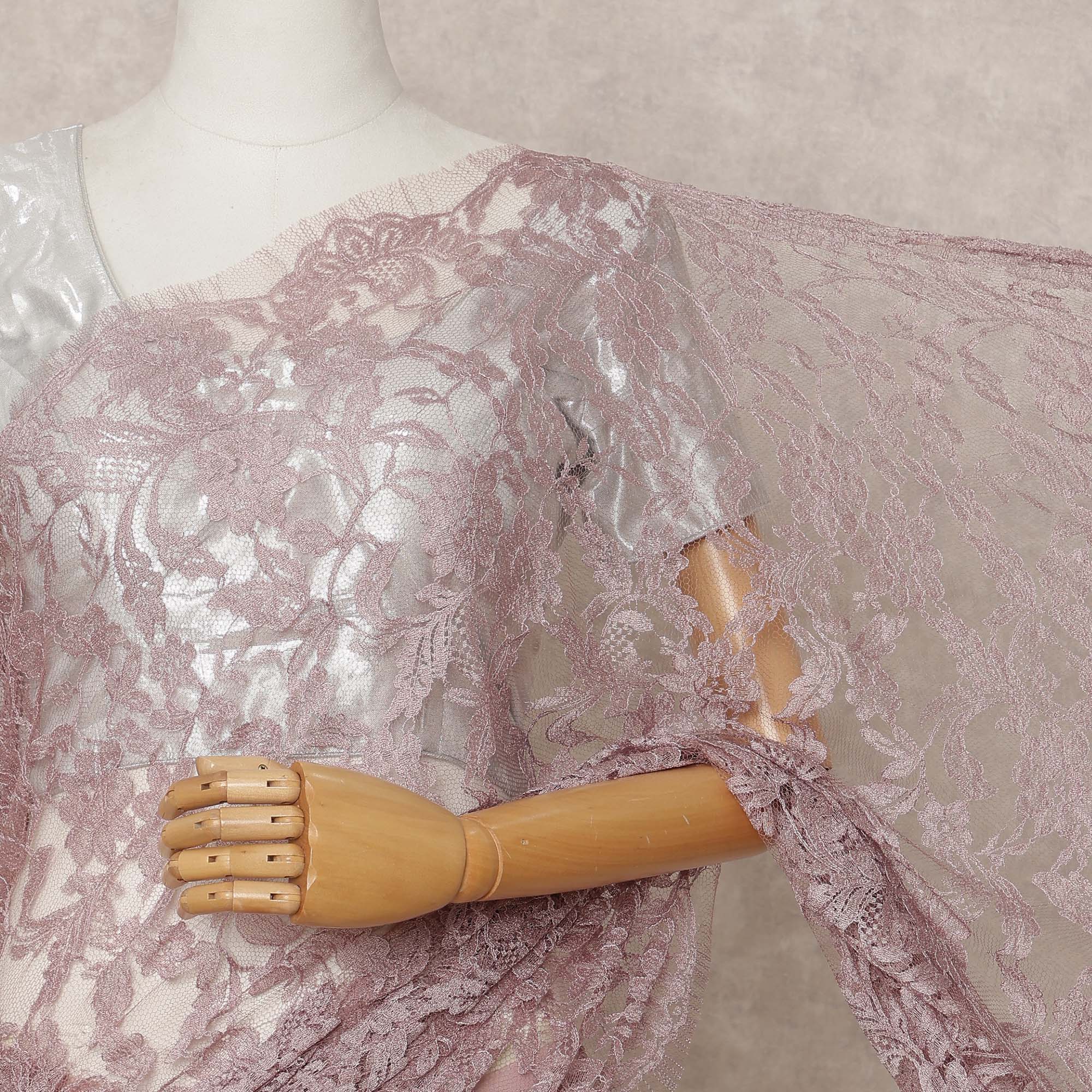 Premium French Chantilly lace fabric in an elegant mauve tone.