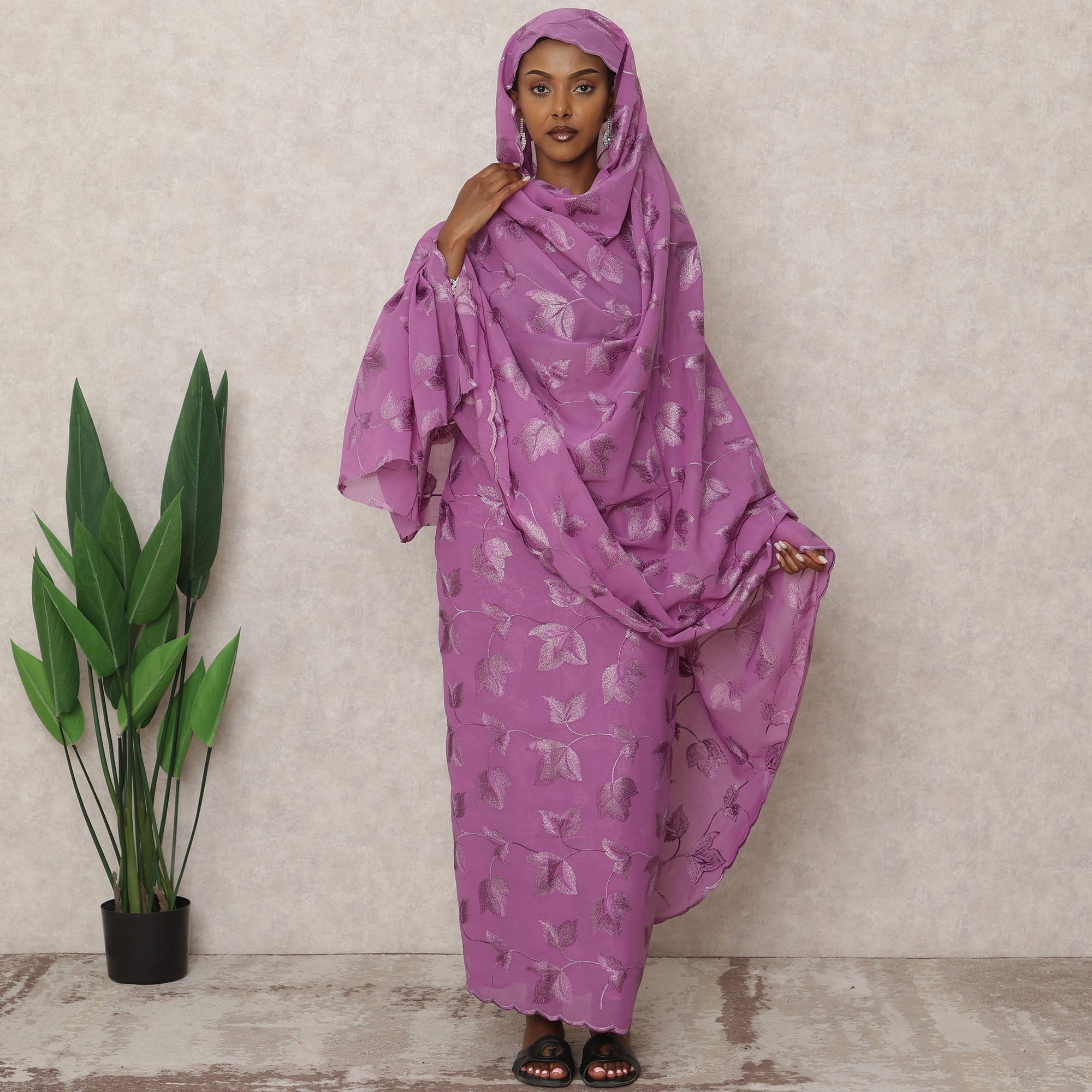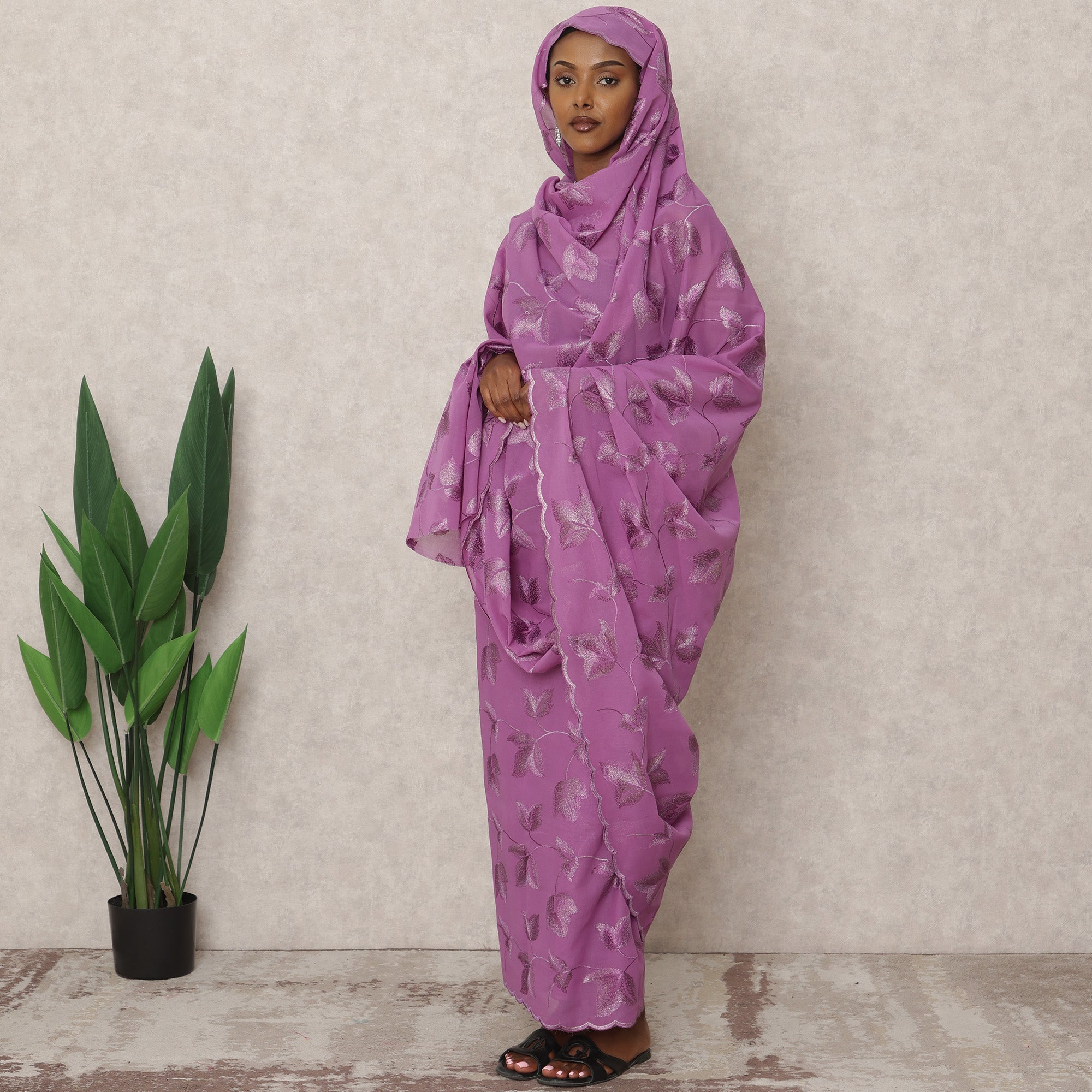لون بنفسجي أرجواني مع تطريز على شكل أوراق بلون فضي لإضفاء لمسة أنيقة