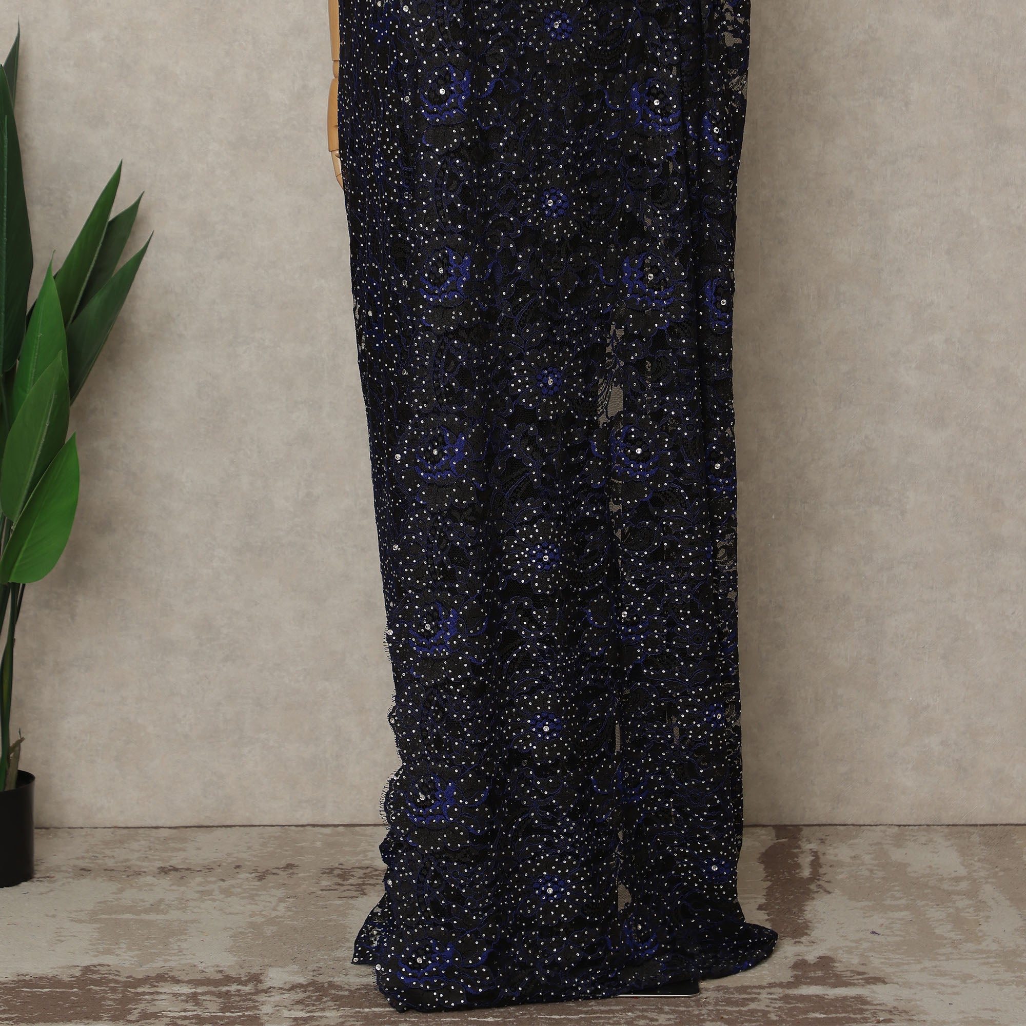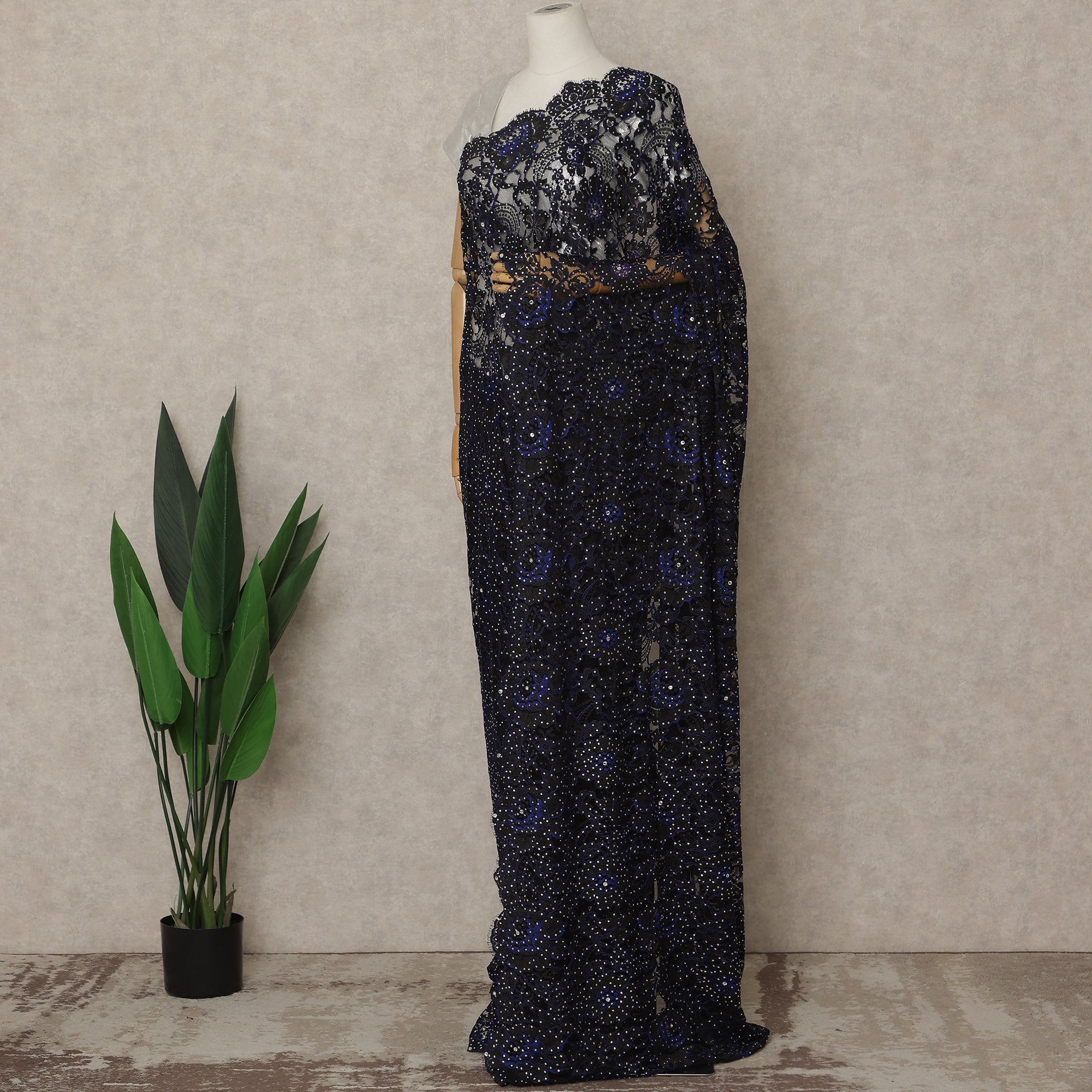 Indulge in bold sophistication with this premium French Chantilly saree lace in a striking midnight black shade, expertly crafted in France to reflect timeless European luxury. This exquisite lace showcases intricate Chantilly floral motifs richly enhanced with finely placed stone work that creates a captivating sparkle against the deep black base, giving the fabric dramatic depth and elegance. Soft, sheer, and fluid in texture, the lace drapes beautifully and flows effortlessly, making it an exceptional choice for evening sarees, couture gowns, designer overlays, and statement festive wear. The midnight black color exudes power, glamour, and refined confidence, pairing perfectly with diamonds, metallic accessories, and contemporary silhouettes, ideal for receptions, cocktail events, weddings, and grand celebrations. This piece measures approximately 5.5 meters in length with a width of 110 cms, offering ample fabric for seamless draping and creative couture styling. Blouse is not included. To maintain the delicacy of the lace and preserve the brilliance of the stone embellishments, professional dry cleaning is recommended. Buy online to experience authentic French craftsmanship, shop online for premium imported Chantilly lace, and purchase online to elevate your luxury fashion collection.