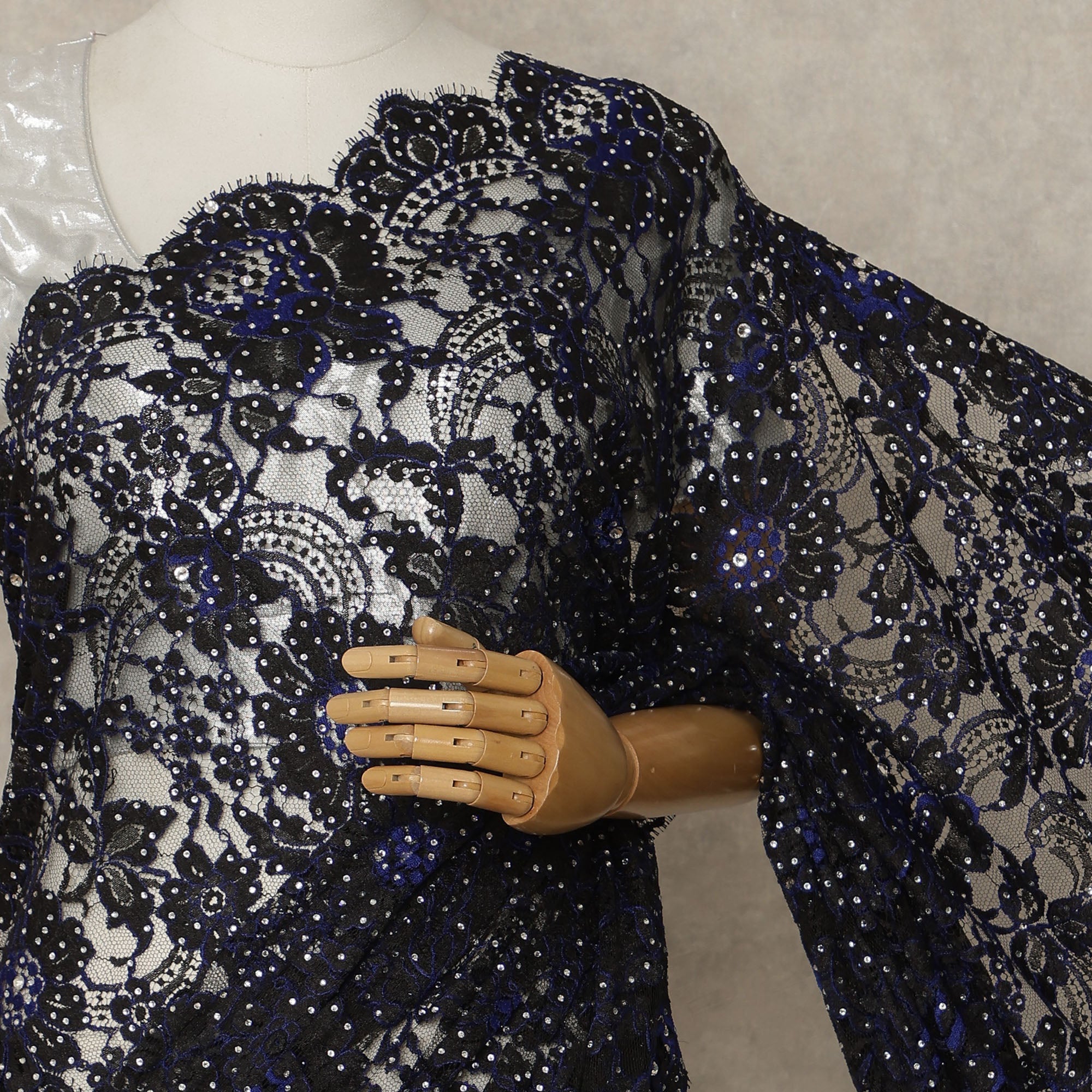 • Midnight Black Premium French Chantilly Saree Lace with Stone Work 5.5 Mtrs Length, Width 110 Cms and Made in France-D27179