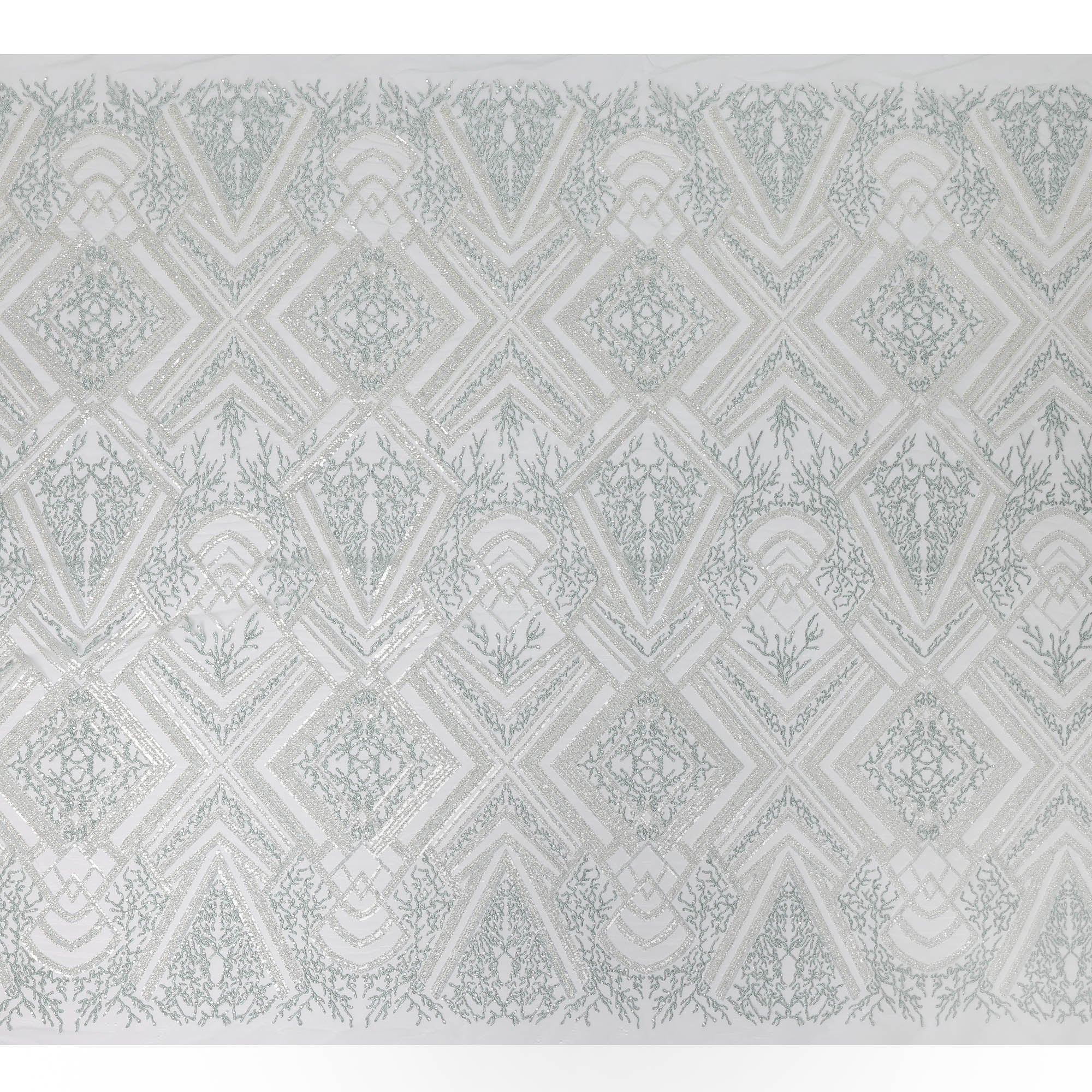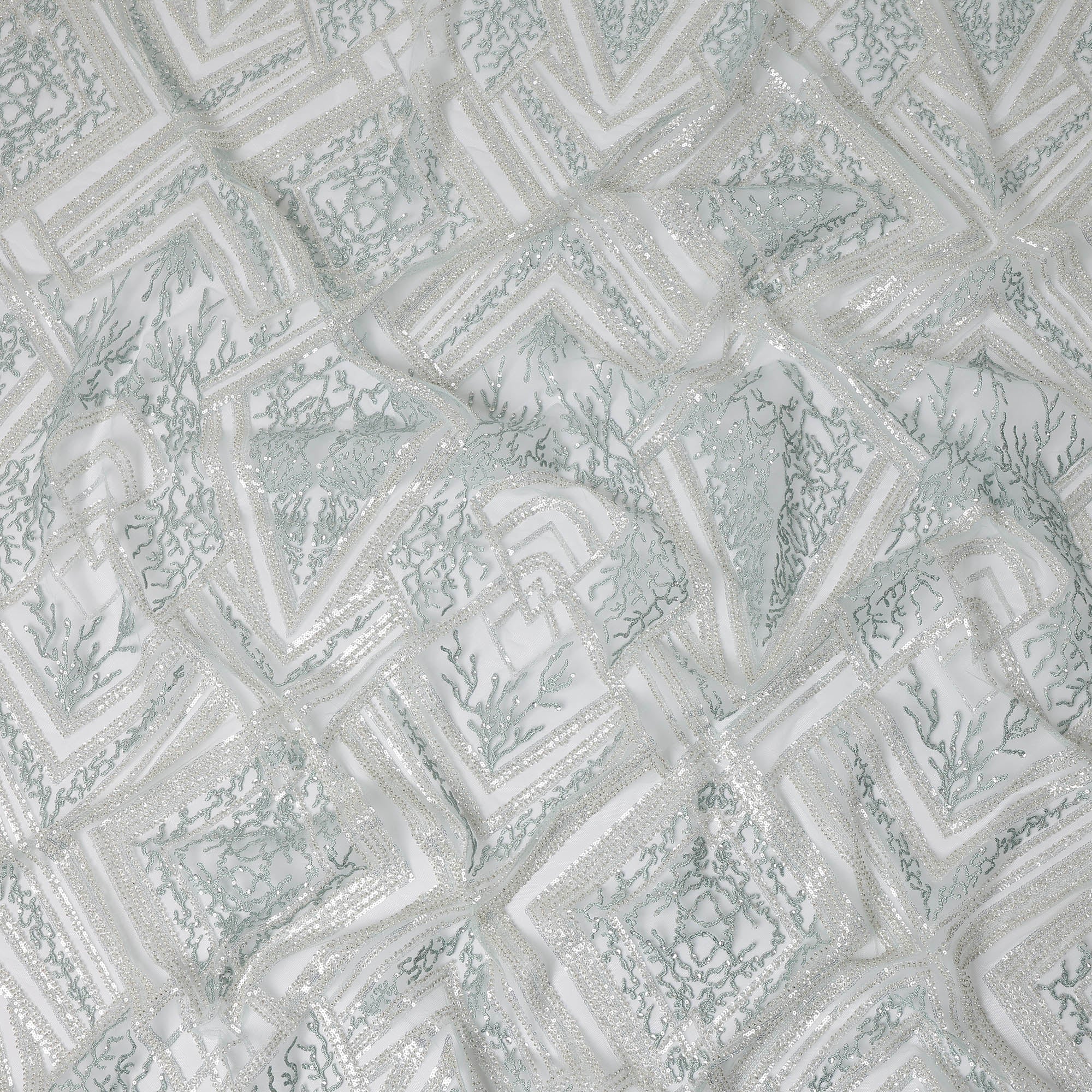 Mint Blue nylon tulle with intricate geometric and coral-inspired embroidery