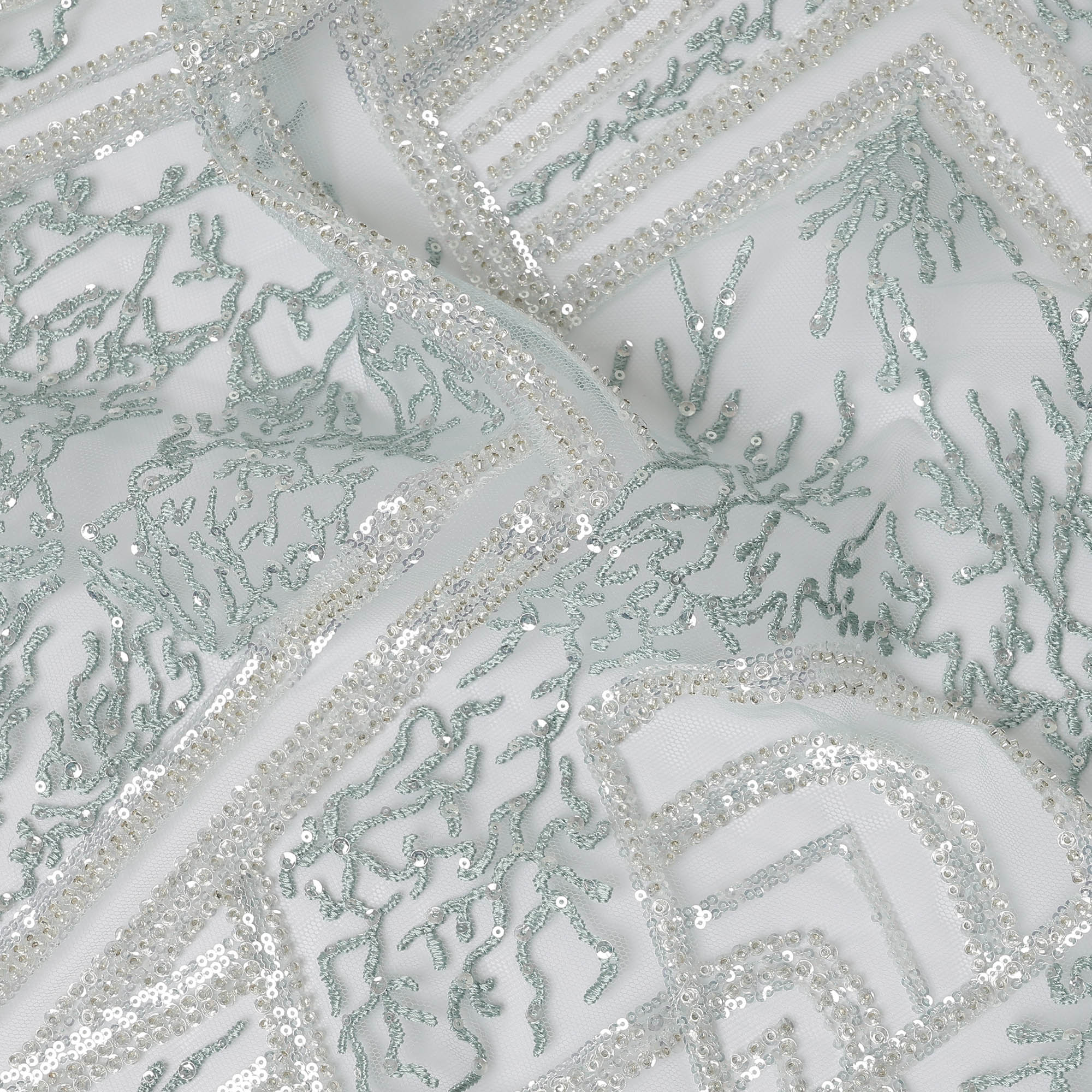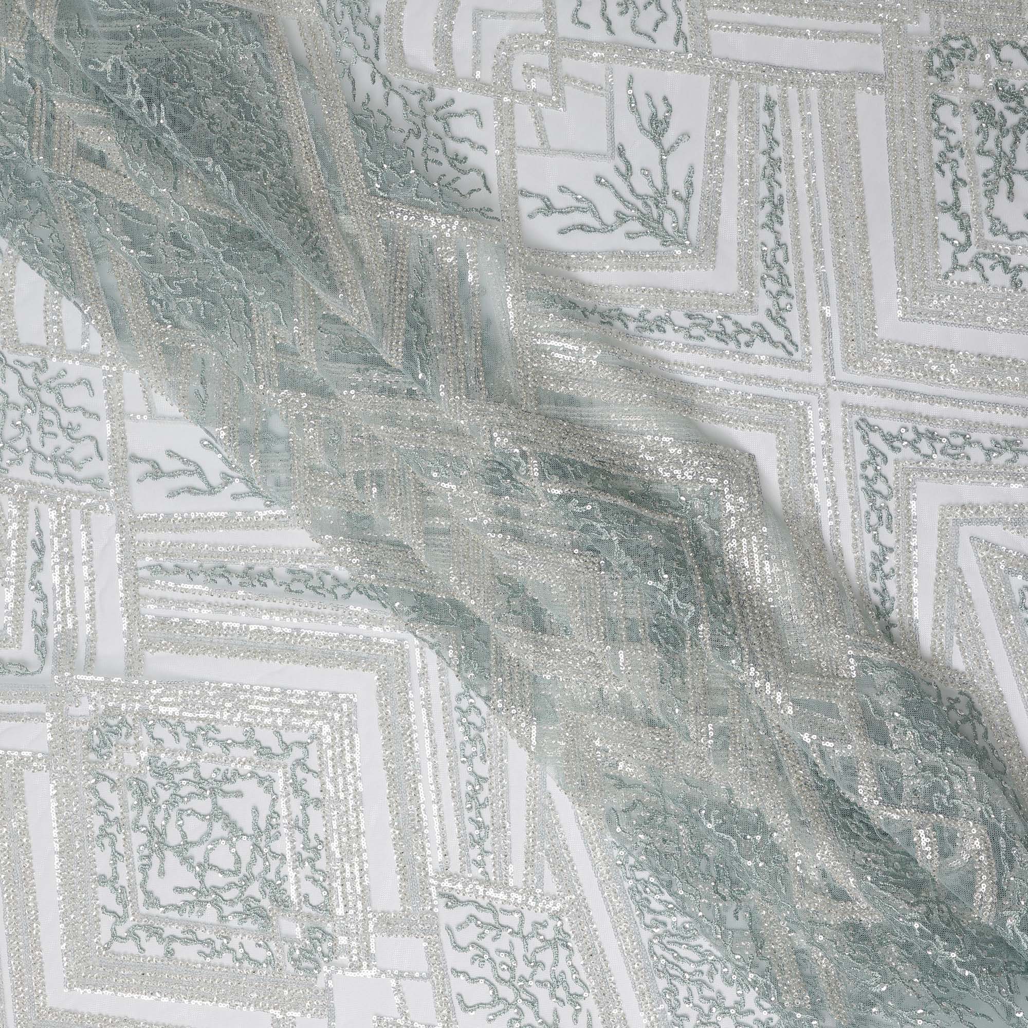 Mint Blue Geometric Embroidered Nylon Tulle Fabric with Sequins, 140 cm Width, Made in India-D26627