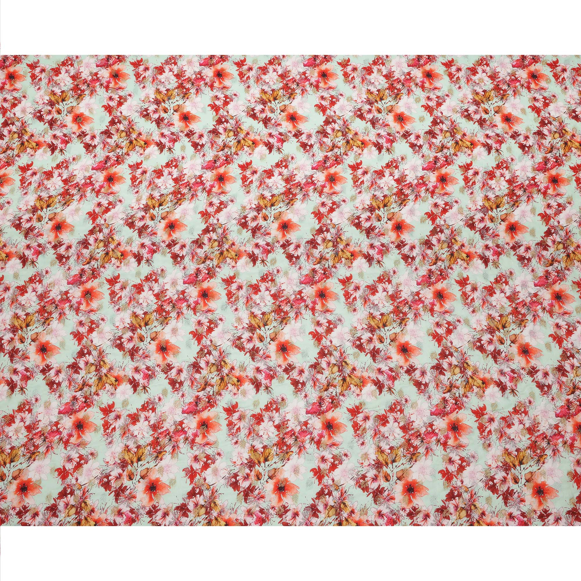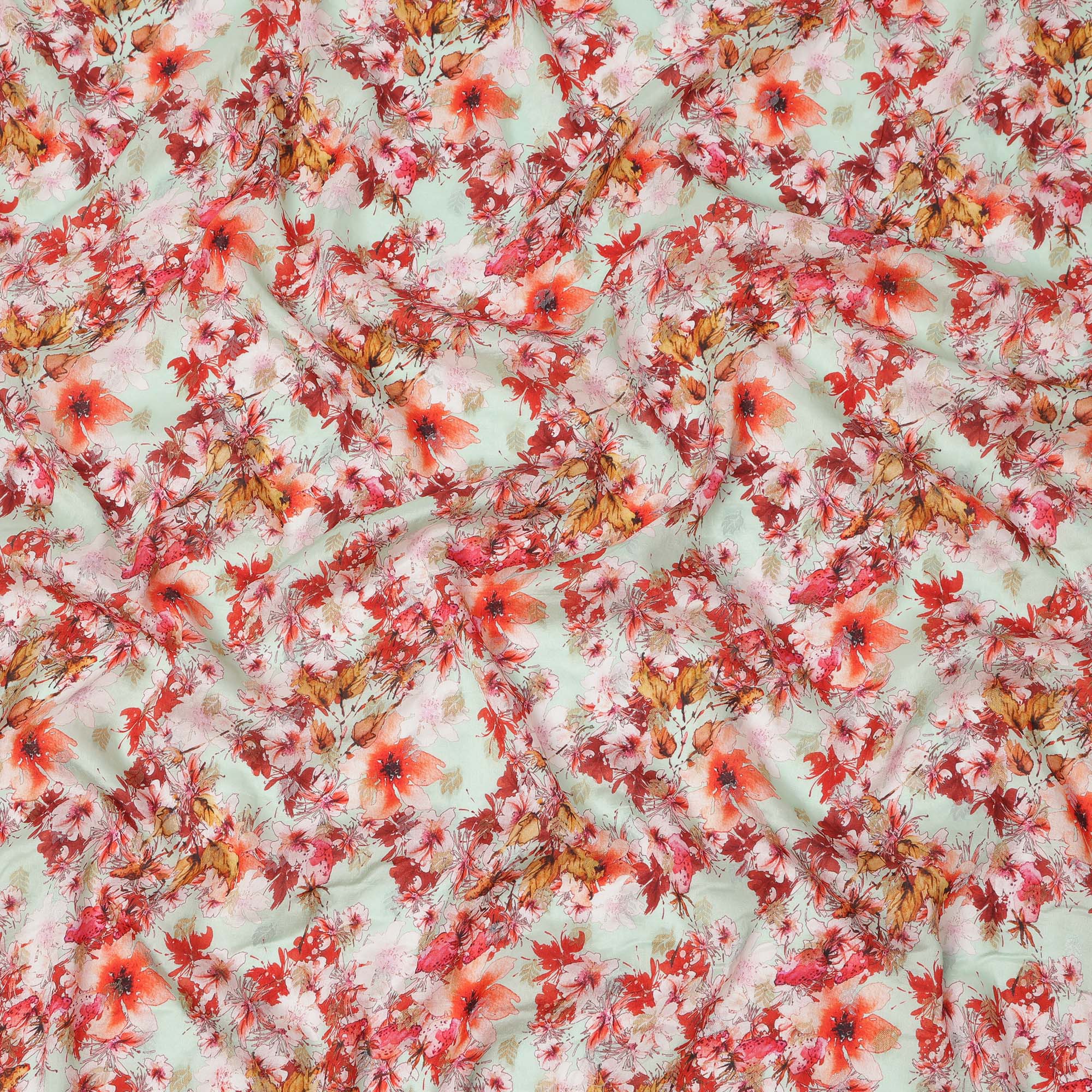 قماش كريب صناعي بطبعة زهور خضراء نعناعية وحمراء، تصميم حديقة رقمي نابض بالحياة، عرض 110 سم، صنع في الهند - D23759