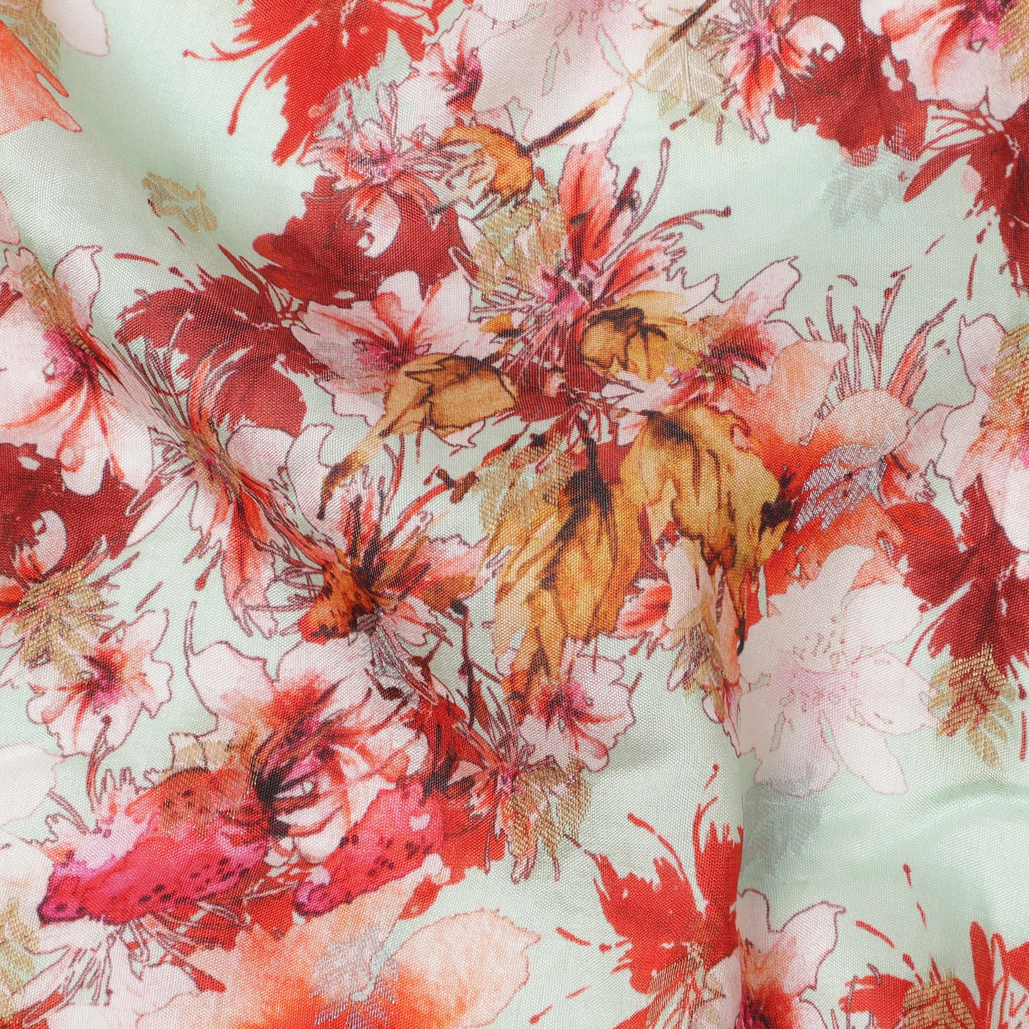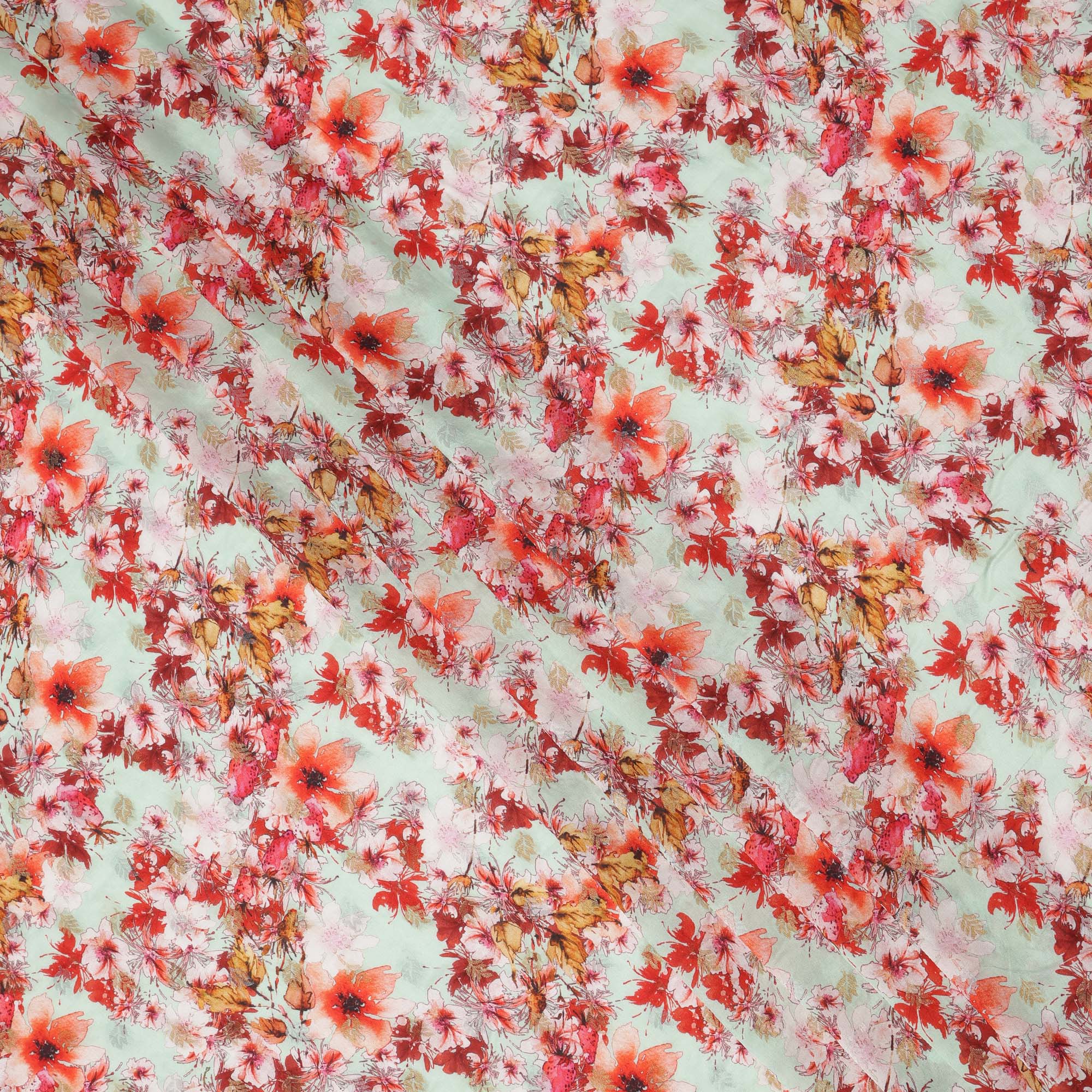 قماش كريب صناعي باللون الأخضر النعناعي مع طبعة زهور حمراء ومرجانية