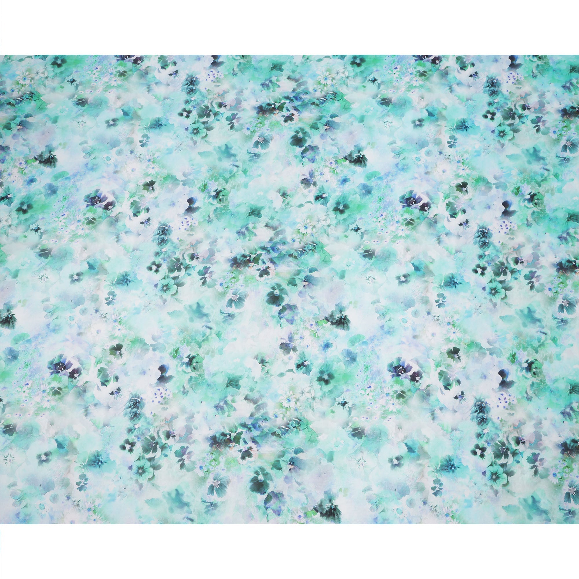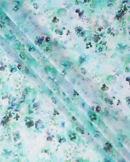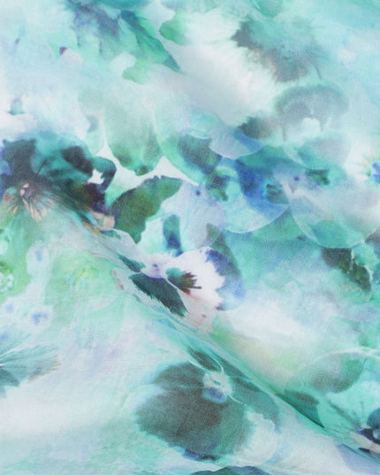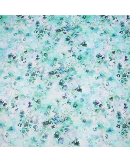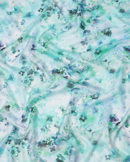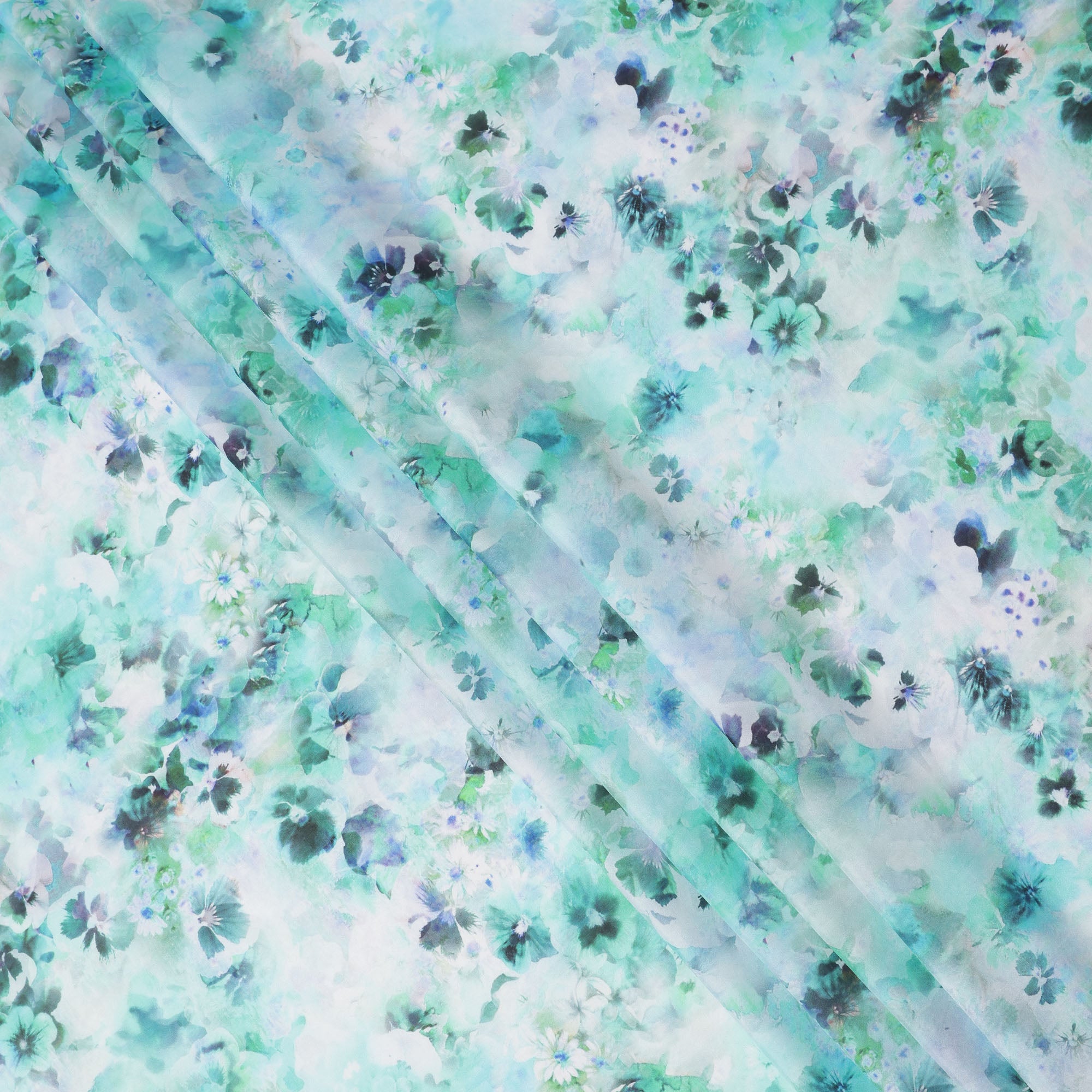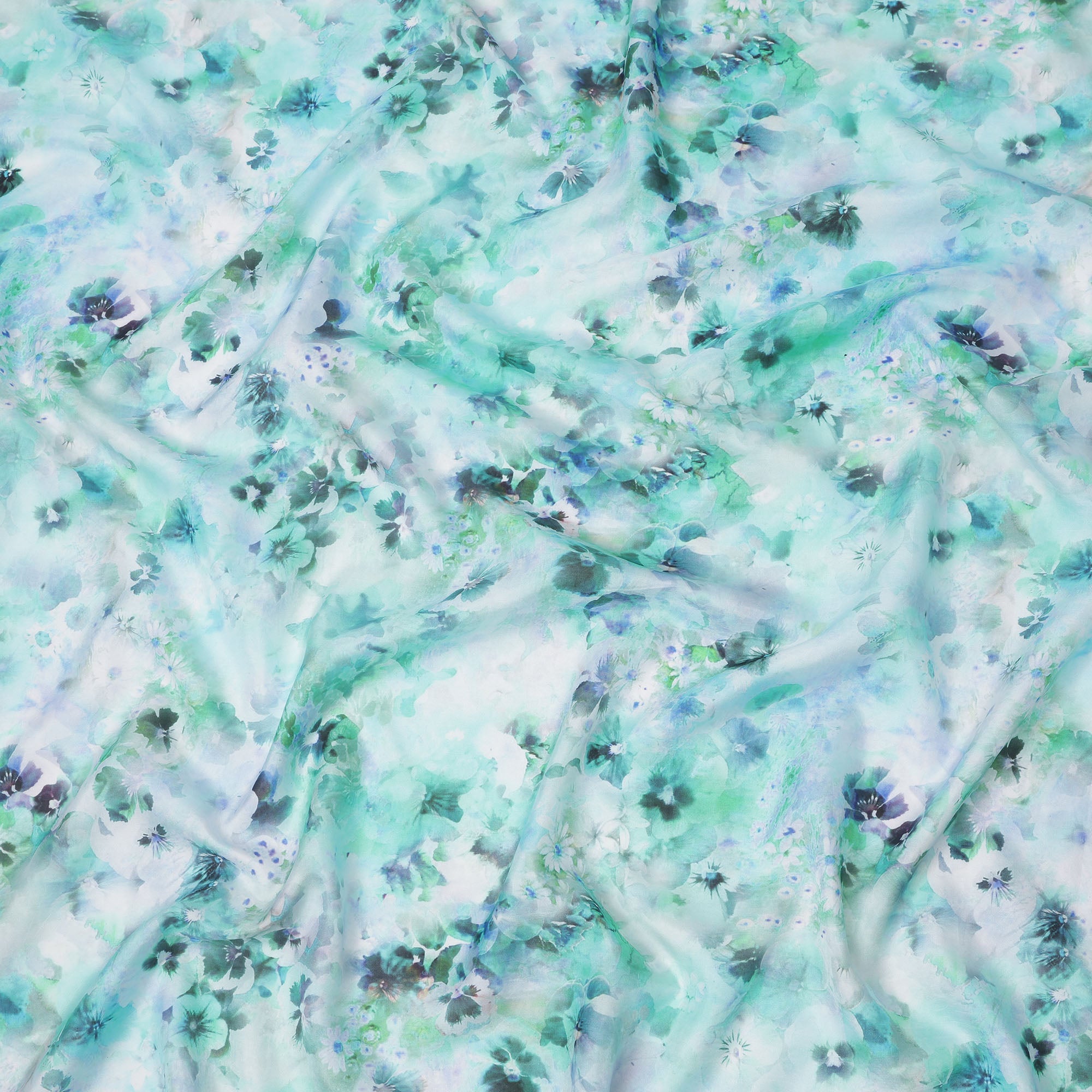 قماش كريب حريري نقي مطبوع عليه زهور مائية باللون الأخضر النعناعي والأزرق المخضر، عرض 110 سم، صنع في الهند - D24023