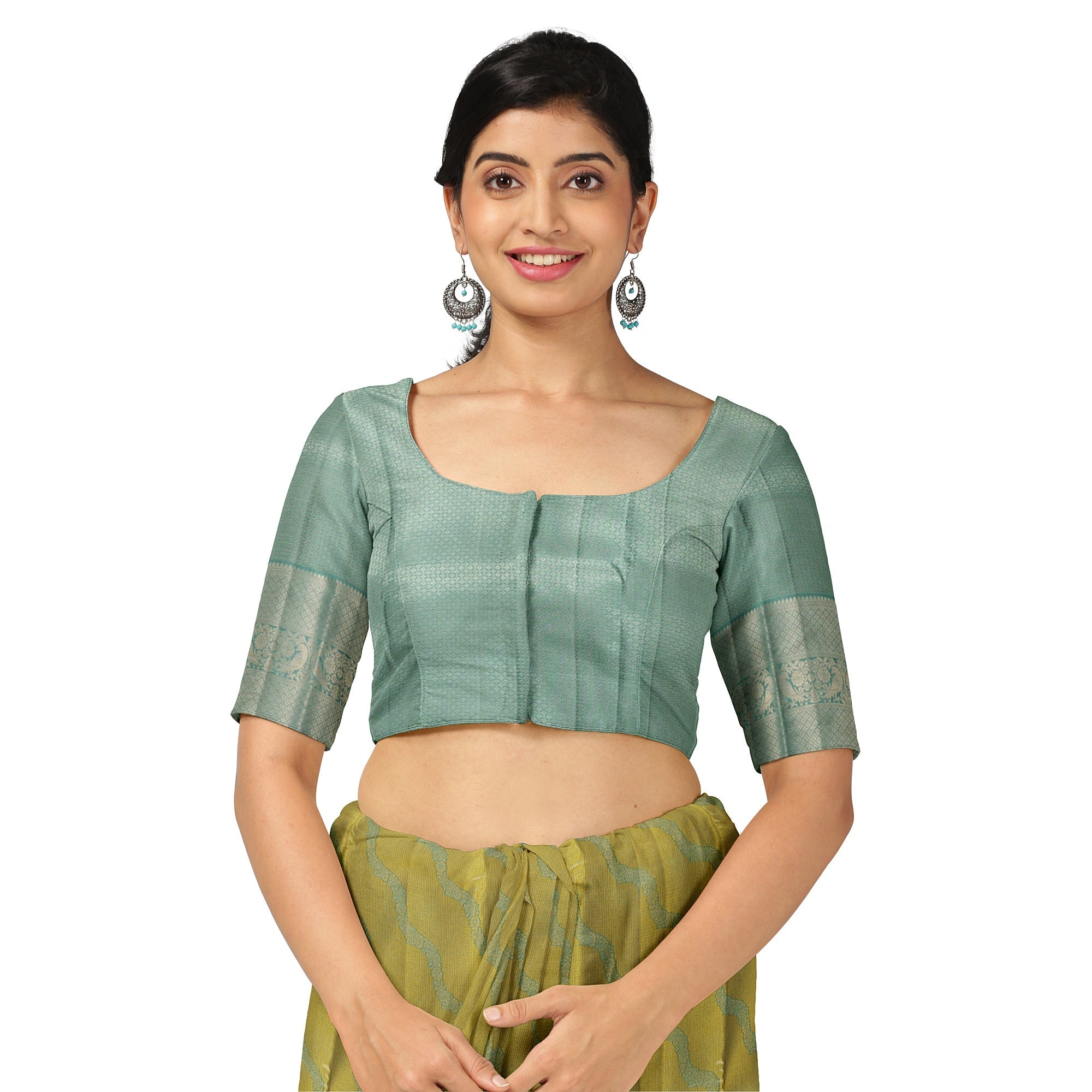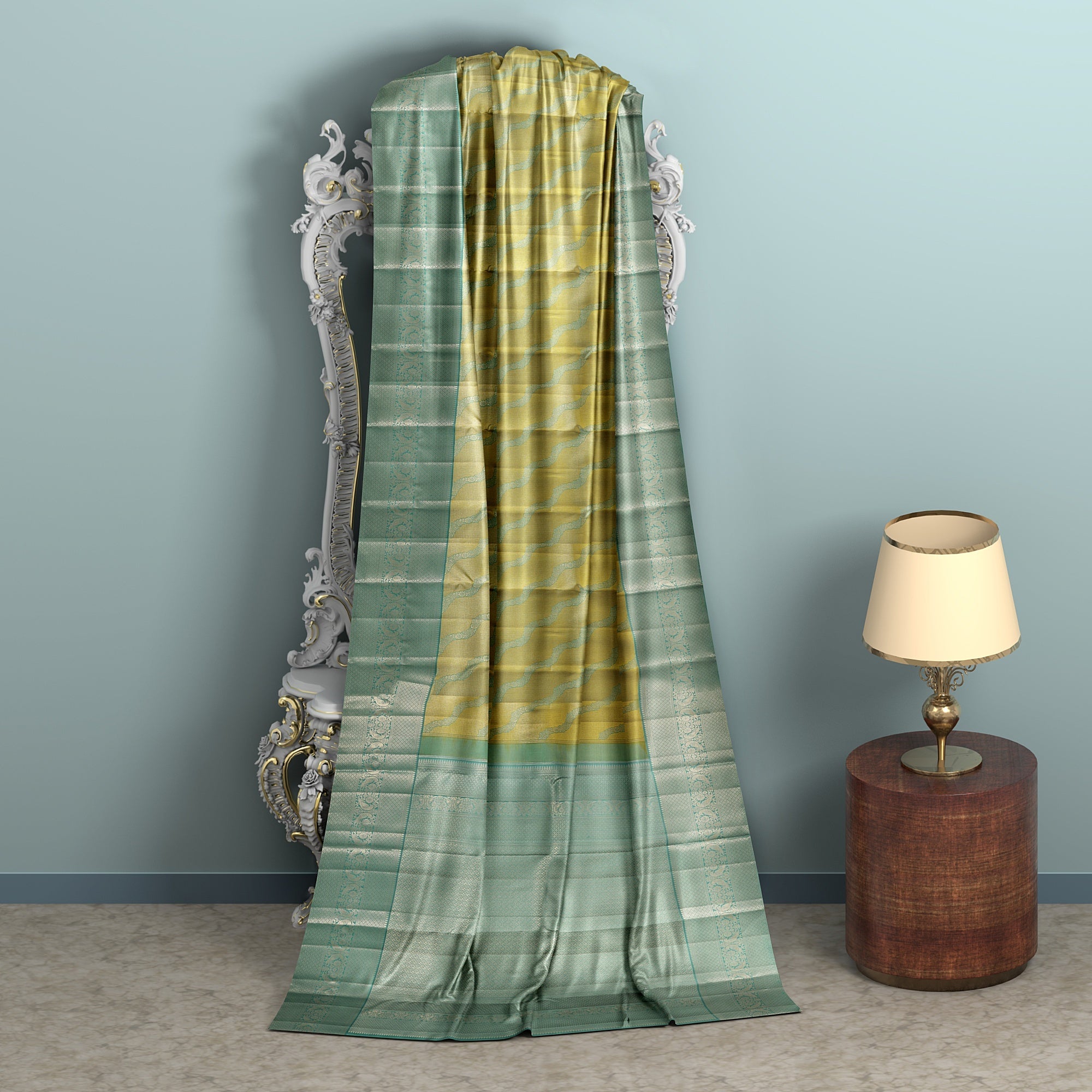 قاعدة باللون الأخضر النعناعي مع حدود زاري مزخرفة تضيف تناغمًا بصريًا.