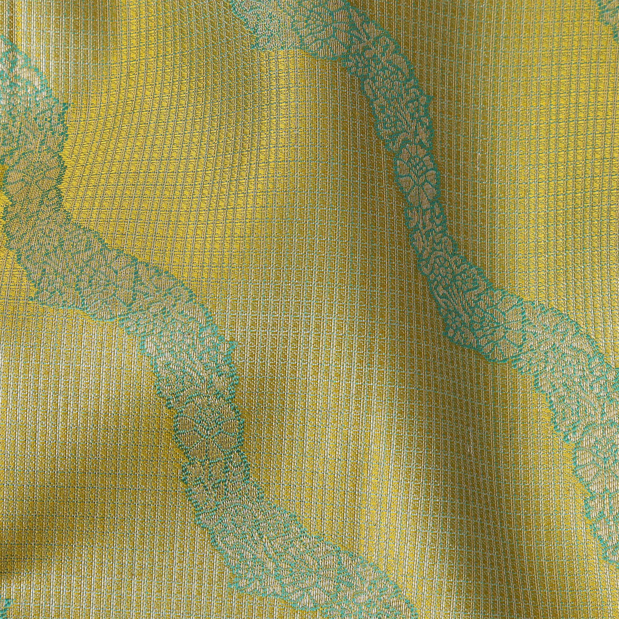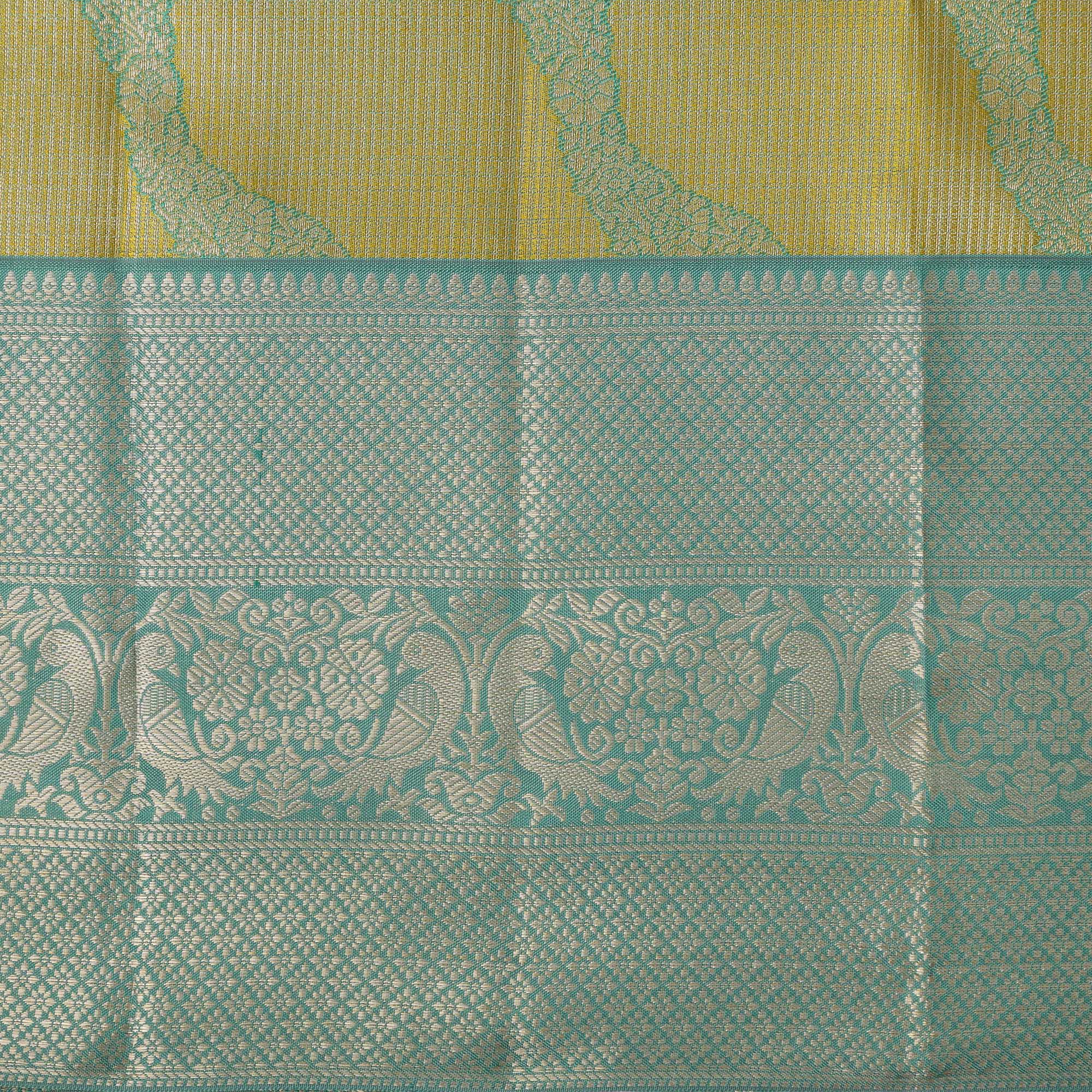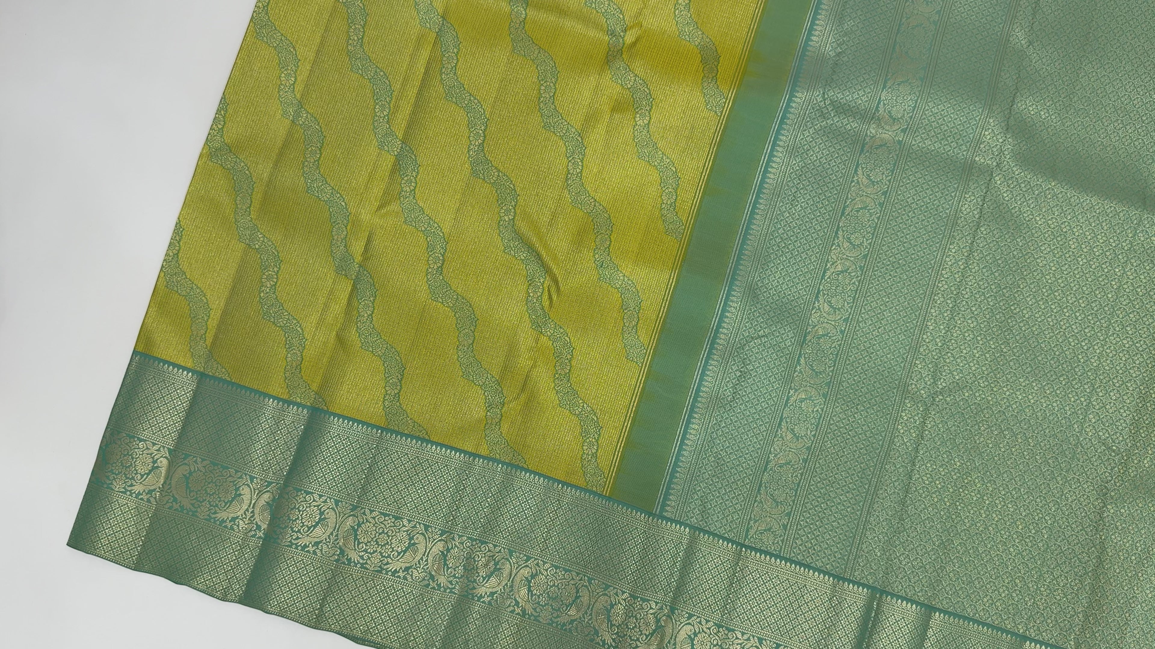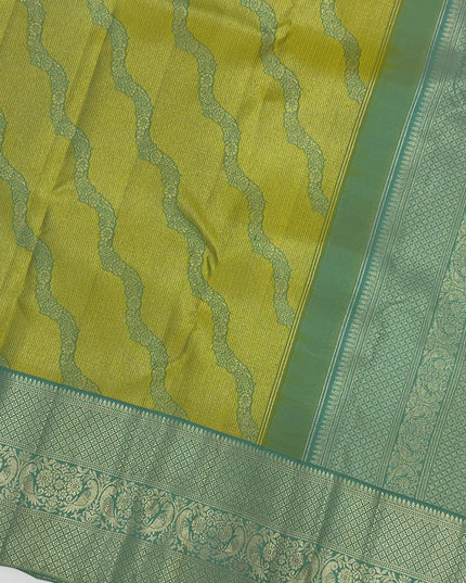 ساري كانجيفارام من الحرير الخالص باللونين الأخضر النعناعي والأصفر، بنمط موجة منسوج يدويًا وحواف زاري مزخرفة، بطول 5.5 متر مع قطعة بلوزة، من أصل هندي - D22714