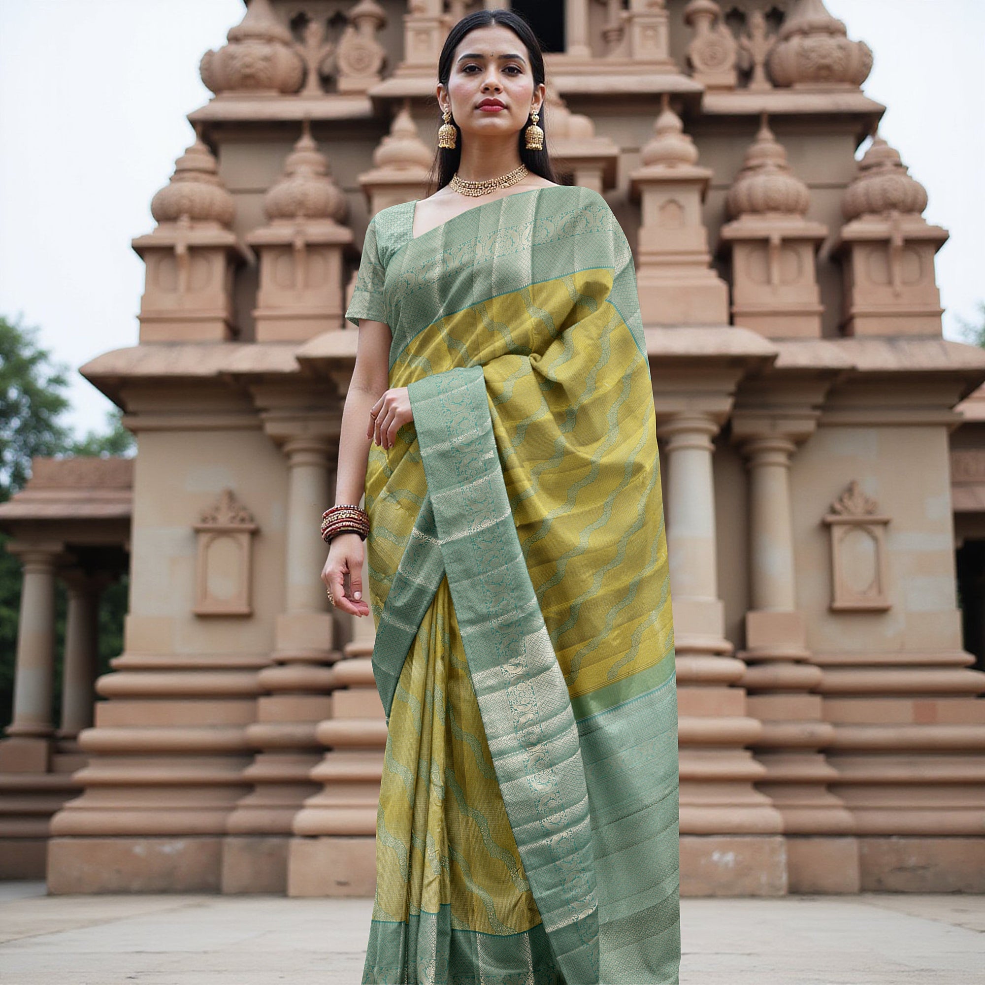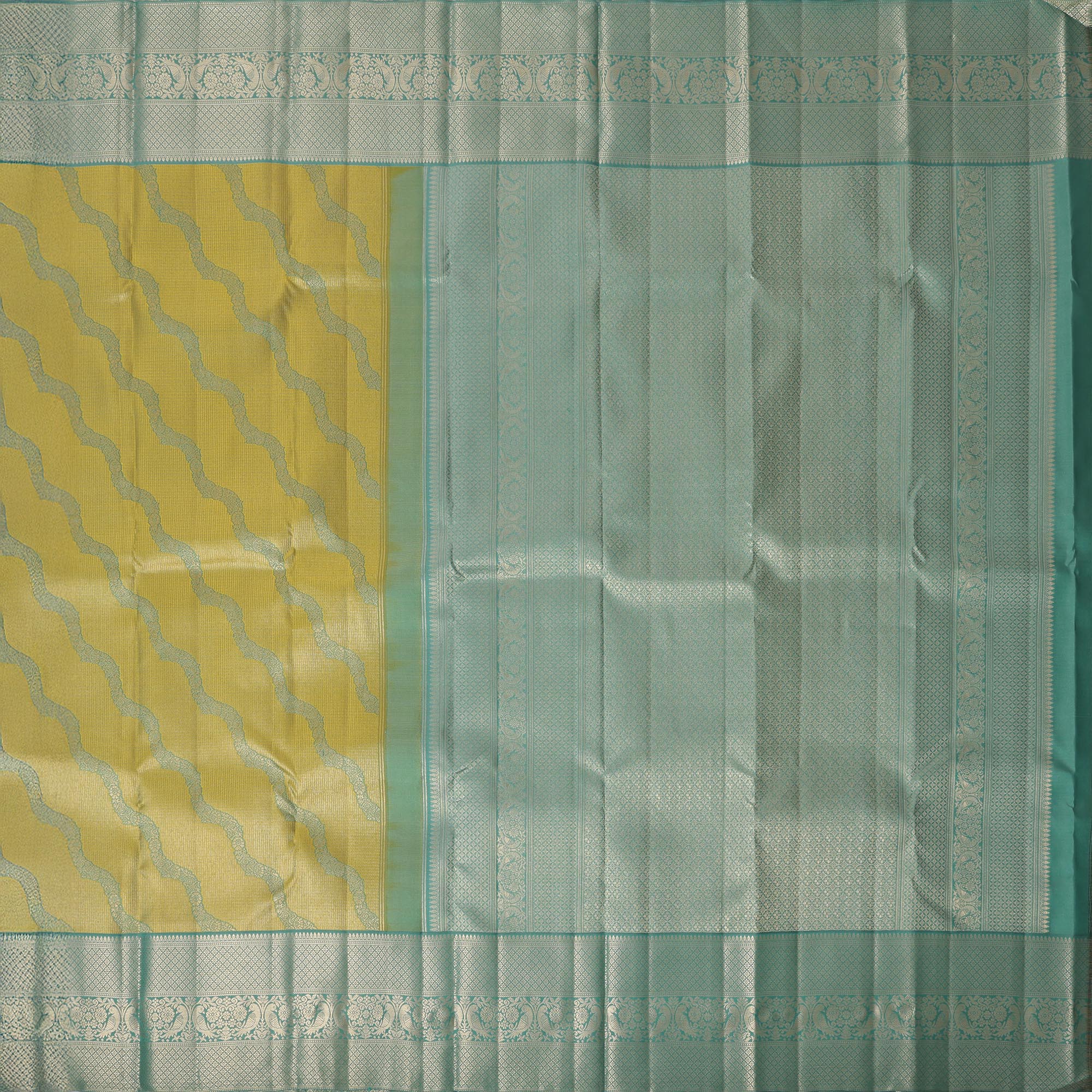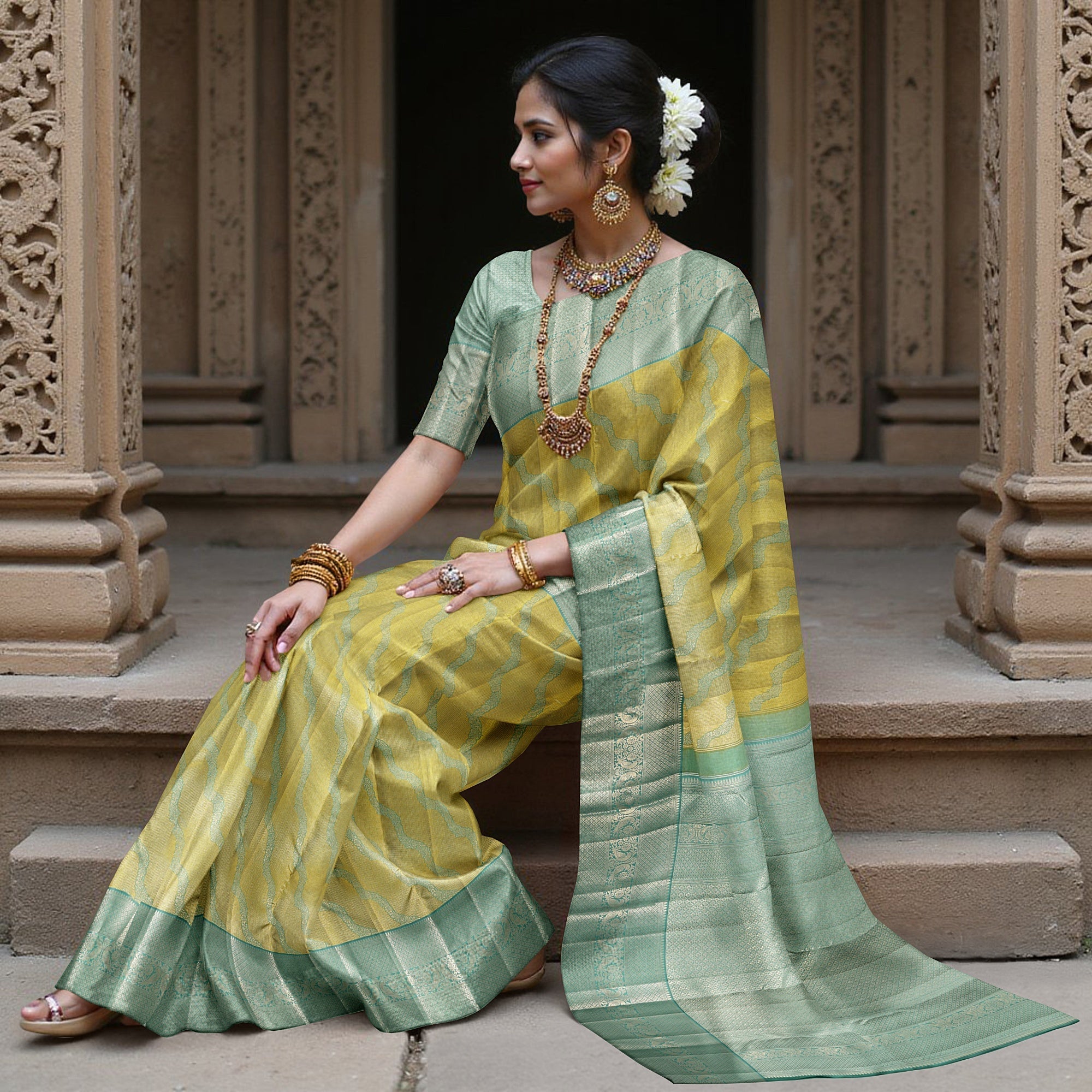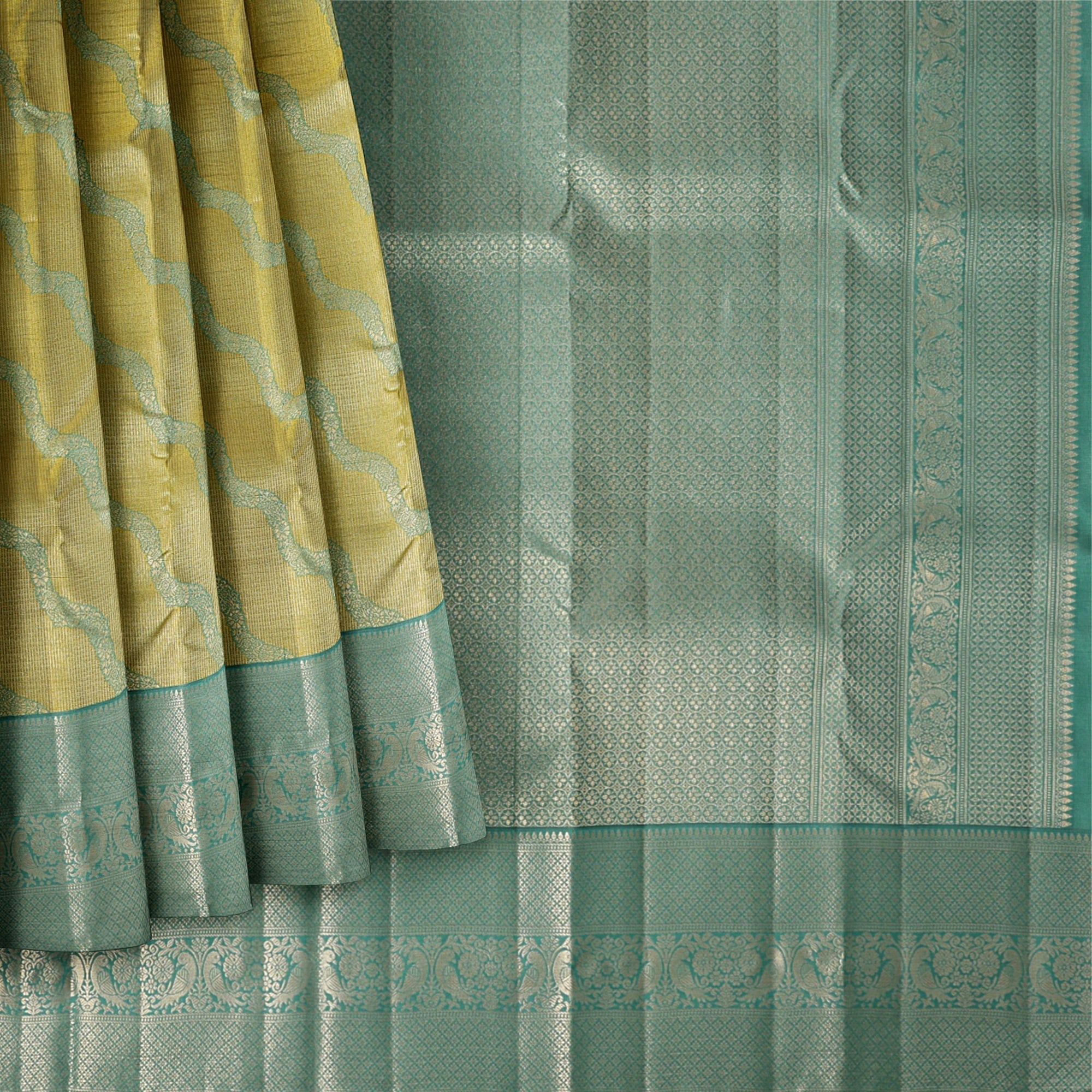 ساري كانجيفارام من الحرير الخالص باللونين الأخضر النعناعي والأصفر، بنمط موجة منسوج يدويًا وحواف زاري مزخرفة، بطول 5.5 متر مع قطعة بلوزة، من أصل هندي - D22714