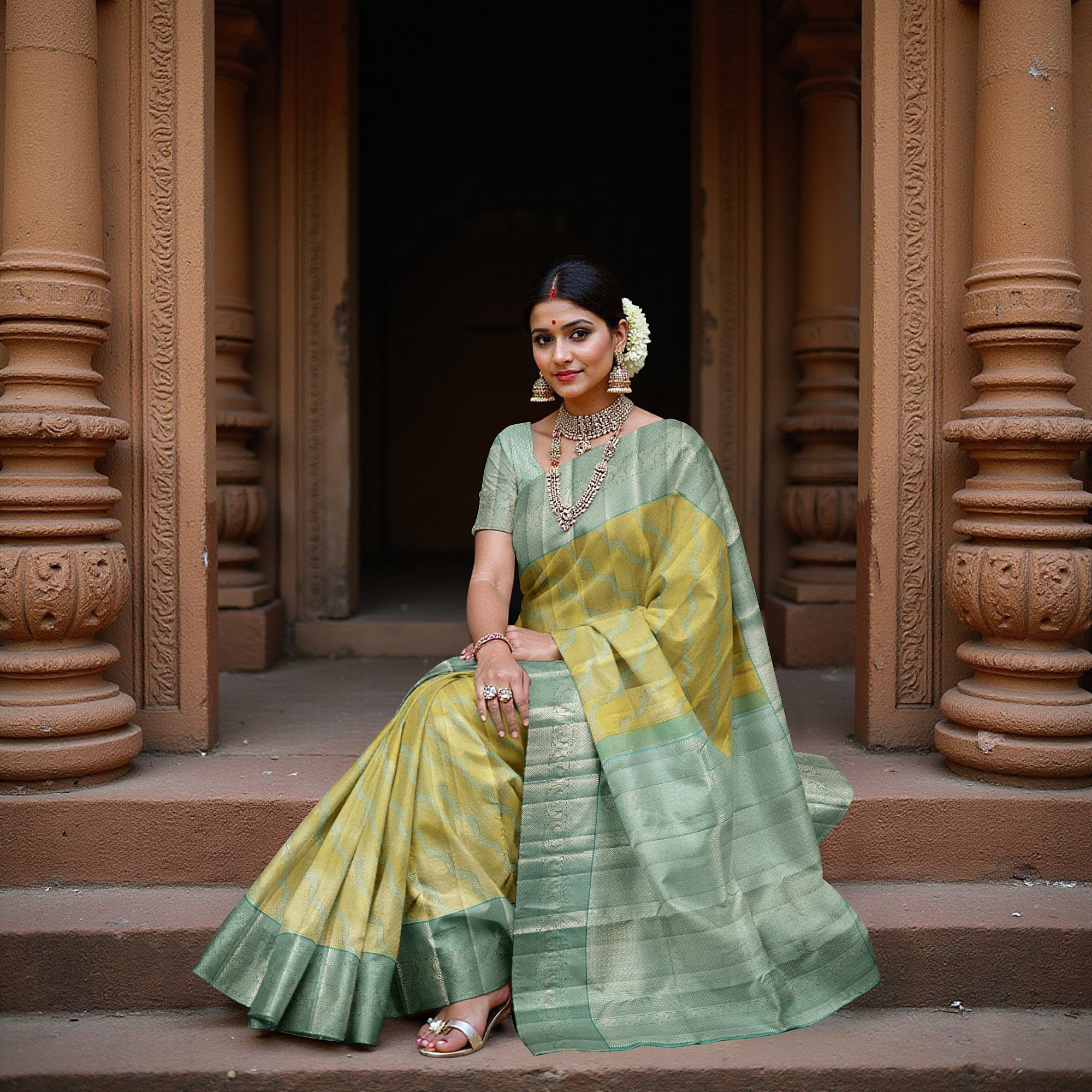 ساري كانجيفارام الحريري الخالص باللونين الأخضر النعناعي والأصفر هو عرض مشع لإتقان النسيج اليدوي، يمزج بين التقاليد والأناقة الهادئة. منسوج من أجود أنواع حرير ريجال فابريكس، يتميز الجسم بلوحة صفراء مضيئة مزينة بنمط موجة لطيف يستحضر التدفق الإيقاعي لفن المعابد الكلاسيكية في جنوب الهند. محاط بقاعدة خضراء نعناعية مع تفاصيل زاري غنية، هذا الساري هو توازن متناغم بين النعومة والرقي. يستغرق الأمر 48 ساعة من الحرفية اليدوية المخصصة من قبل النساجين المهرة لإضفاء الحيوية على كل قطعة، مع كل زخارف تعكس الصبر والدقة والتقاليد. مثالي لحفلات الزفاف والمناسبات الاحتفالية أو احتفالات المعابد، يضيف هذا الساري لمسة منعشة إلى خزانة ملابسك العرقية. تسوق عبر الإنترنت لامتلاك قطعة من تراث النسيج الهندي التي تم إحياؤها بنعمة الباستيل. يُنظف جافًا فقط للحفاظ على ملمسه الحريري ونسجه المعقد.